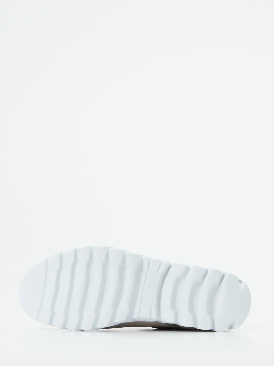 Durch die Kombination aus sandfarbenem Veloursleder und strukturiertem Mesh entsteht ein harmonischer Look mit pastelligem Farbspiel in Beige, Salbeigrün und Gelb. Die sportlich-voluminöse Silhouette wird von weißen Schnürsenkeln sowie einem silberfarbenen Reißverschluss abgerundet. Die weiß profilierte Gummisohle bietet gute Traktion und Dämpfung für lange Tage, während das Leder-/Textilfutter und das ergonomische Wechselfußbett für angenehmen Komfort sorgen. Streetwear-inspiriert, liegt der Sneaker voll im Trend der pastellfarbenen Frühjahr/Sommer-Mode.