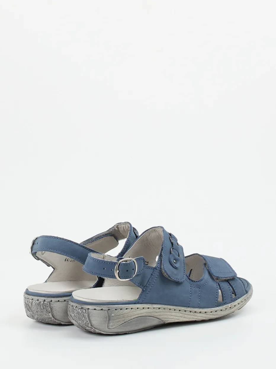 Ideal für aktive Sommertage.Waldläufer präsentiert eine moderne Komfortsandale für Damen. Das weiche Nubukleder mit samtiger Haptik in Jeansblau und das dezente Finish mit Ton-in-Ton-Nähten sorgen für einen zurückhaltend-edlen Look. Die offene Form mit Fersenriemen sowie die Kombination aus Klettverschluss und Metallschnalle erlauben eine individuelle Anpassung. Die gepolsterte Gummisohle mit strukturierter Profilierung steht für ergonomische Unterstützung – auch mit eigenen Einlagen tragbar. Passend zur Casualwear und dem „Quiet Comfort“-Trend der Saison. Ergonomisch durchdacht, stilvoll umgesetzt – Komfort à la Waldläufer.