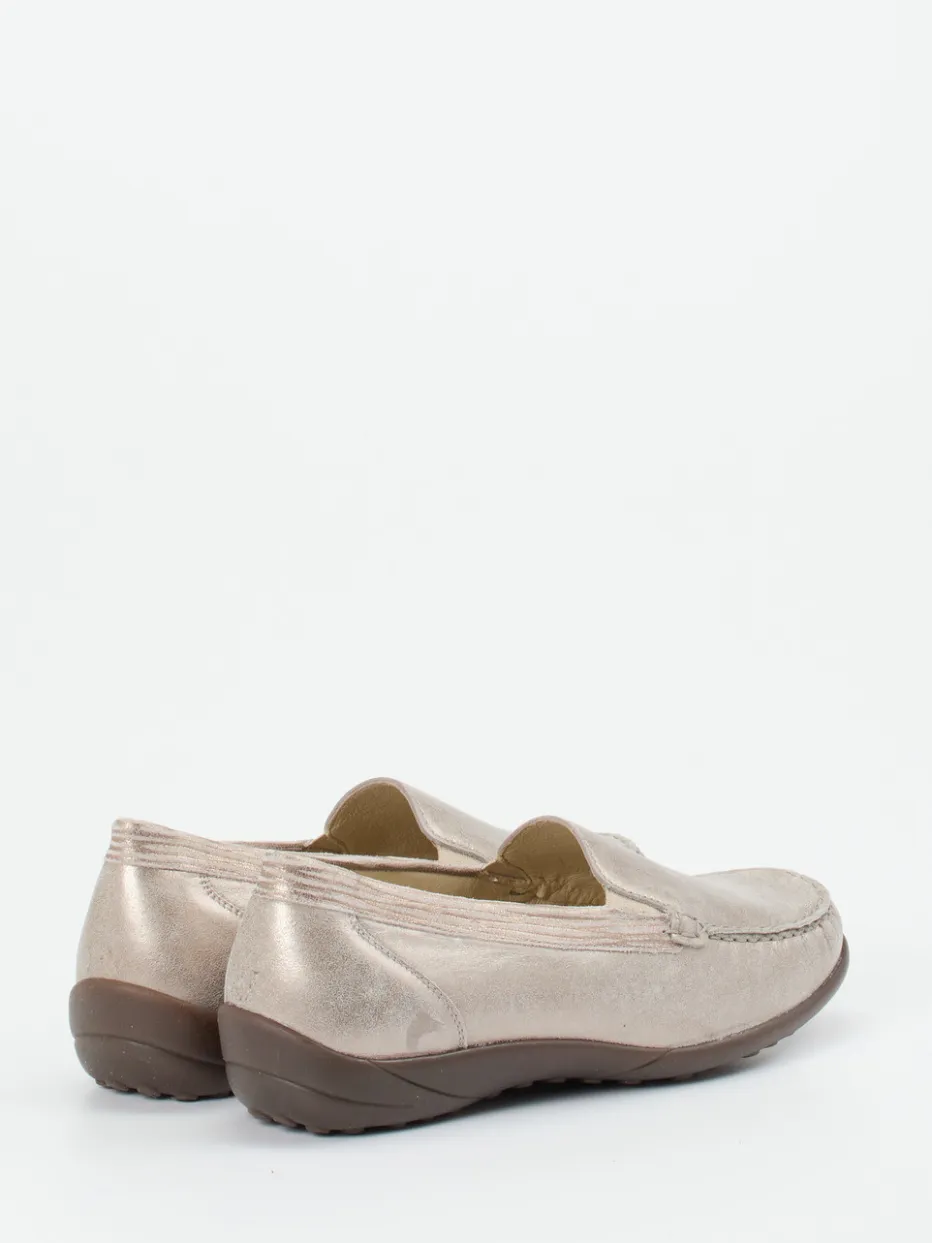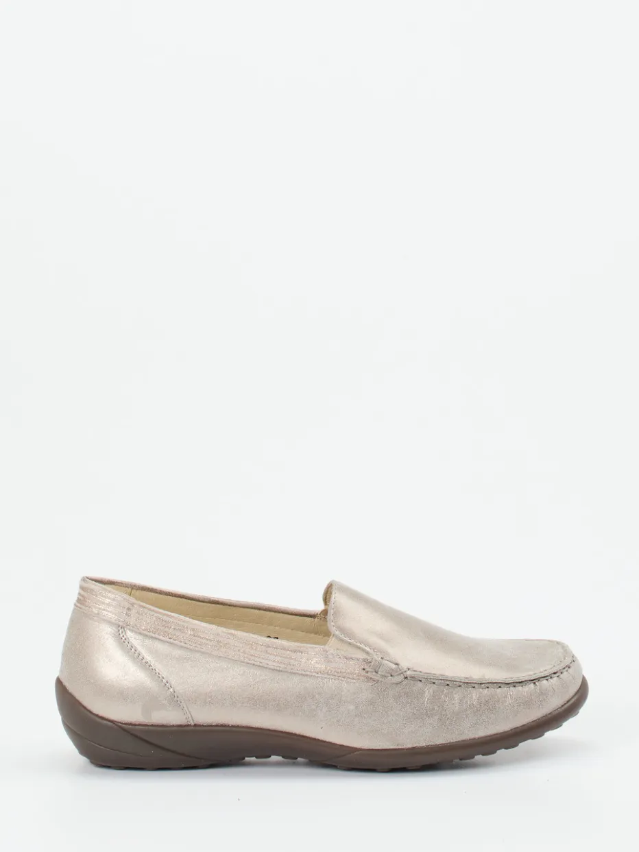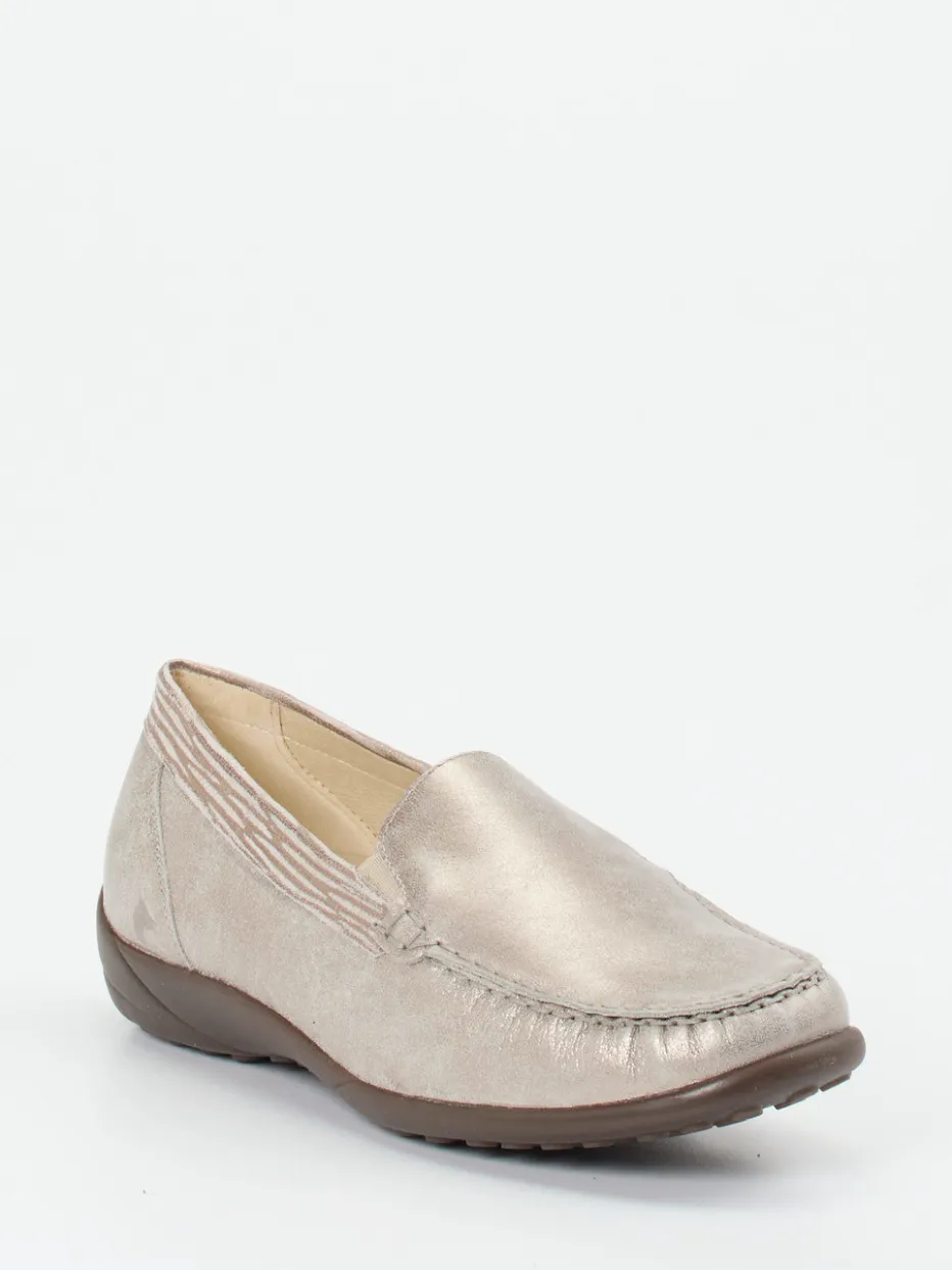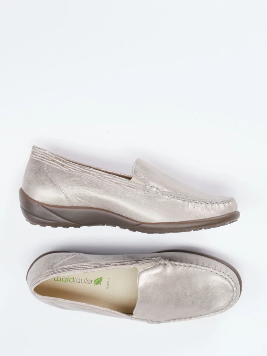 Bequem durch den Tag mit dezentem Glanz.Waldläufer bietet mit diesem Komfortslipper für Damen ein Modell, das elegantes Design mit funktionaler Alltagstauglichkeit verbindet. Für komfortbewusste Tage im Büro oder beim Stadtbummel bietet das handschuhweiche Metallicleder in Champagnerbeige einen edlen Glanz und zugleich angenehme Flexibilität. Die flache Silhouette wird durch tonige Ziernähte und subtile Metallic-Effekte stilvoll ergänzt. Dank Elastikeinsätzen an den Seiten ist das An- und Ausziehen mühelos. Die rutschhemmende Gummisohle sowie die Weite K mit schmaler Ferse sorgen für optimalen Halt und Tragekomfort, auch mit losen Einlagen. Durch das dezente Farbspiel besonders gut zu Naturtönen kombinierbar. Waldläufer steht für funktionalen Komfort mit stilsicherem Understatement.