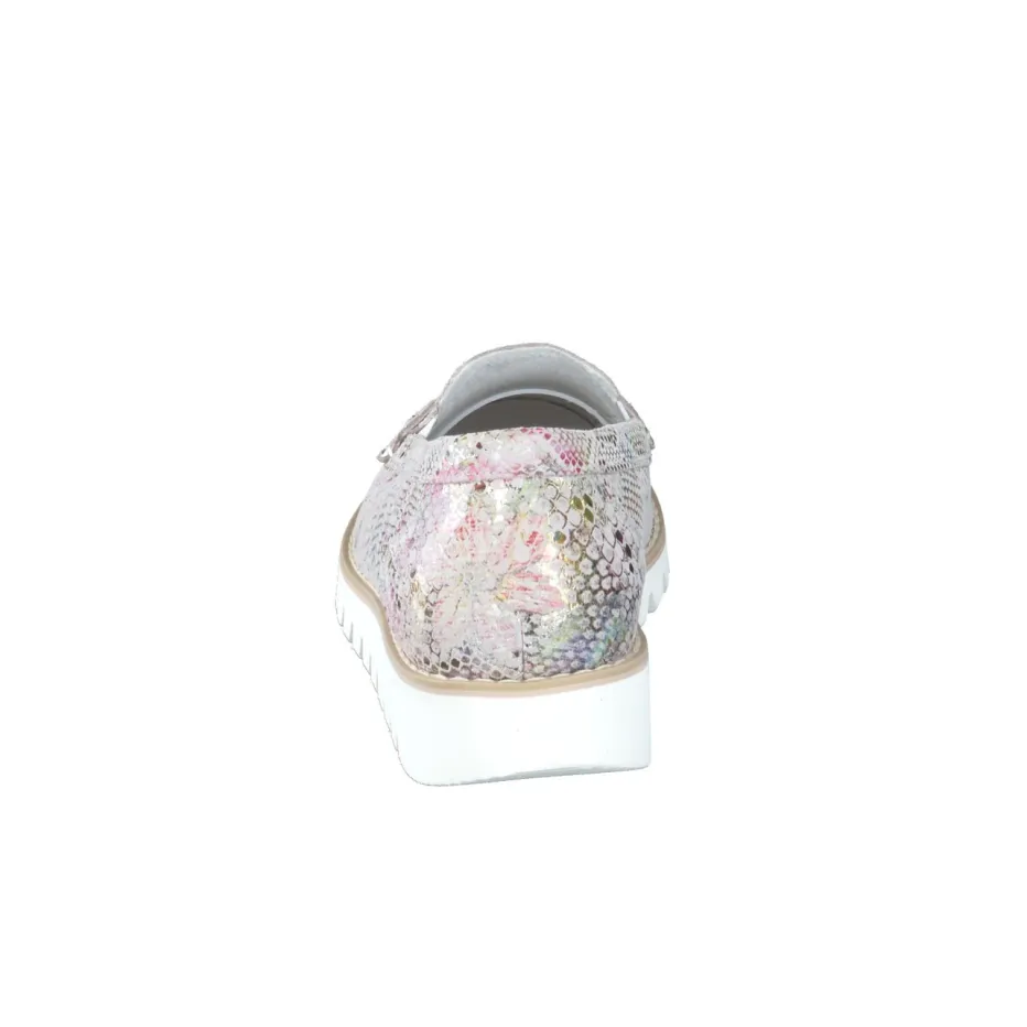 Schimmer trifft Komfort – feminin interpretiert.Waldläufer präsentiert einen eleganten Loafer für Damen aus geprägtem Leder. Ideal für Büro oder Stadtbummel: Der Schlupfschuh in schimmerndem Multicolor kombiniert eine strukturierte Schlangenprägung mit glänzendem Metallic-Finish in sanften Pastelltönen wie Rosé und Perlmutt-Beige. Die klassische, flache Silhouette wird durch eine auffällige Zierspange vorn ergänzt. Die leichte Porosohle mit kräftigem Profil bietet in Kombination mit der komfortablen Weite H zuverlässigen Halt. Inspirierend durch minimalistische Vintage-Einflüsse. Modischer Tragekomfort mit der typischen Waldläufer-Leichtigkeit.