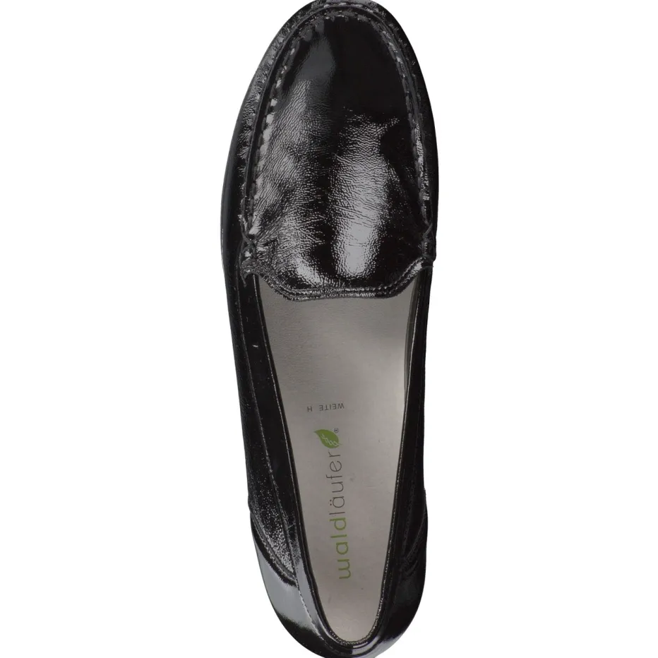 Bequem und glänzend: Klassiker neu gedacht.Waldläufer erweitert seine Kollektion um einen stilvollen Damen-Loafer für Alltag und Büro. Der Loafer überzeugt mit schwarzem Softlackleder, das samtig glänzt und durch dezente Mokassin-Nähte betont wird. Die klassische Silhouette mit flachem Absatz ergänzt sich ideal mit der flexiblen Gummisohle und der komfortablen H-Weite. Ein individuell austauschbares, lederbezogenes Fußbett sorgt für zusätzlichen Komfort. Das puristische Design folgt den Trends „Quiet Luxury“ und „Return of Comfort“. Kombinierbar mit eleganten Stoffhosen oder femininen Business-Looks. Markentypisch pflegeleicht und auf nachhaltige Alltagstauglichkeit ausgelegt.