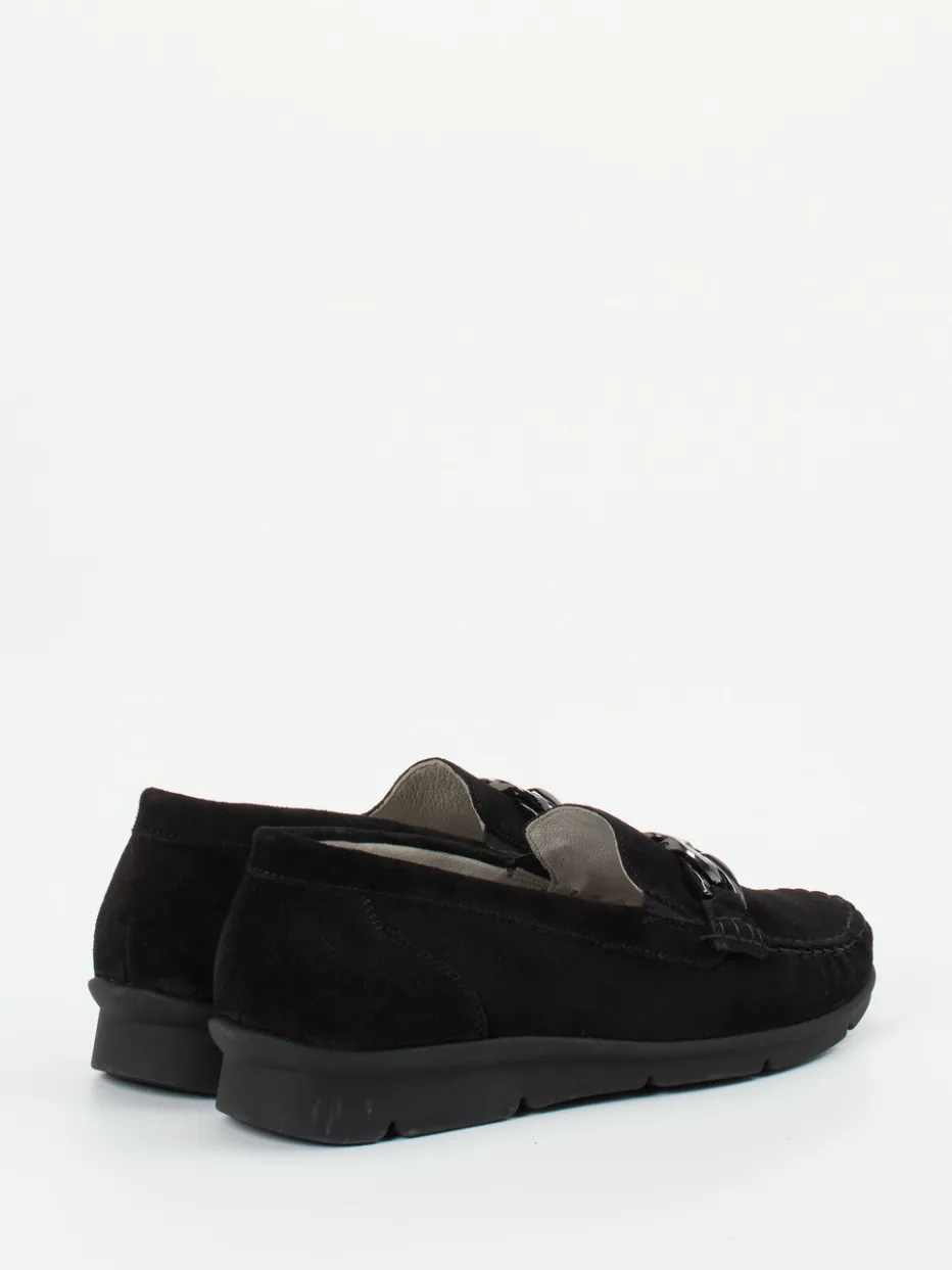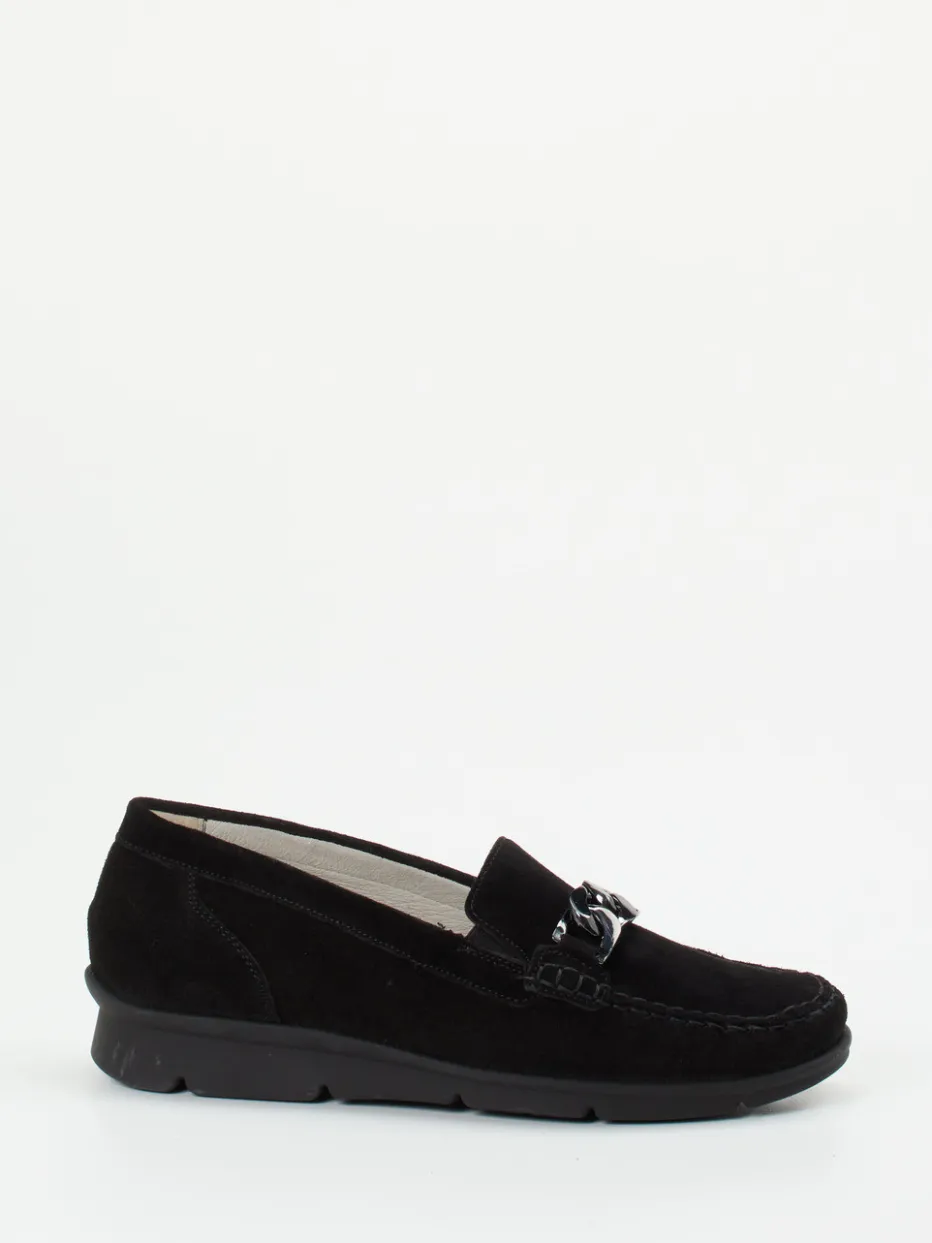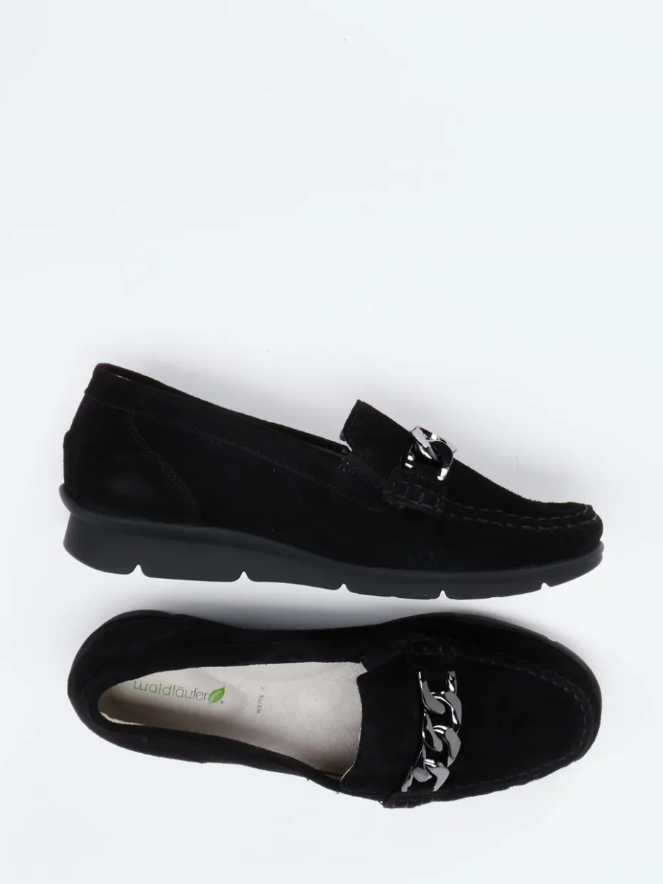 Schwarz trifft auf Komfortkompetenz.Waldläufer präsentiert diesen Damen-Loafer in klassischer Inga-Form und markentypischer Wohlfühlweite K. Für Büro und Alltag geeignet, überzeugt das Modell durch besonders weiches Veloursleder mit samtig-matter Oberfläche. Die elegante Zierspange in Silber unterstreicht den minimalistischen Chic. Innen sorgt ein herausnehmbares, anatomisches Fußbett für individuellen Komfort, außen federt eine luftgepolsterte, profilierte Gummisohle jeden Schritt bequem ab. Der Slip-on-Aufbau erlaubt schnelles Anziehen, auch dank seitlicher Elasteinsätze. Die dezente Formsprache, gepaart mit edlem Material, greift den „Soft Loafer“-Trend stilvoll auf und ergänzt gepflegte Hosen-Outfits oder schmale Röcke ideal. Premiumkomfort in zeitloser Verarbeitung – mit Waldläufer auf dem Punkt gebracht.