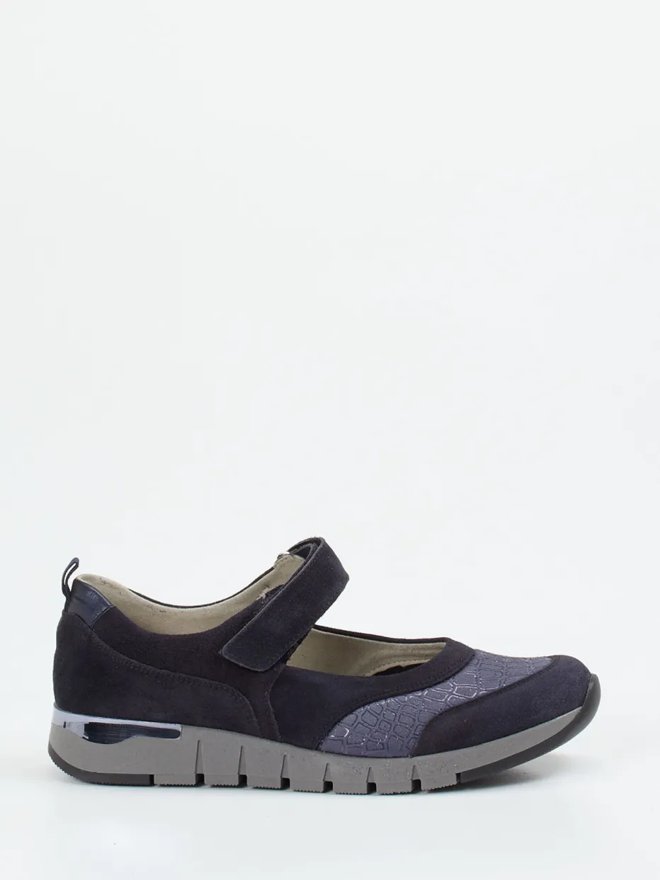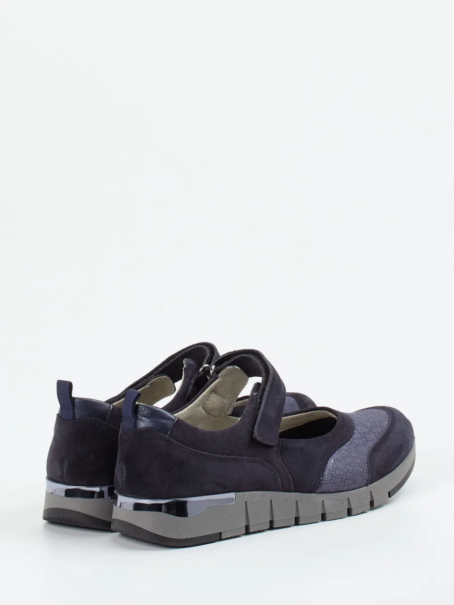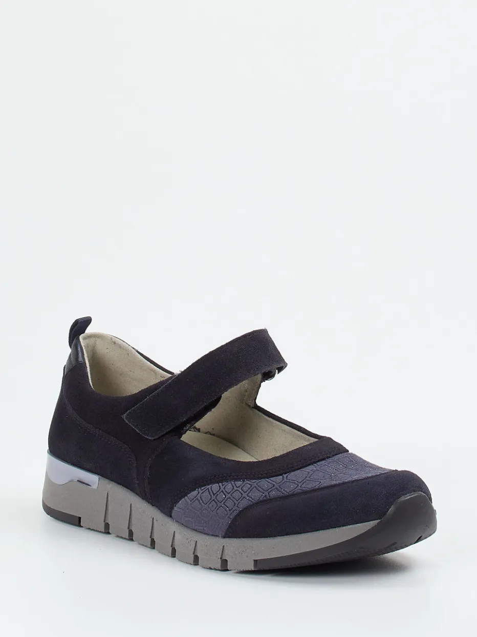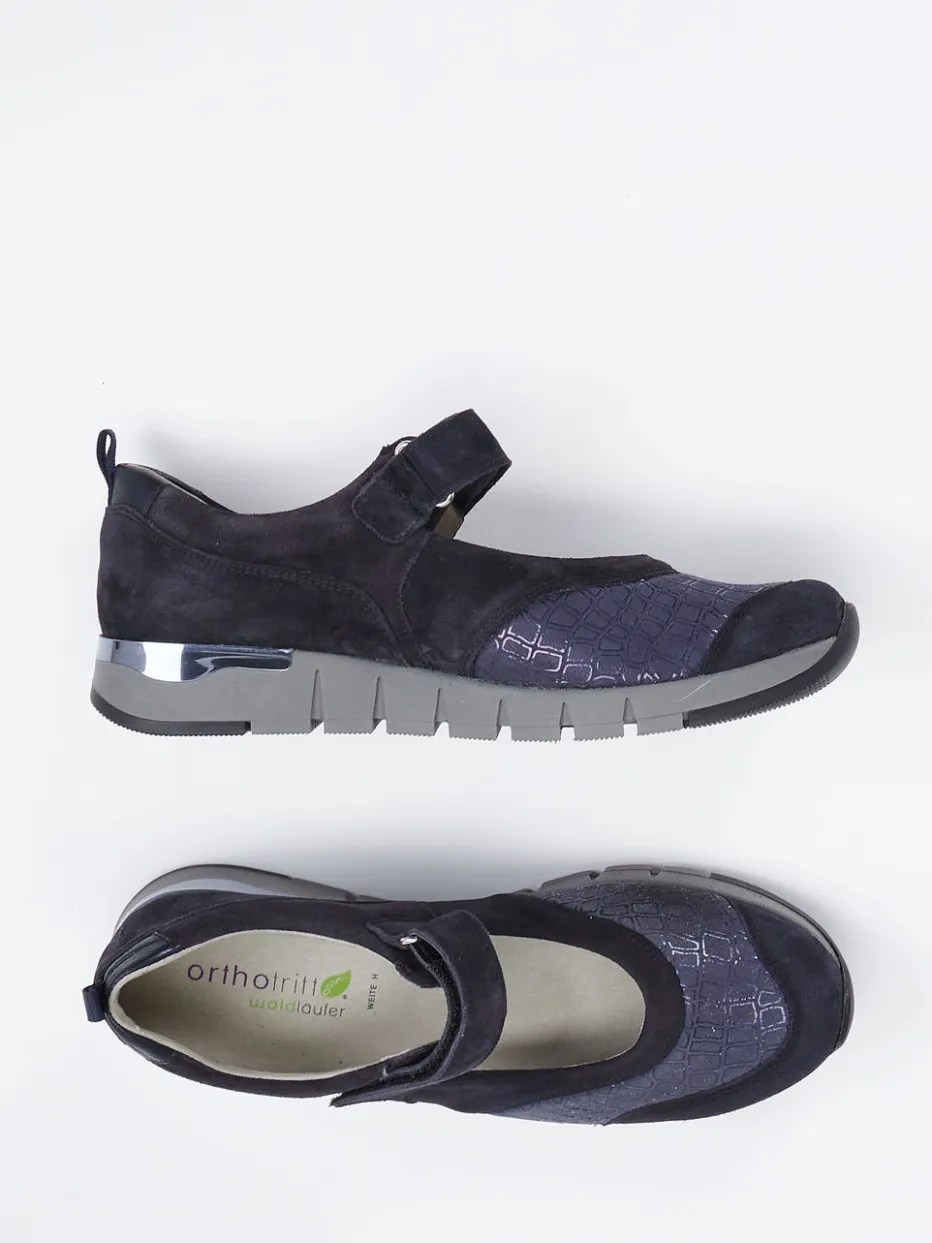 Struktur trifft Komfort.Die Marke Waldläufer präsentiert einen sportlichen Halbschuh für Damen mit formstabiler Passform. Ideal für lange Spaziergänge oder entspannte City-Tage: Das Modell aus dunkelblauem Veloursleder überzeugt durch eine samtige Oberfläche mit Krokoprägung und einen praktischen Klettverschluss am Spann. Die rund geformte Silhouette mit grauer Gummisohle sorgt für angenehme Weite (H) und ein ergonomisches Laufgefühl. Eine metallicfarbene Applikation an der Ferse setzt einen dezenten Akzent. Stilistisch bewegt sich der Spangenschuh im „Quiet Comfort“-Trend mit sportlich-pflegeleichter Anmutung. Besonders gut kombinierbar zu Casualwear in gedeckten Tönen. Orthopädisch inspiriert für spürbar mehr Gehkomfort im Alltag.