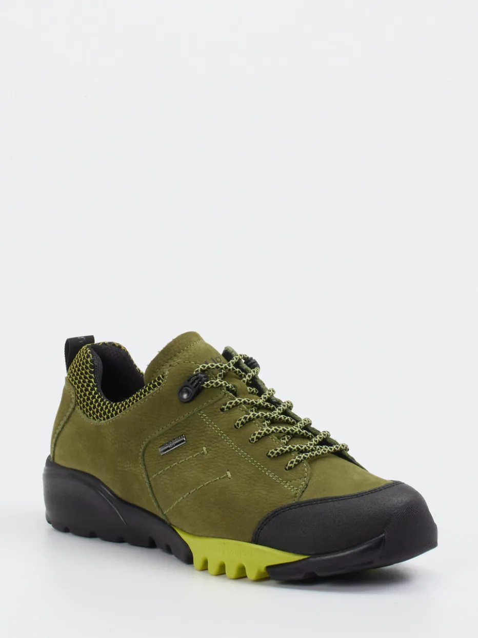 Wandertauglicher Stil trifft Funktion.Waldläufer präsentiert einen schnürbaren Outdoor-Sneaker für aktive Tage im Freien. Ideal für spontane Trails oder längere Spaziergänge: Der Schuh besteht aus wind- und wasserdichtem Material mit samtig angeschliffenem Veloursleder und atmungsaktiven Mesh-Partien. In markantem Olivgrün mit neongrünen Akzenten verbindet er sportliche Signalwirkung mit funktionaler Silhouette. Verstärkte Zehenkappe, zweifarbige Schnürsenkel und griffig profilierte Gummisohle runden das durchdachte Design ab. Perfekt kombinierbar mit Funktionswear im Utility-Stil. Maximaler Outdoor-Komfort und modisches Statement für jeden Schritt.