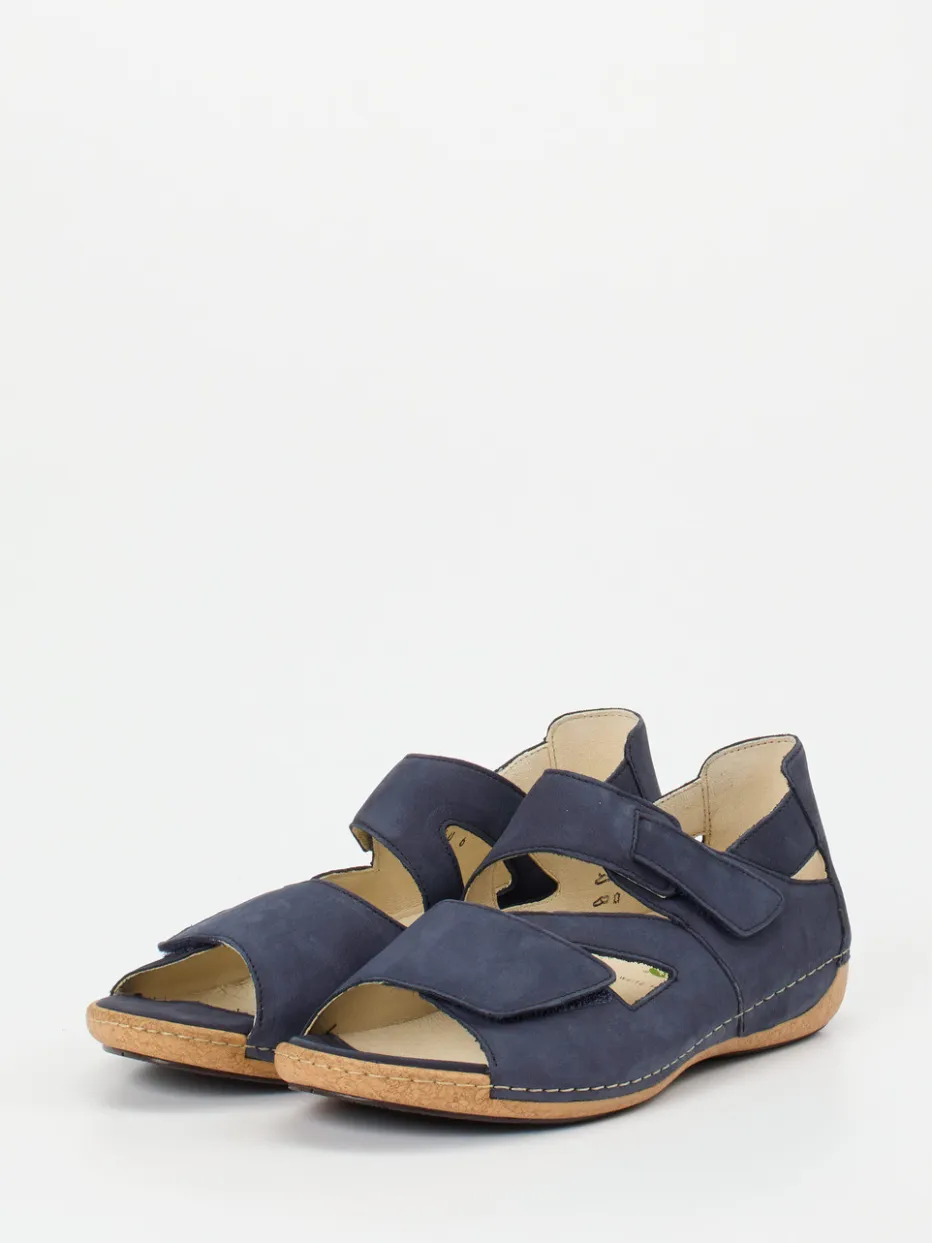 Komfort trifft modernes Design.Waldläufer präsentiert eine Damen-Komfortsandale mit durchdachtem Aufbau für entspanntes Gehen im Alltag. Die Kombination aus samtig angeschliffenem Nubukleder und atmungsaktiven Cut-outs vereint sommerliche Frische mit fester Passform. Der tiefe Navyton wird durch beige Kontrastnähte akzentuiert, während zwei Klettverschlüsse individuelle Anpassung ermöglichen. Eine ergonomisch geformte, herausnehmbare Einlegesohle rundet die gesundheitsbewusste Bauweise ab. Die flexible Gummisohle in Kork-Optik unterstützt das natürliche Abrollen. Inspiriert vom Minimalismus liegt dieses Modell auf Trendhöhe innerhalb der Comfort-Core-Linie. Bequeme Ausstattung in stimmigem Look – typisch Waldläufer.