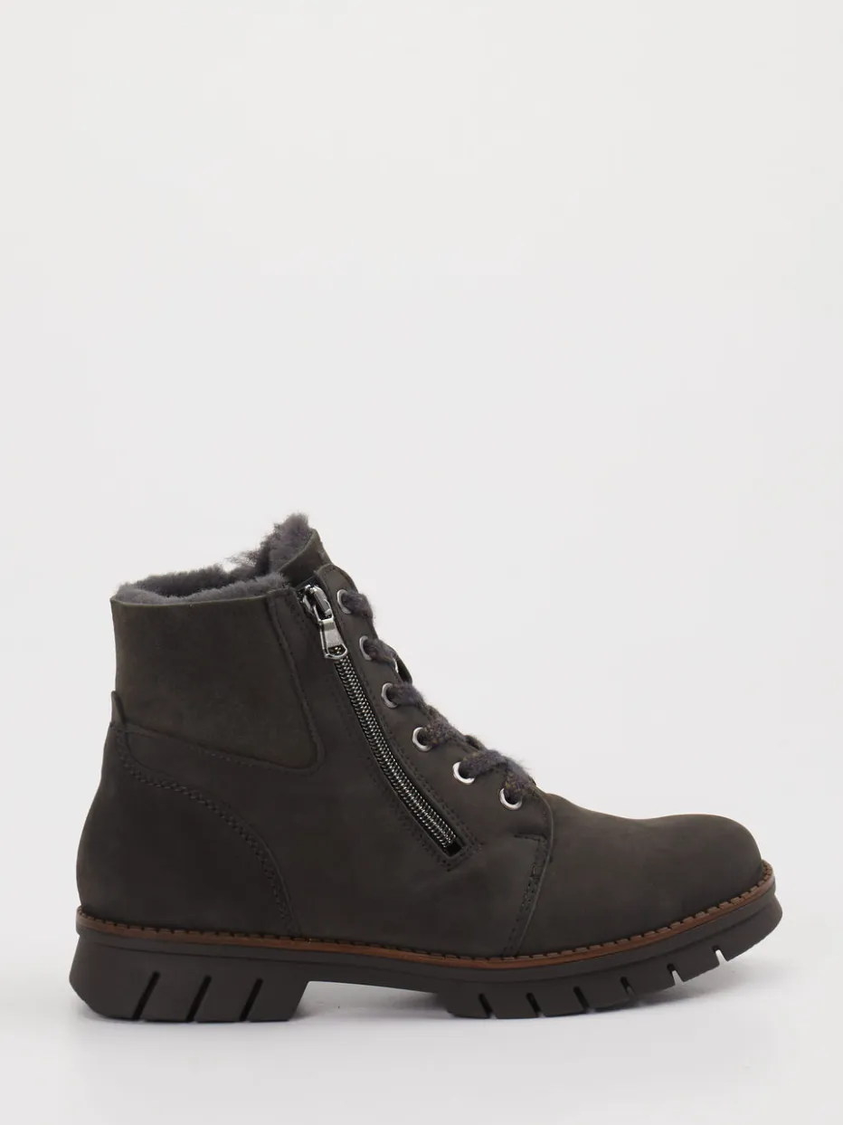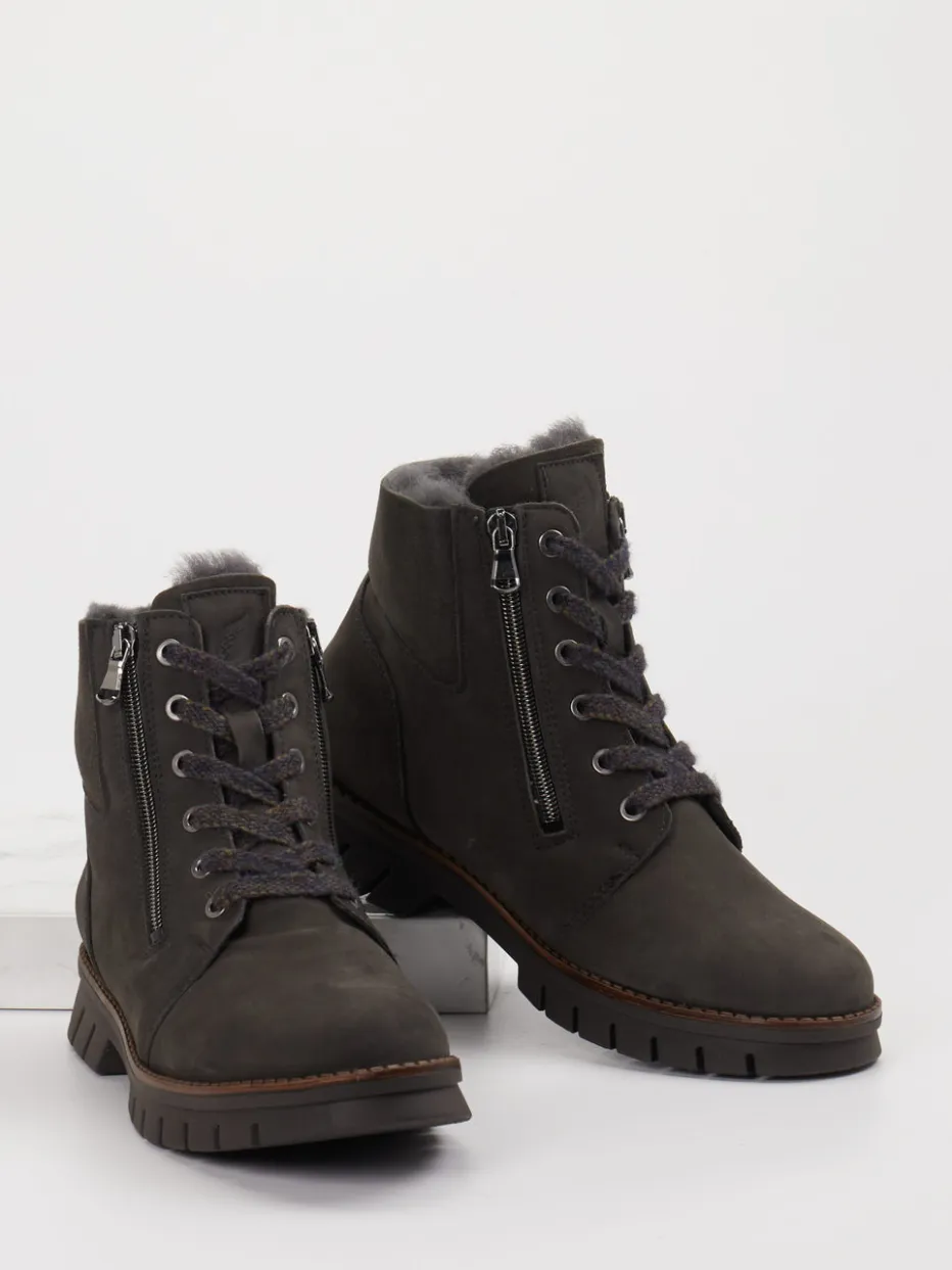 Robust und komfortabel durch kalte Tage. Waldläufer präsentiert diese Damen-Stiefeletten in einer schnürbaren Bootsform mit komfortabler Ausstattung. Das Modell ist aus Leder mit matter Oberfläche gefertigt und zeigt sich in dunklem Anthrazitgrau. Innen sorgt ein wärmendes Wollfutter für angenehmes Tragegefühl – perfekt für kühlere Herbst- und Wintertage. Die markante Profilgummisohle stützt bei Outdoor-Aktivitäten ebenso wie im urbanen Alltag. Reißverschluss und Schnürung sorgen für Komfort beim An- und Ausziehen. Der dezente Utility-Look mit funktionalen Details wie silbernen Ösen passt zu robusten Winteroutfits. Ein bequemer Winterboot mit verlässlicher Funktion und puristischem Design von Waldläufer.