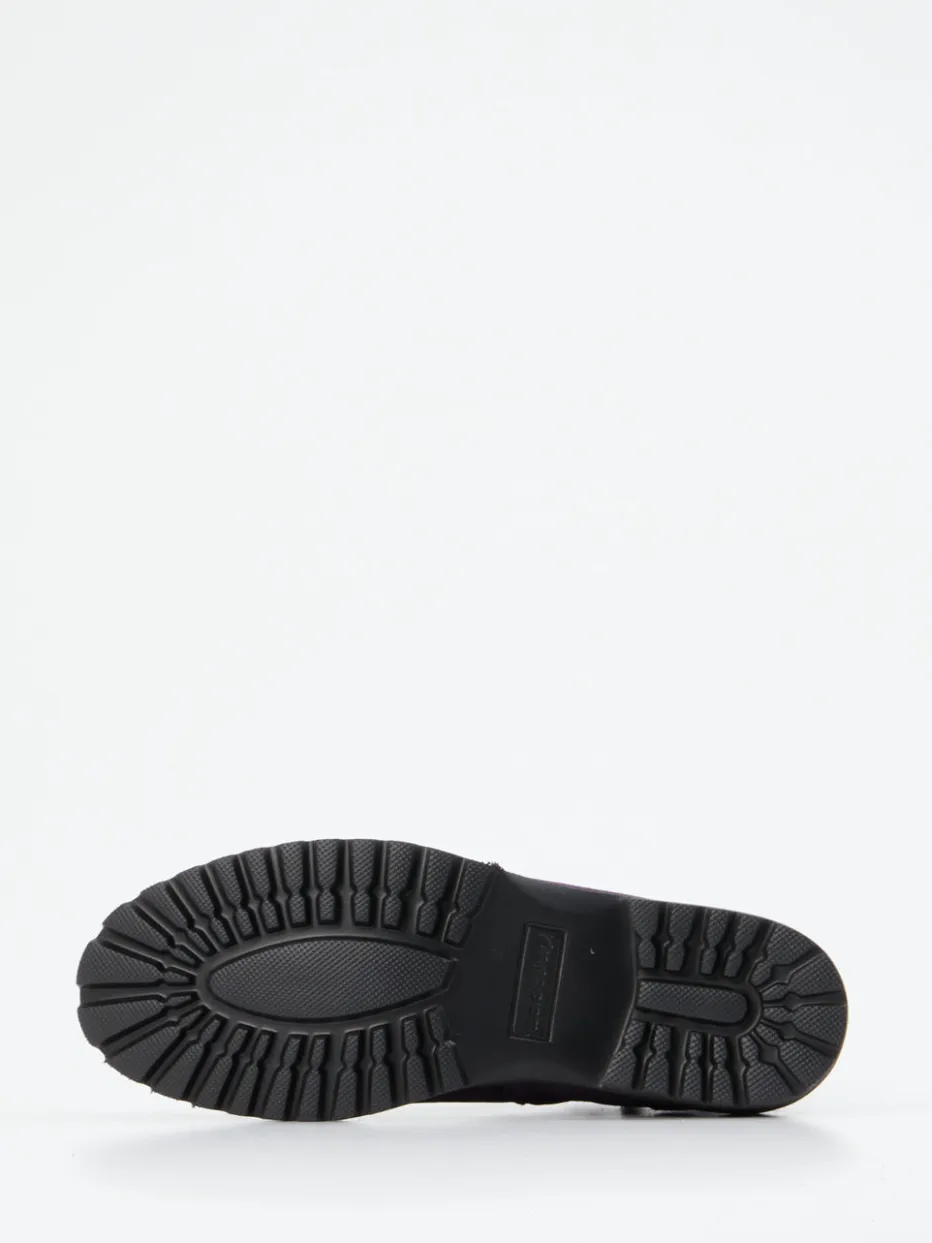 Der knöchelhohe Schaft aus Veloursleder, samtig angeschliffen, trifft auf eine griffige Gummisohle mit markantem Profil. Die intensive Pflaumenfarbe setzt ein saisonales Statement und harmoniert mit matten Ton-in-Ton-Nähten sowie schwarzen Schnürsenkeln. Reißverschluss und Schnürung sorgen gemeinsam für bequemen Einstieg und optimalen Halt. Der Utility-inspirierte Look greift aktuelle Streetwear- und Color-Trends auf und ergänzt casual Styles wie Strick oder Denim mühelos.
