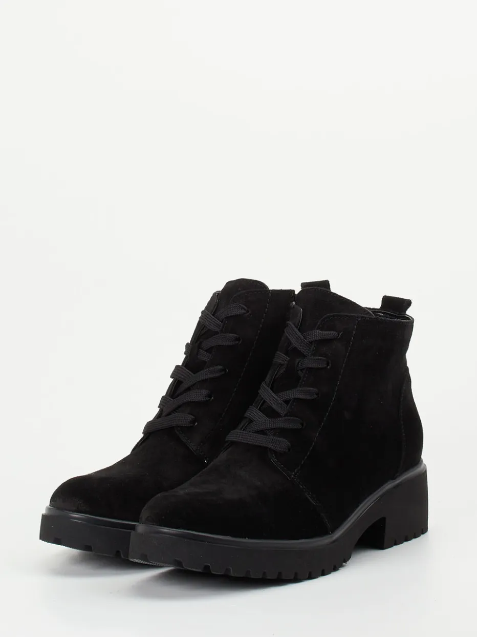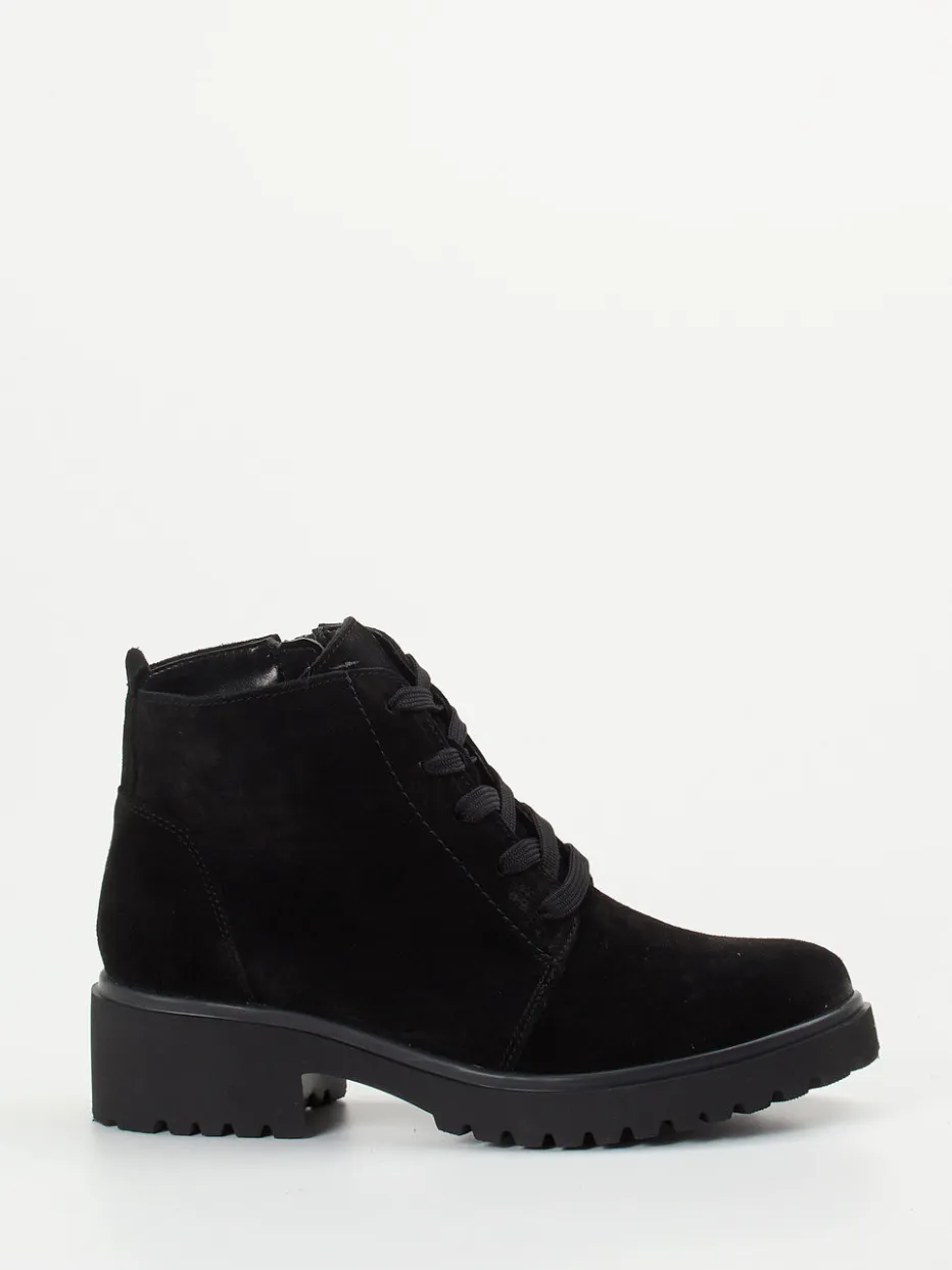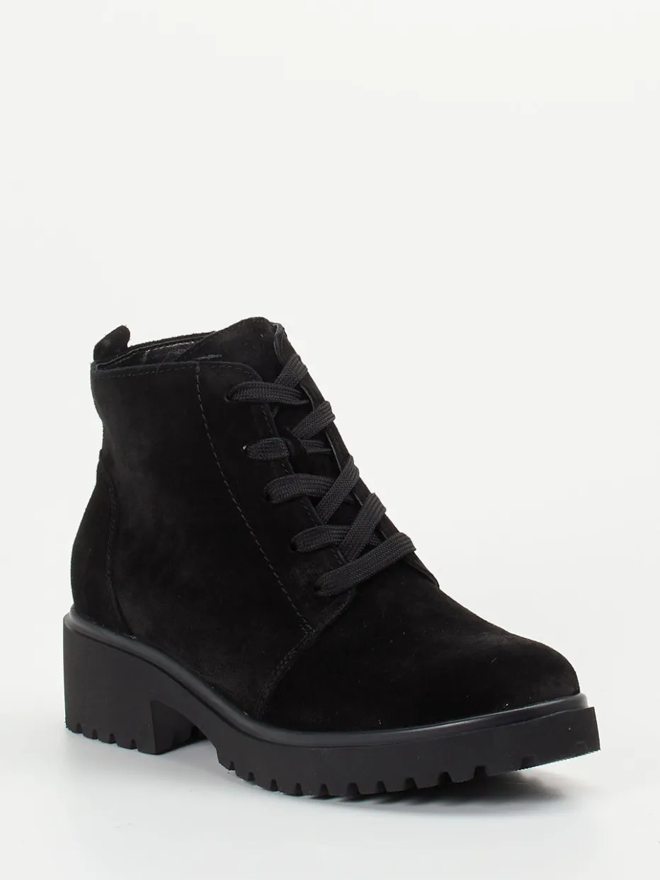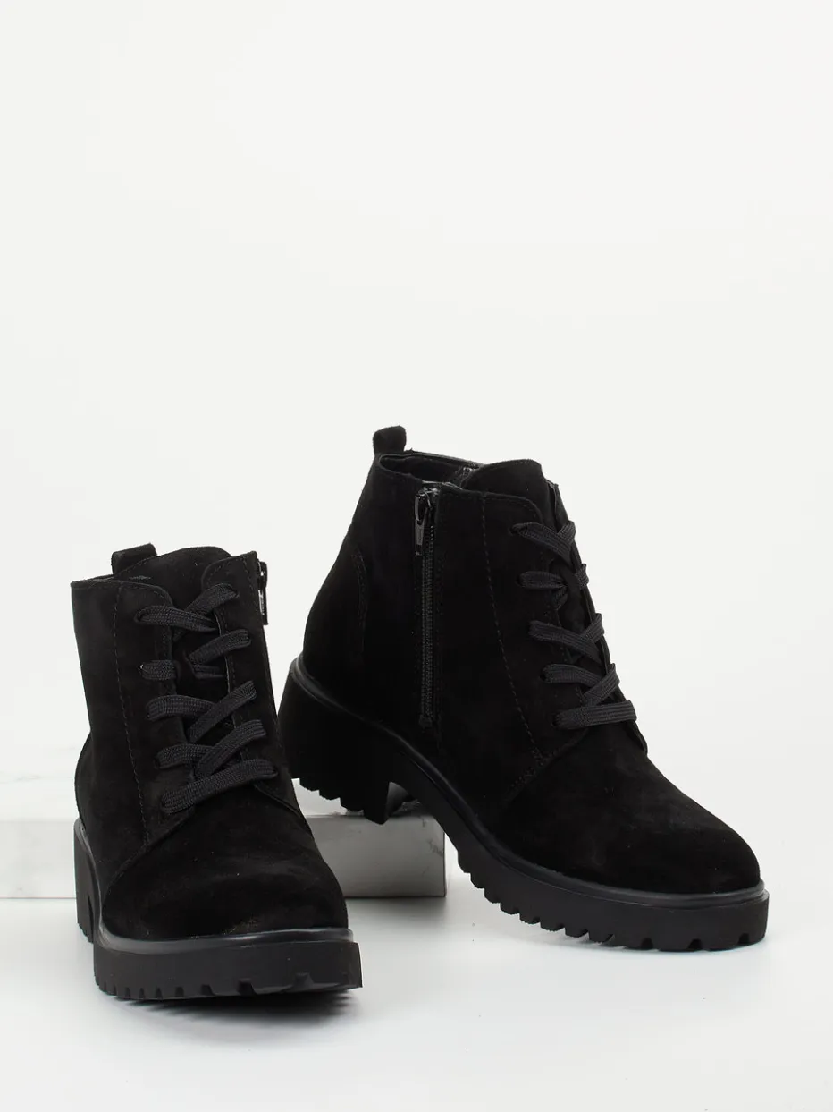 Stilsicher durch Herbst und Winter.Waldläufer präsentiert robuste Damen-Schnürboots für Alltag und Freizeit. Ideal bei kühleren Temperaturen schützt das Modell aus schwarzem Veloursleder – samtig-matt angeschliffen – mit weichem Textilfutter zuverlässig vor Kälte. Die knöchelhohe Form, kombiniert mit schwarzer Schnürung und seitlichem Reißverschluss, sorgt für komfortablen Sitz und sicheren Halt. Dank ihrer Luftpolster-Gummisohle mit griffigem Profil und blockigem Absatz eignen sich die Stiefeletten perfekt für urbanes Gehen und leichte Outdoor-Aktivitäten. Der cleane Look harmoniert mit Utility- und Minimalismus-Trends. Kombiniert mit Parka oder Steppmantel wird das Outfit alltagstauglich und stilvoll. Erleben Sie funktionalen Komfort mit typischer Waldläufer-Leichtigkeit.