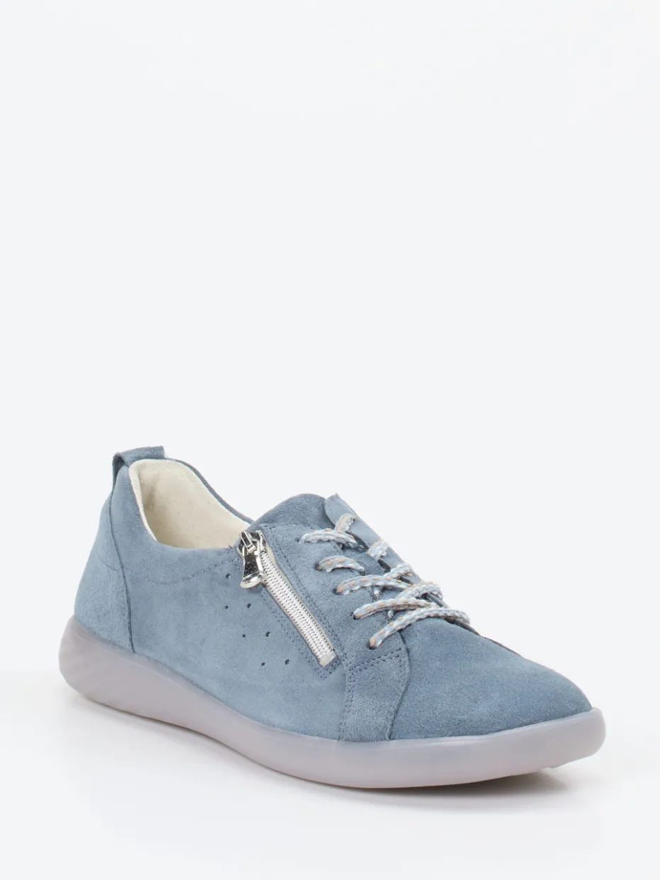 Weicher Komfort in stilvollem Blau.Waldläufer präsentiert mit diesem Schnürschuh einen Damen-Komfortsneaker im taubenblauen Veloursleder. Für entspannte Tage mit längerem Gehen bietet das Modell dank gepolstertem Einstieg und ergonomischer Gummisohle spürbaren Komfort. Das samtig angeschliffene Kalbleder zeigt sich in mattierter Anmutung, während die zweifarbigen Schnürsenkel und der silberfarbene Reißverschluss dezente Highlights setzen. Die abgerundete Form und das cleane Design reflektieren minimalistisches Understatement im Sinne des „Quiet Luxury“. Zeitgemäß kombiniert zu soften Tönen und Casual-Outfits. Markentypischer Alltagskomfort in modischer Zurückhaltung.