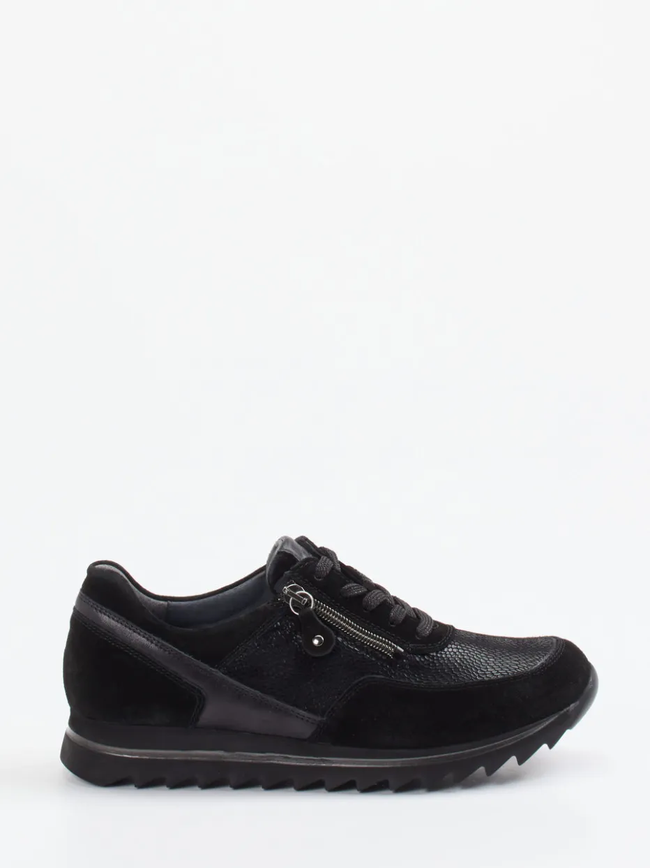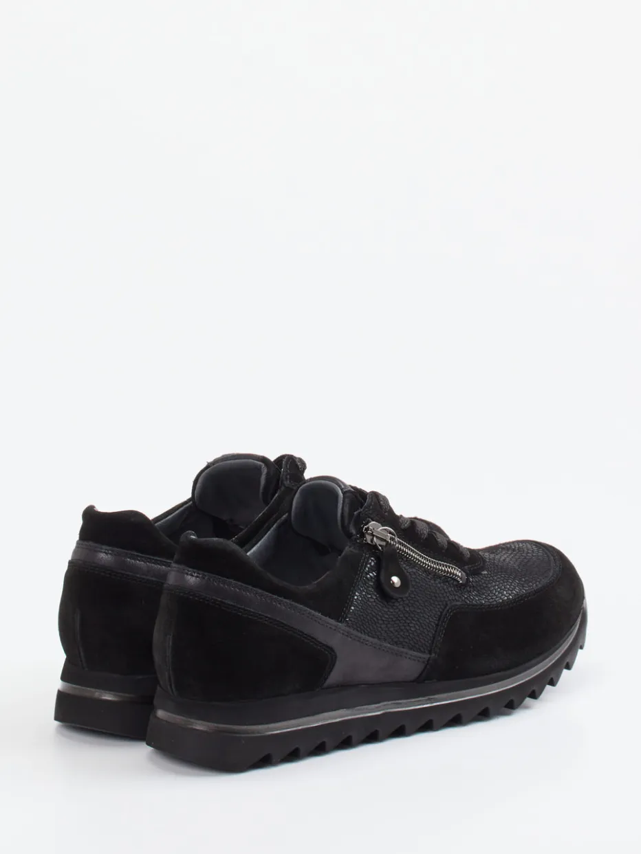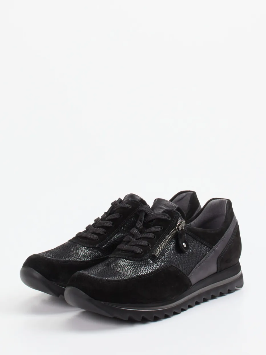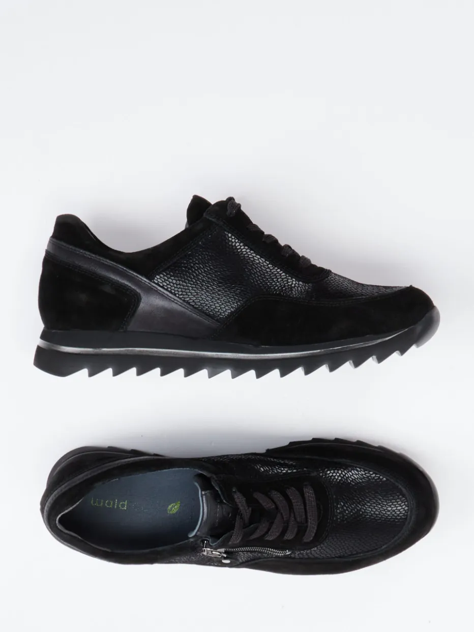 Komfort trifft Struktur.Waldläufer präsentiert einen stilvollen Damen-Sneaker für entspannte Alltagsmomente. Die Kombination aus softem Veloursleder mit strukturgeprägten Partien verleiht dem schwarzen Modell eine moderne Tiefe. Die leicht glänzende Oberfläche harmoniert gekonnt mit der dezenten Silhouette und einer bequemen Keilsohle samt Profil. Details wie der seitliche Reißverschluss in Silberoptik unterstützen das schnelle Anziehen und ergänzen das funktionale Schnürsystem. Inspiriert von Streetwear und Black-on-Black-Trends, passt dieser Schuh zur komfortorientierten Freizeitmode. Funktionalität, Form und Material gestalten einen alltagstauglichen Begleiter im markentypischen Waldläufer-Komfort.