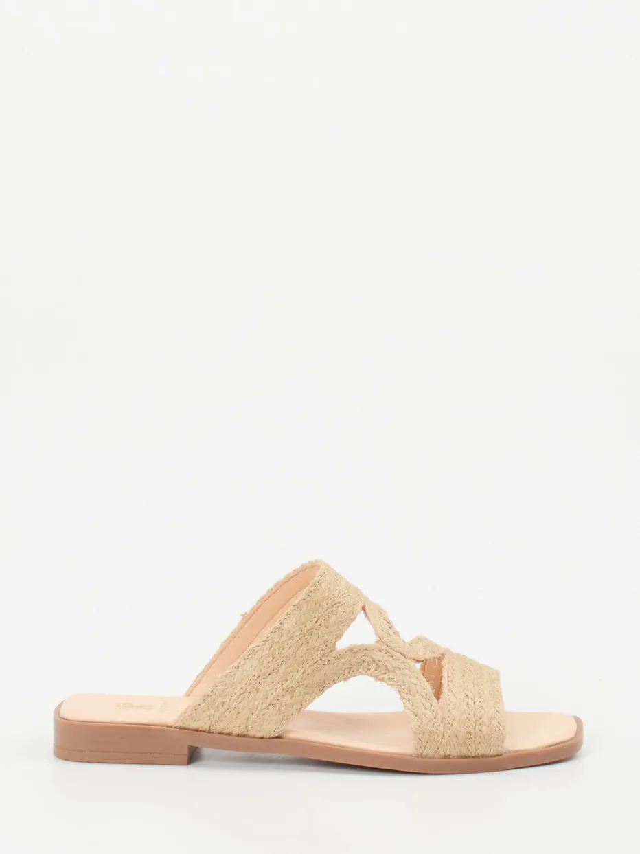 Diese flachen Damen-Slides aus Jute und Leder verbinden sommerliche Leichtigkeit mit elegantem Minimalismus. Ideal für Strandtage oder urbane Freizeitlooks.