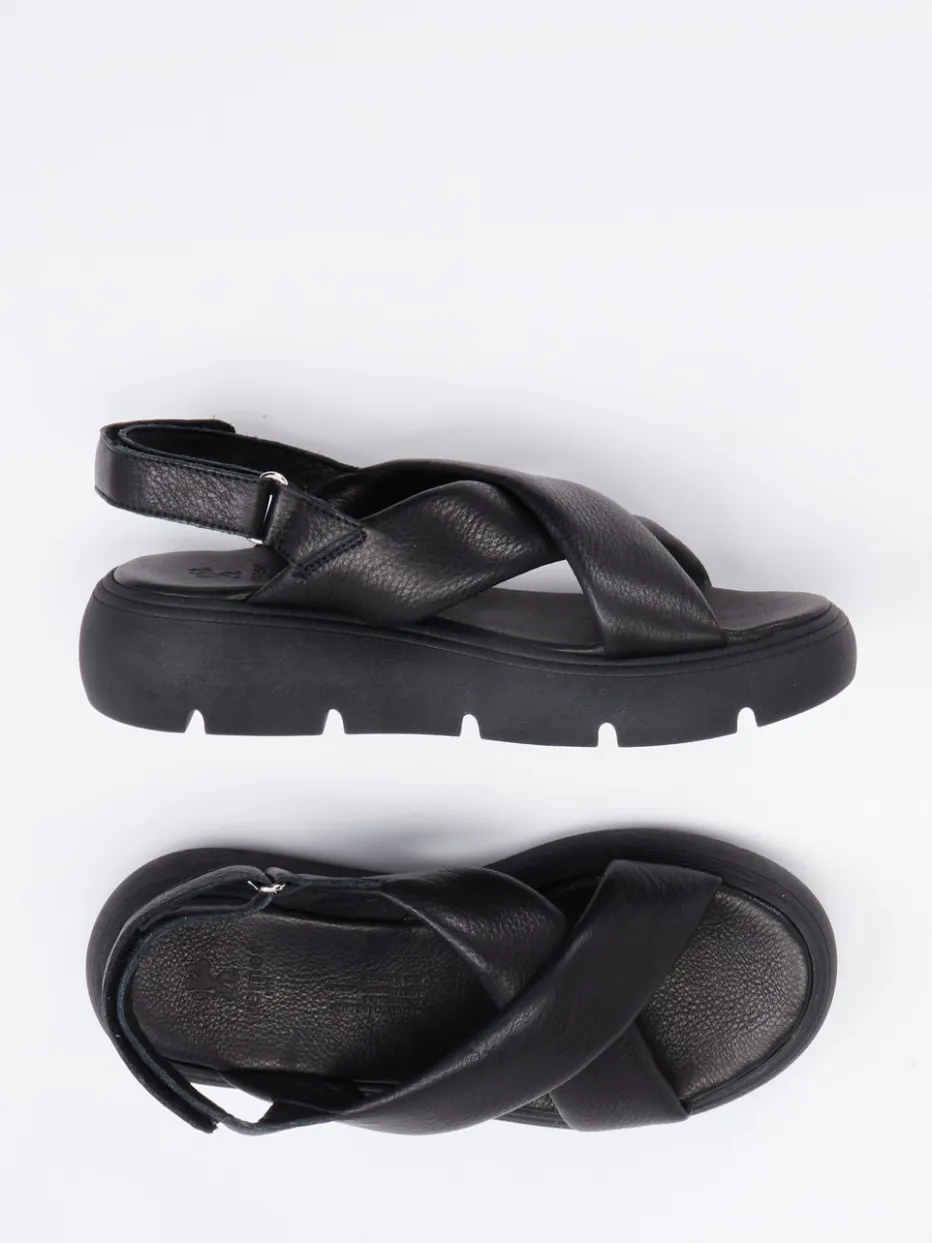 Minimalistische Eleganz trifft Komfort.Werner präsentiert mit dieser Plateau-Sandale ein stilvolles Modell für Damen, das Komfort und Trendgespür vereint. Ideal für warme Tage in der Stadt oder im Urlaub: Das schwarze, genarbte Kalbleder stammt aus pflanzlich gegerbter Bioqualität und zeigt eine matte Oberfläche mit feinen Ton-in-Ton-Nähten. Gekreuzte Riemen und ein individuell verstellbarer Klettverschluss am Fersenriemen bieten optimalen Halt. Die gepolsterte Innensohle und voluminöse Gummisohle mit Flexrillen sorgen für angenehmes Gehen. Modisch inspiriert von „Quiet Luxury“ und aktuell gefragten Chunky-Silhouetten. Ein nachhaltiger Sommerschuh mit zeitloser Formensprache.