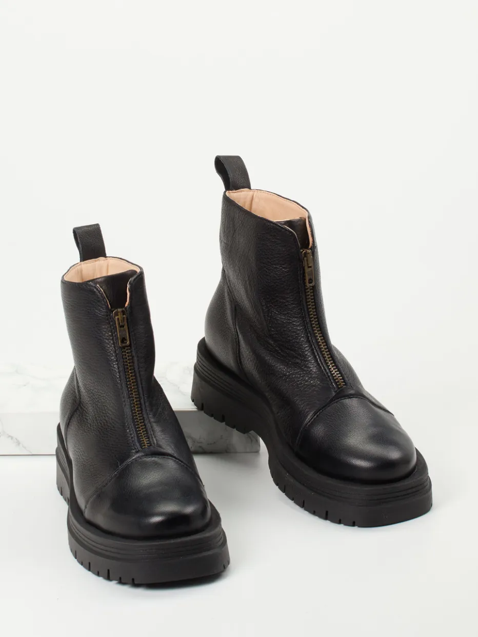 Der cleane Look in schwarzem Kalbleder wird durch die Chunky-Sohle und den goldfarbenen Reißverschluss modern akzentuiert. Ideal für trendbewusste Herbst-/Winter-Looks.