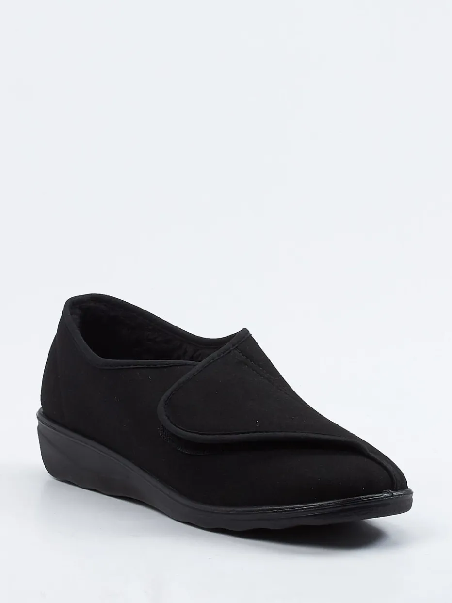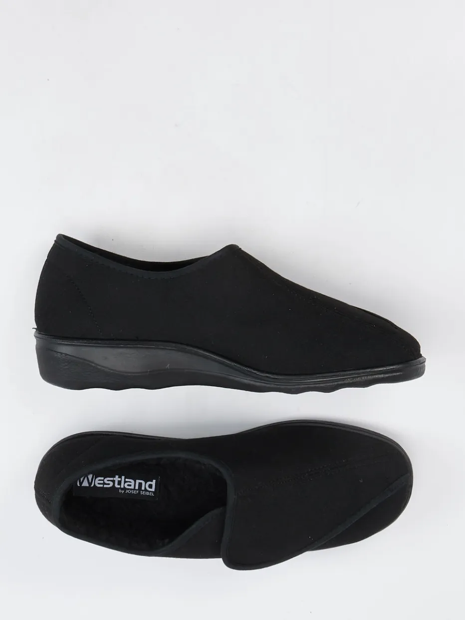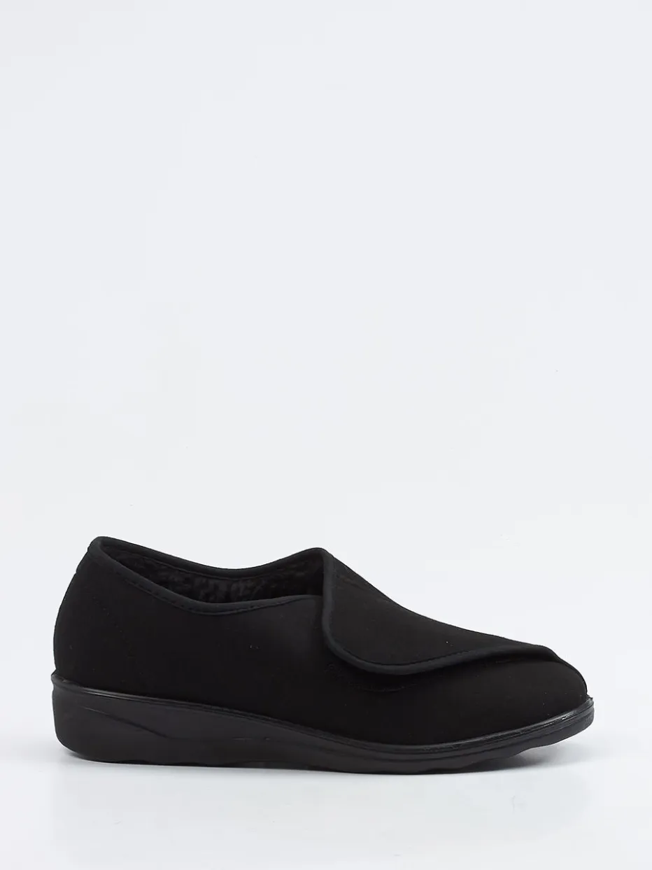 Wärmekomfort im Alltag.Westland präsentiert mit diesem Klett-Hausschuh ein unaufgeregtes Modell für entspannte Momente zu Hause. Für kalte Böden oder ruhige Abende auf dem Sofa: Das schwarze Textilmaterial in samtiger Veloursleder-Optik sorgt für ein angenehmes Tragegefühl, während das kuschelige Innenfutter zuverlässig wärmt. Die geschlossene, rund zulaufende Form unterstützt den Fuß sanft, der praktische Klettverschluss erleichtert den Einstieg. Eine rutschhemmende PU-Sohle federt jeden Schritt weich ab und bietet sicheres Gehen – auch auf glatten Flächen. Der Look ist betont minimalistisch und fügt sich dezent in komfortorientierte Outfits. Ein hausschuhgerechtes Design mit spürbarer Westland-Qualität.