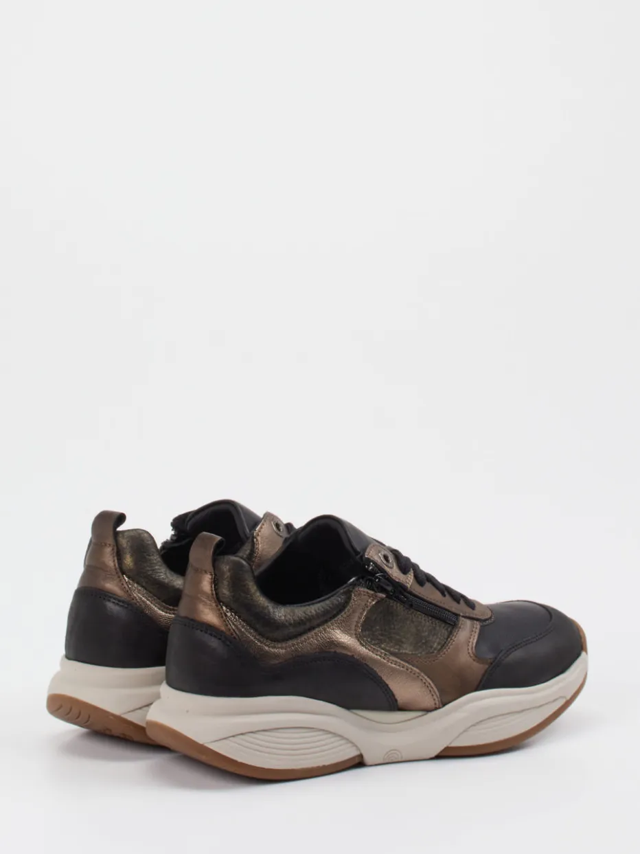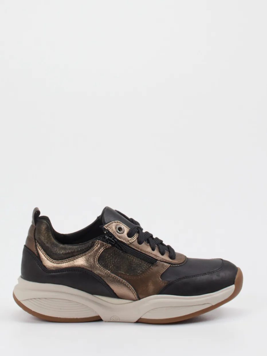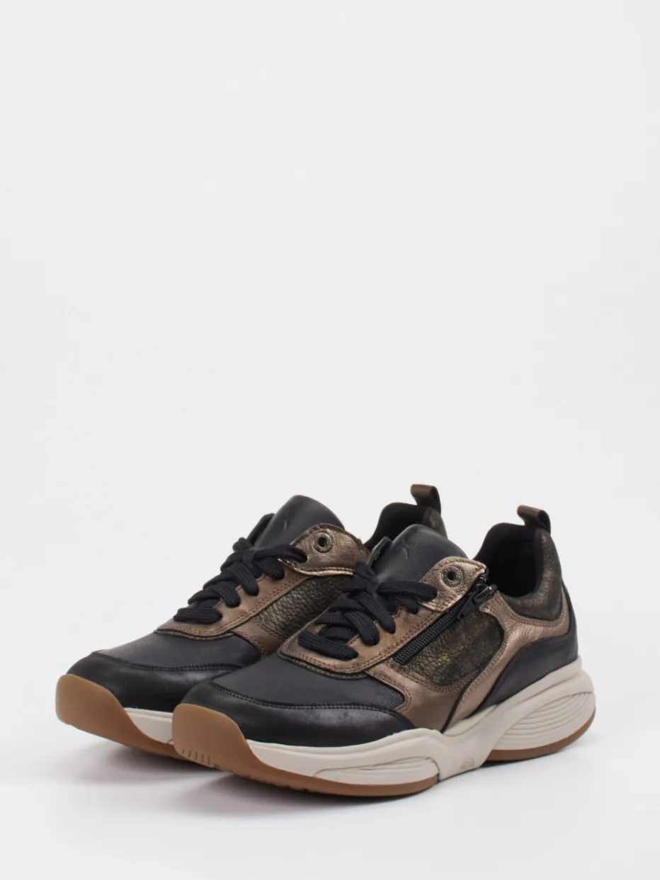 Streetstyle trifft auf Komfort.Xsensible präsentiert diesen Damen-Chunky-Sneaker im modernen Streetwear-Stil. Ideal für aktive Tage und urbane Looks punktet das Modell mit einer Kombination aus schwarzem Kalbleder, samtig angeschliffenem Veloursleder und bronzefarbenen Metallic-Einsätzen. Die breite, schwarze Schnürung in Kombination mit einem praktischen Reißverschluss sorgt für einen bequemen Einstieg und individuellen Sitz. Eine rutschhemmende Gummisohle mit japanischer Balance-Technologie unterstützt eine gesunde Haltung, während das austauschbare Fußbett zusätzlichen Komfort garantiert. Die voluminöse Silhouette und die gedeckten Farben runden das Design trendgerecht ab. Xsensible vereint Modebewusstsein mit ergonomischer Funktionalität für stilvollen Bewegungskomfort.