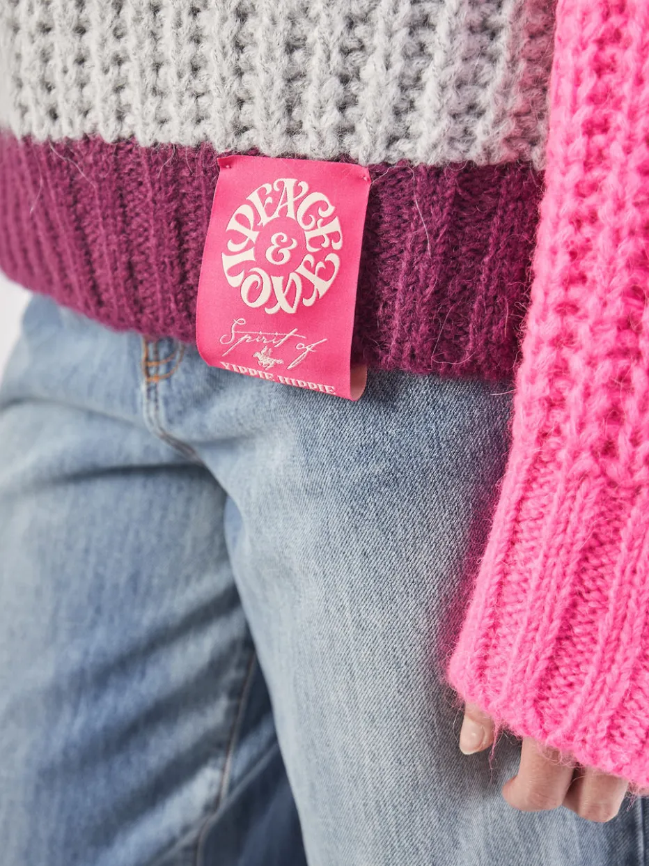 Der grob gestrickte Colorblock-Pullover von Yippie Hippie verbindet Retro-Charme mit modernem Streetstyle – ideal für entspannte Outfits mit Trendbewusstsein.