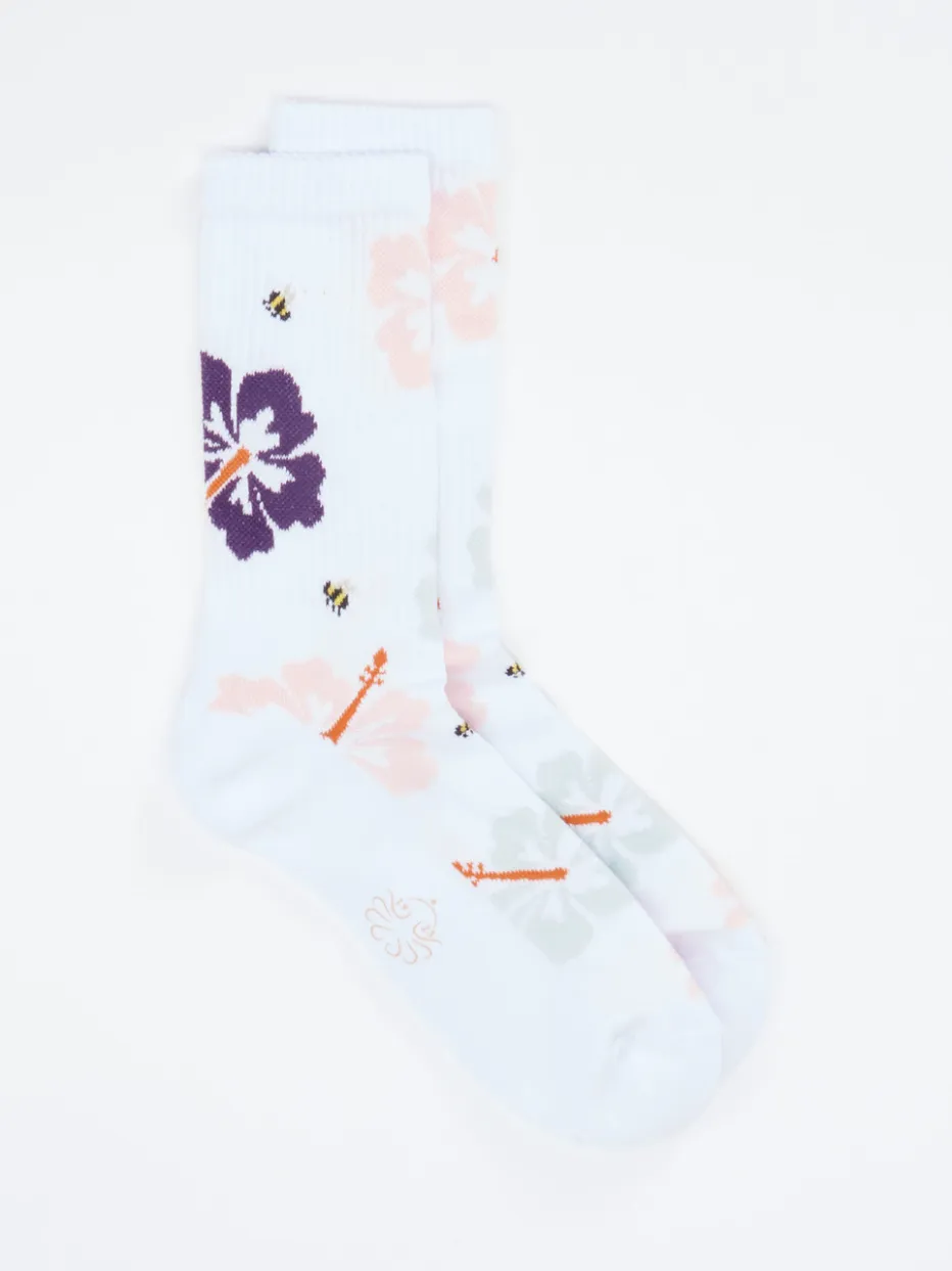 Diese attraktiven Damensocken kommen aus dem Haus Alto Milano. Bunte Hibiskusblüten werden zusammen mit Bienen auf einem schneeweißen Hintergrund in Szene gesetzt. Einfach schicke Socken für ein frühlingshaftes Outfit! – Material: 80% Baumwolle, 20% PA – Pflegehinweis: Schonwaschgang max. 30°C, auf links waschen