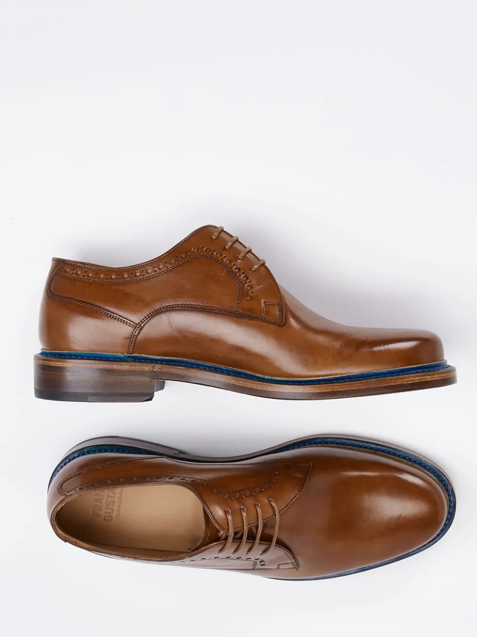 Eleganter Derby aus cognacfarbenem Kalbleder mit raffinierter Lochung und blauer Akzentsohle – traditionell gefertigt, modern interpretiert.