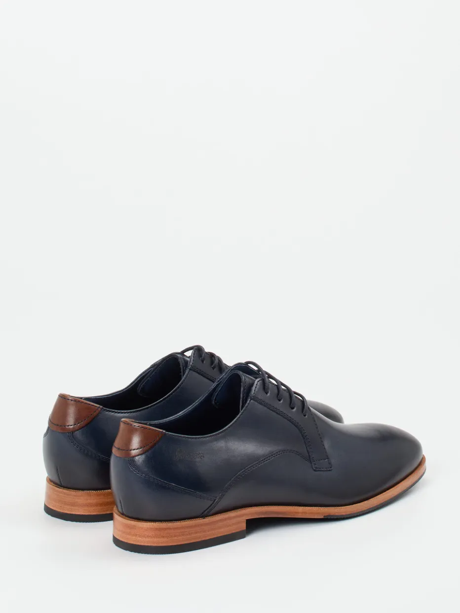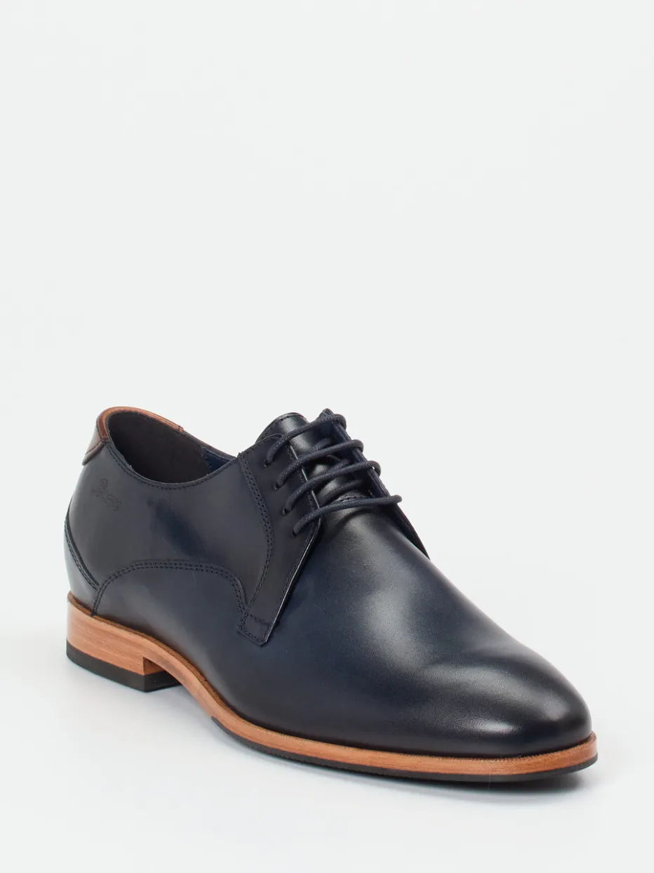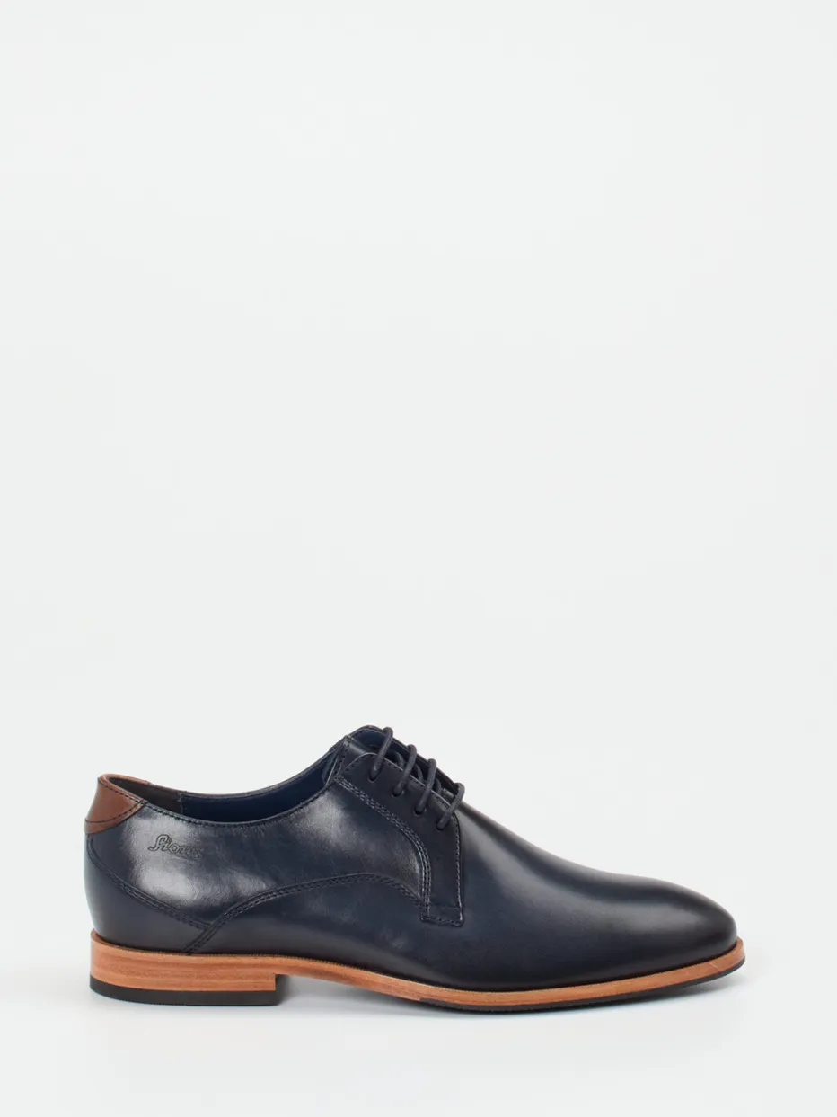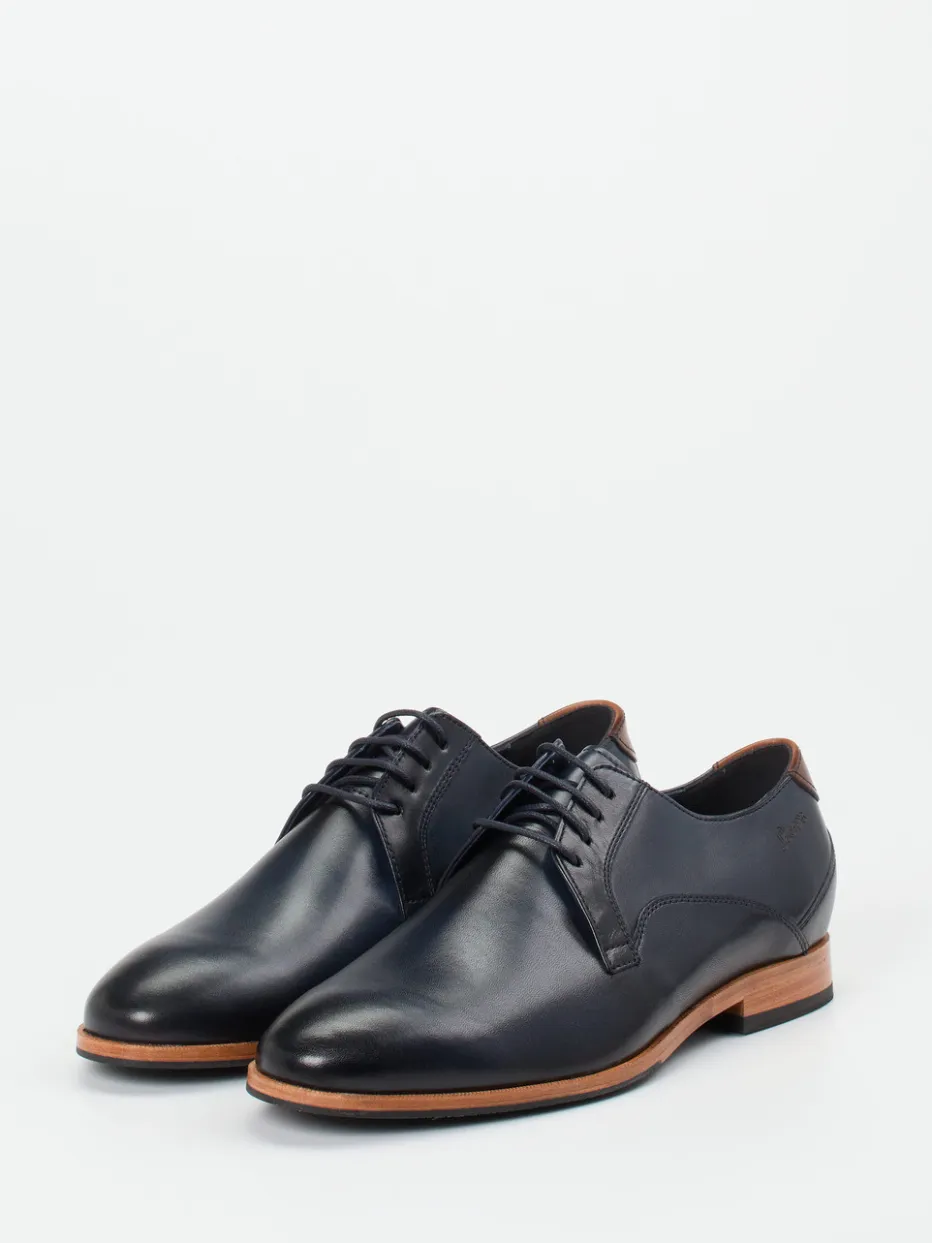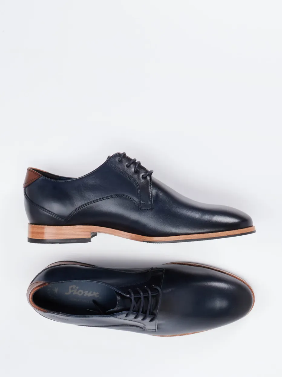 Stilsichere Eleganz für formelle Auftritte.Der Derby-Schnürschuh von Sioux vereint klassisches Design mit modernem Feinschliff. Ideal für lange Tage im Büro oder besondere Anlässe: Das dunkelblaue, polierte Kalbleder zeigt sich mit elegantem Glanz und straffer Oberflächenstruktur. Die klassisch-geschwungene Silhouette wird durch die zweifarbige Fersenkappe in Braun sowie eine Kontrastsohle in Naturleder-Optik raffiniert akzentuiert. Die 5-Loch-Schnürung und das gepolsterte Lederfutter sorgen für komfortablen Sitz, während die Gummiprofilsohle sicheren Halt garantiert. Der Look folgt dem modischen Anspruch von „Quiet Luxury“ – zurückhaltend edel. Ein durchdachter Herrenschuh mit Charakterstärke und Understatement.