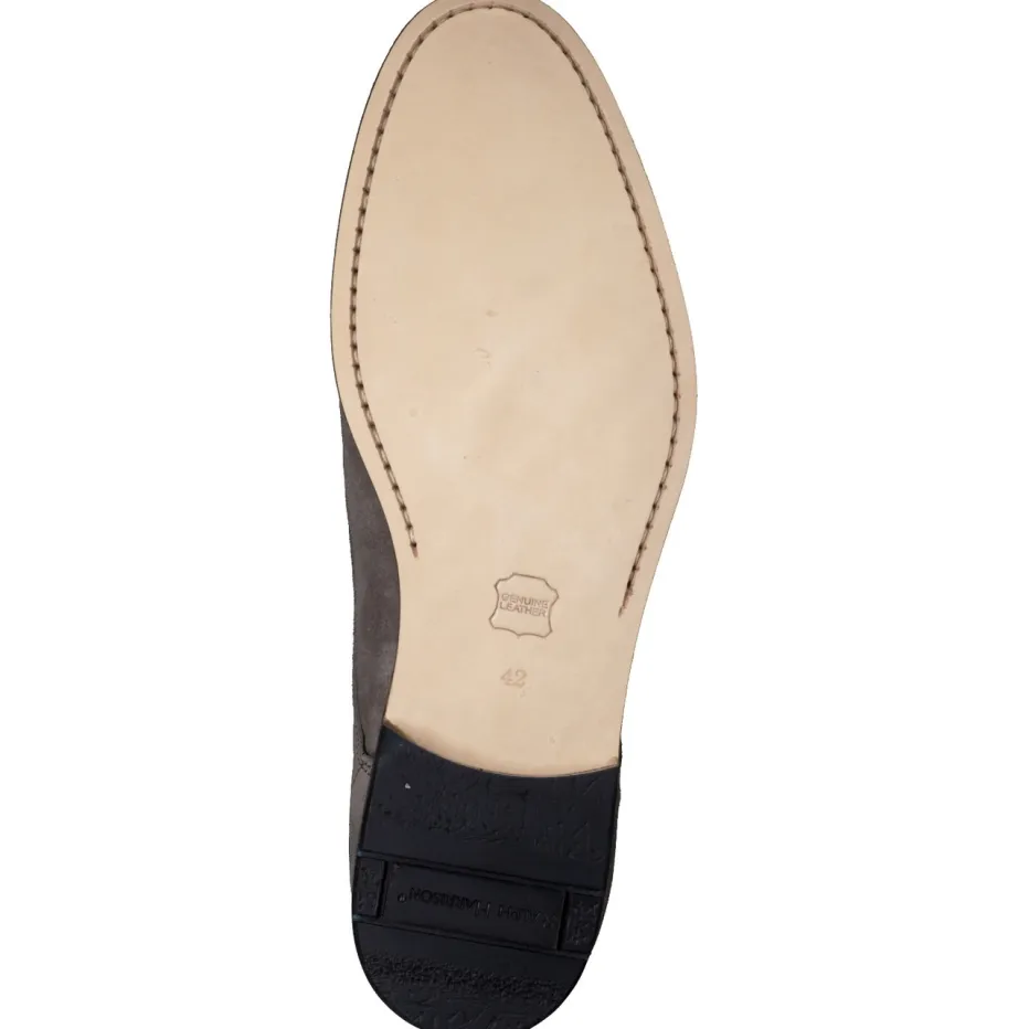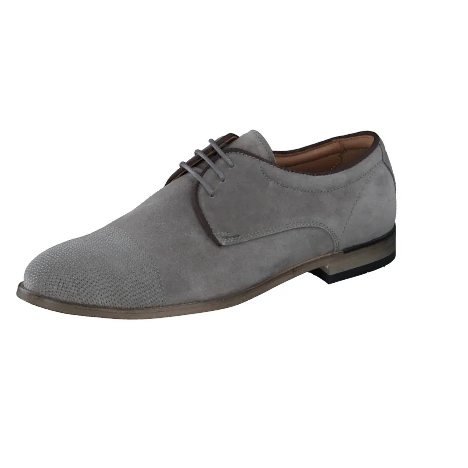 Im grauen Veloursleder mit samtig-matter Struktur zeigt der Schnürschuh seine hochwertige Verarbeitung. Die geprägte Kappe sowie tonige Nähte und eine braune Kantenpaspelierung setzen dezente Highlights. Klassisch-flach in der Silhouette, innen mit Kalblederfutter und bequemem Fußbett ausgestattet – ideal für Geschäftstermine oder elegante Freizeitkombinationen. Der Look greift aktuelle Trends wie „Quiet Luxury“ und „Soft Neutrals“ auf und lässt sich stilvoll mit beigefarbener Chino und grauem Gürtel ergänzen.