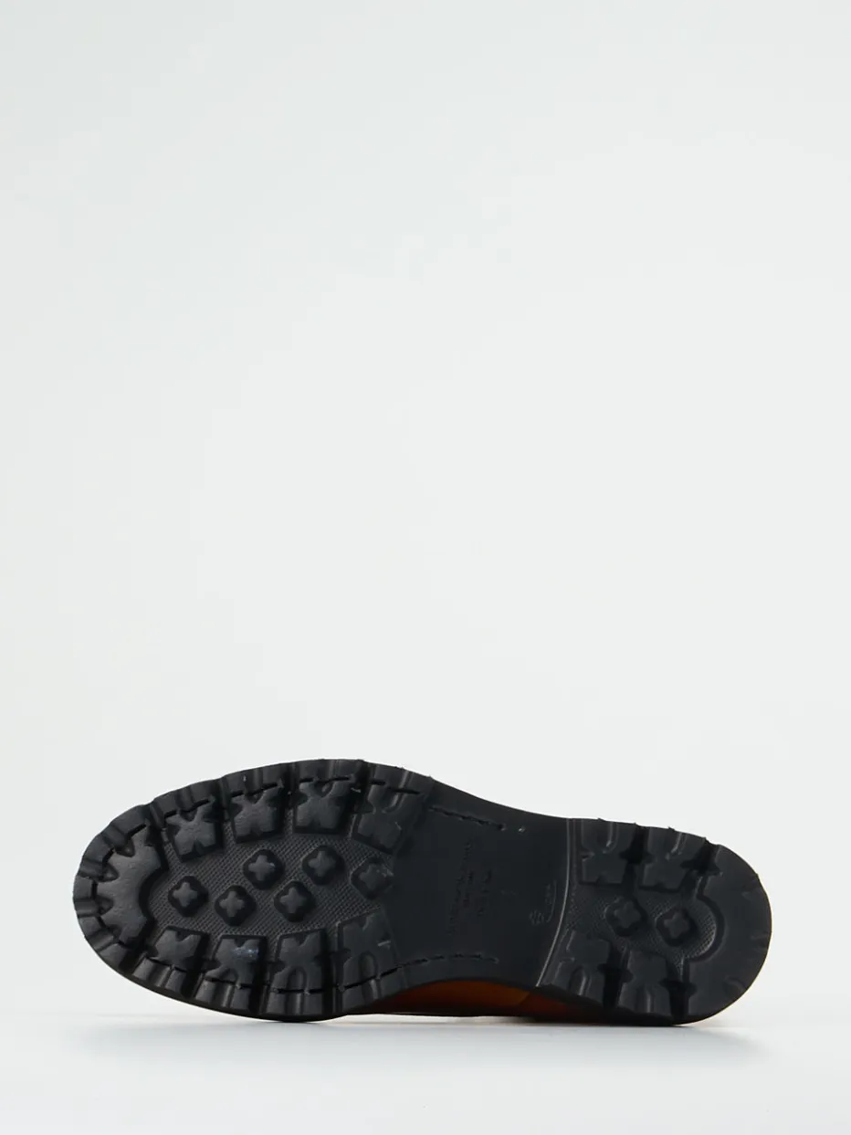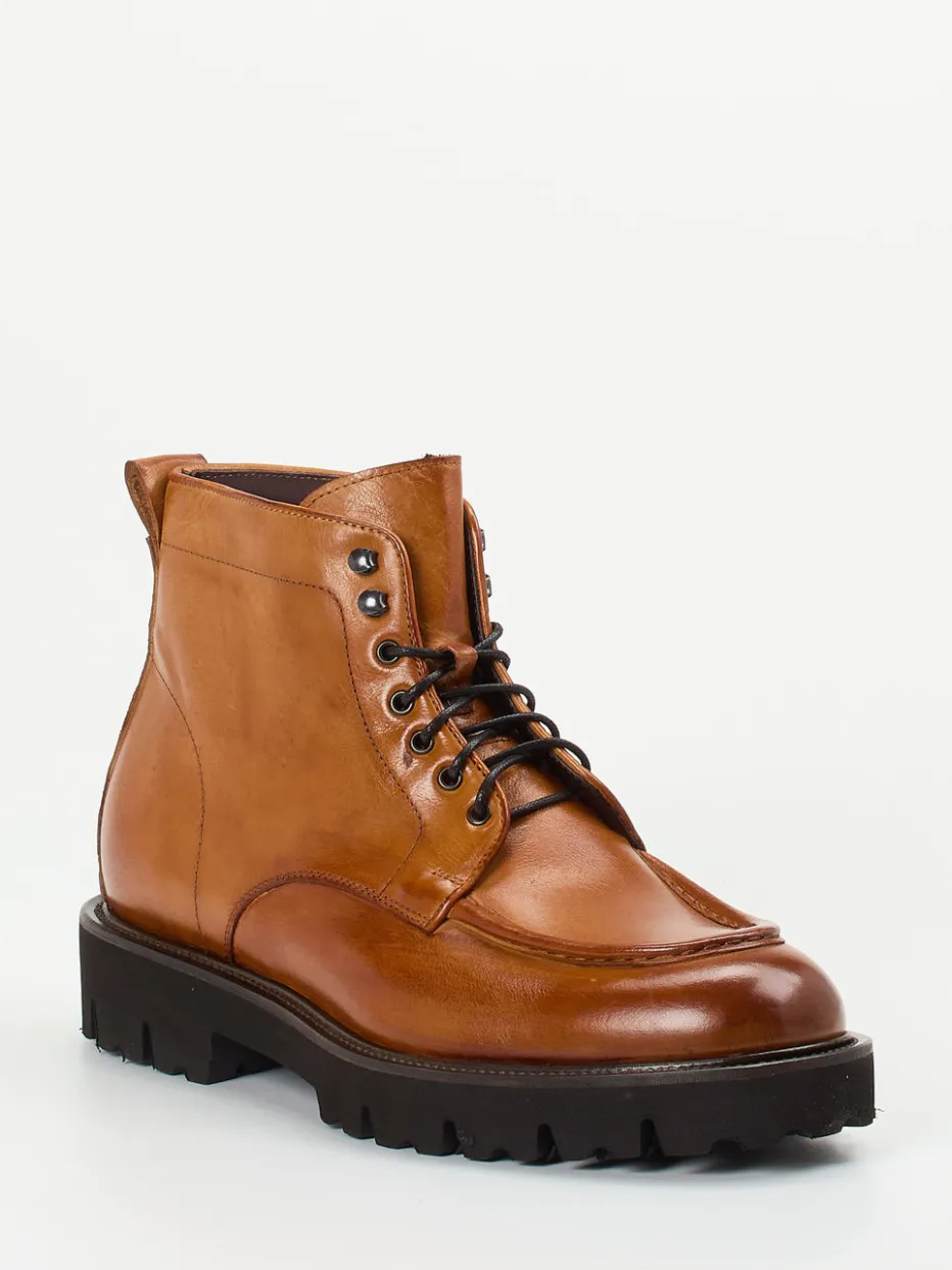 Das cognacfarbene Büffelleder überzeugt mit edlem Glanz und markanter Patina. Ein robuster Schnürboot im Heritage-Look, der klassische Formgebung mit modernem Anspruch verbindet.