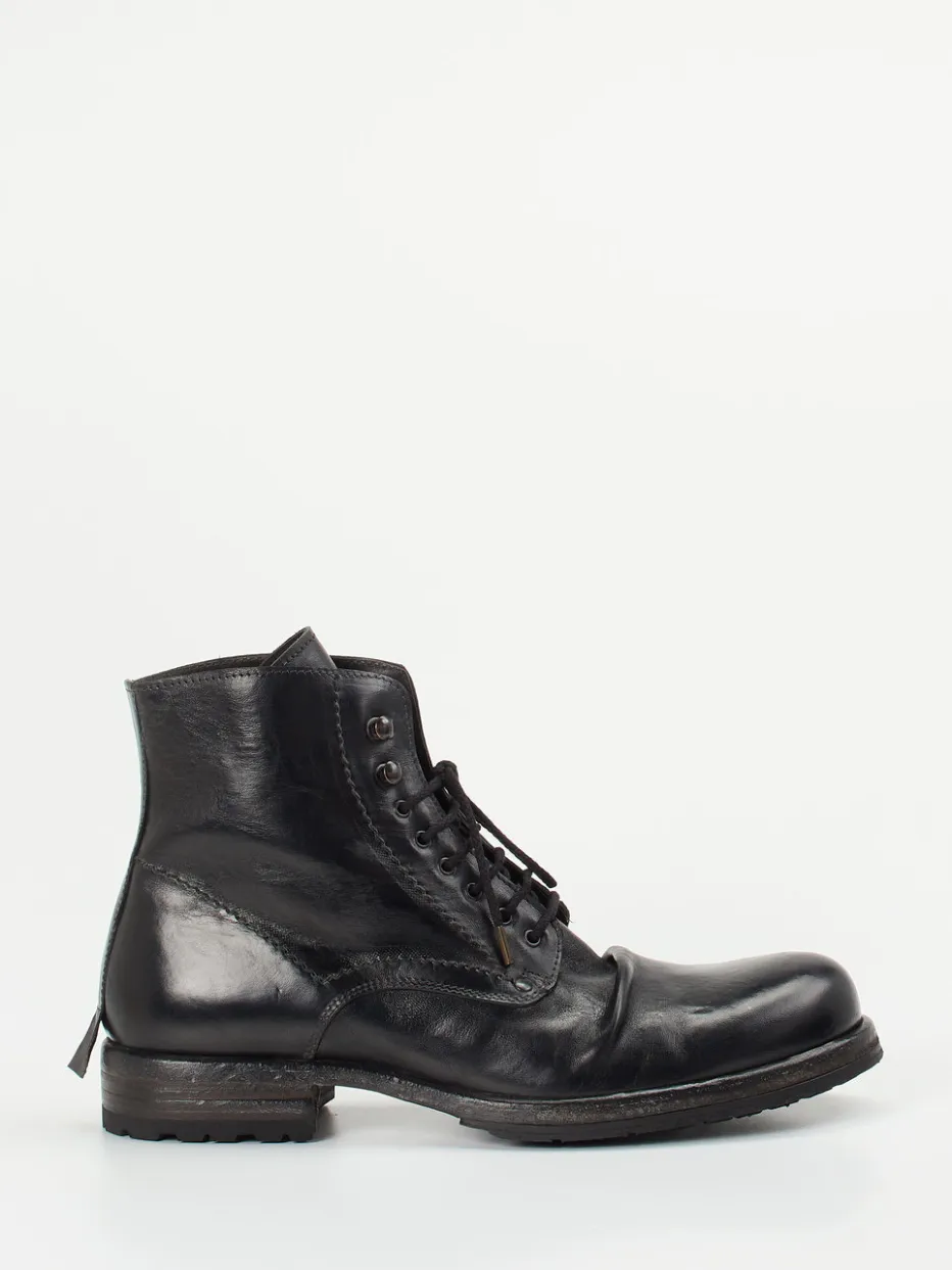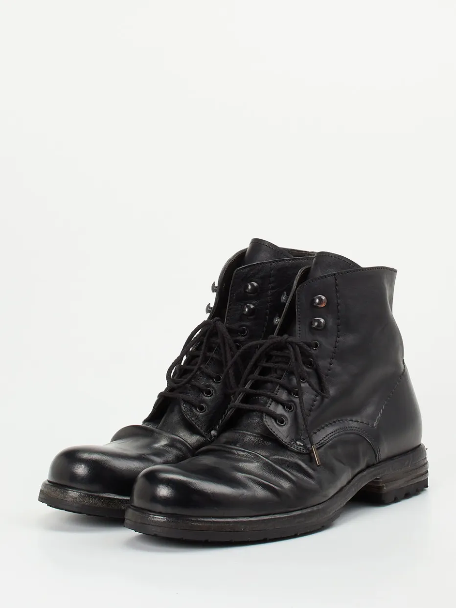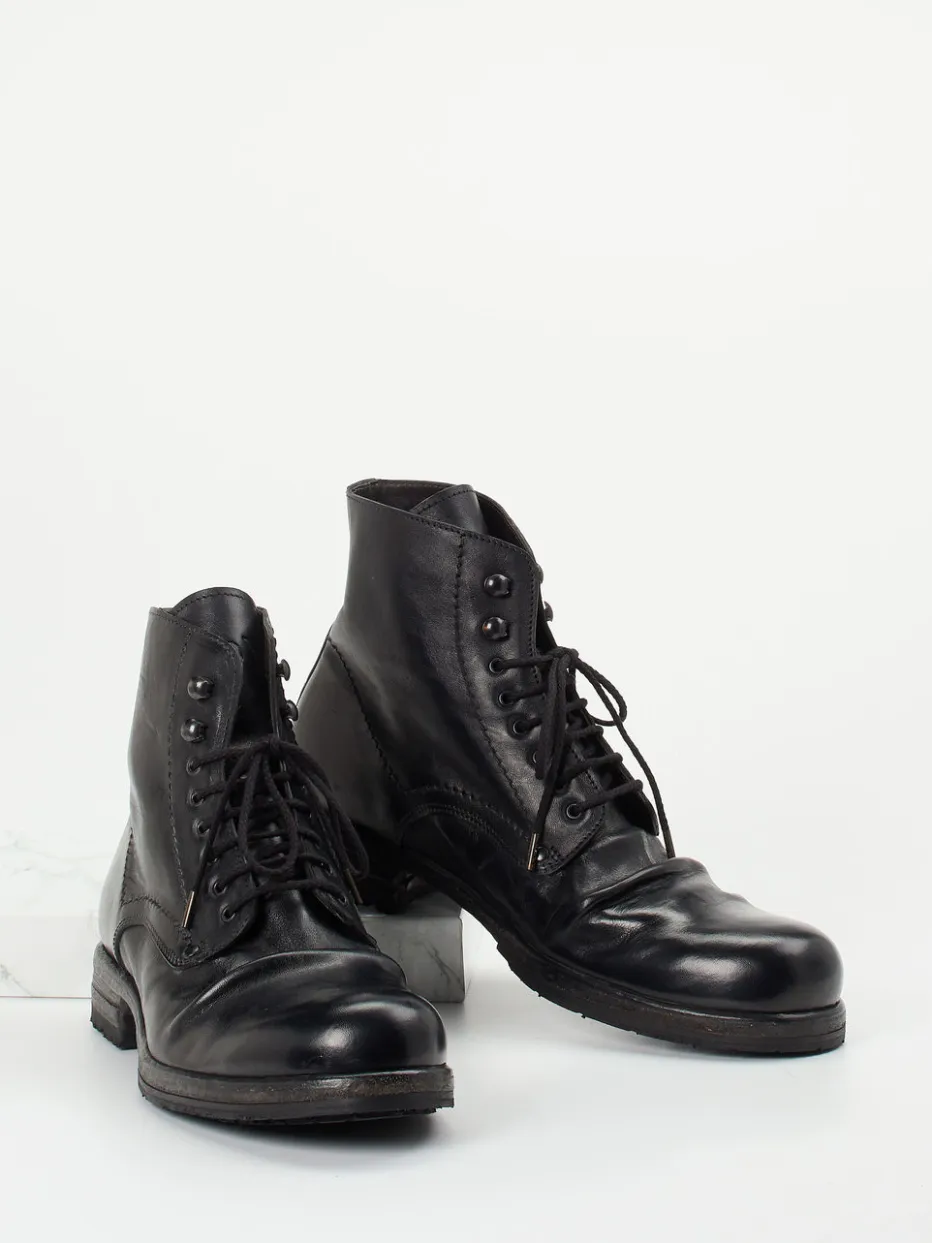 Ideal für kühle Tage in der Stadt oder stilvolle Wochenendausflüge: Der schwarze Schnürboot überzeugt durch glänzendes Pferdeleder mit charakteristischen Querfalten am Rist. Schwarze Metallösen mit markanter Haken-Ösen-Schnürung unterstreichen den Heritage-Look. Die durchgenähte Ledersohle mit Gummiprofil sorgt für Trittsicherheit und Langlebigkeit. Inspiriert von Workwear und Militärstil, bleibt der Look klassisch-modern. Lässt sich hervorragend zu Raw Denim oder Wollhose kombinieren.