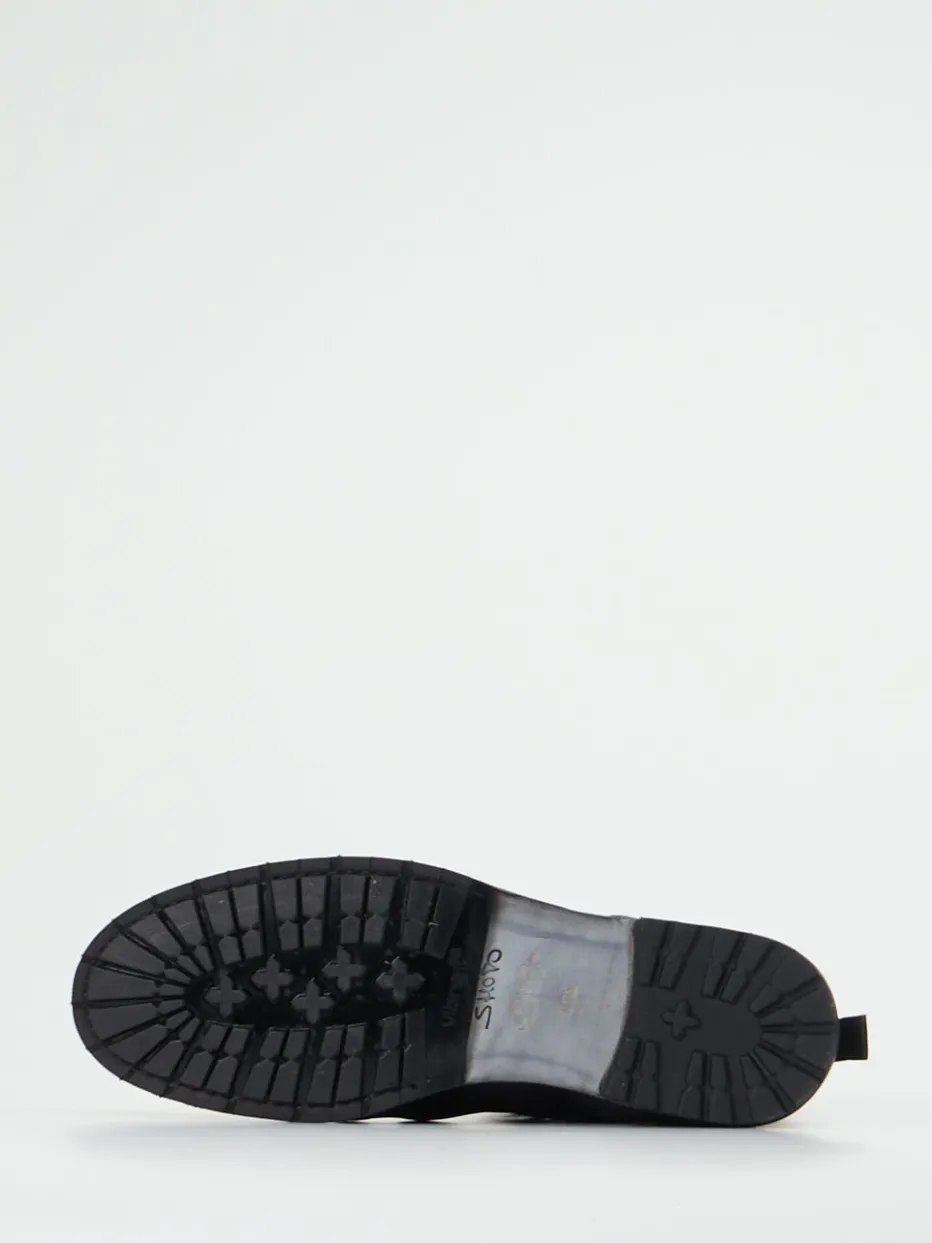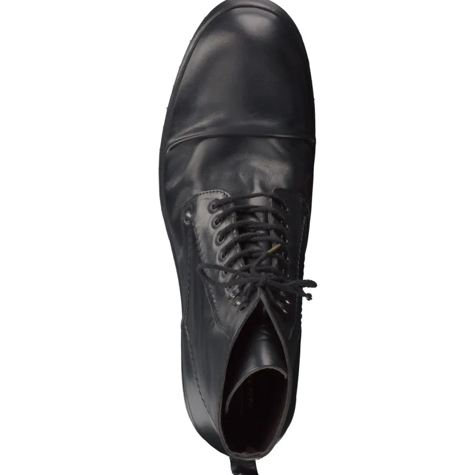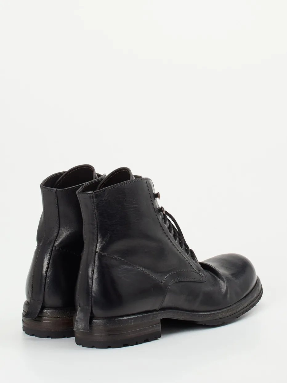 Ideal für kühle Tage in der Stadt oder stilvolle Wochenendausflüge: Der schwarze Schnürboot überzeugt durch glänzendes Pferdeleder mit charakteristischen Querfalten am Rist. Schwarze Metallösen mit markanter Haken-Ösen-Schnürung unterstreichen den Heritage-Look. Die durchgenähte Ledersohle mit Gummiprofil sorgt für Trittsicherheit und Langlebigkeit. Inspiriert von Workwear und Militärstil, bleibt der Look klassisch-modern. Lässt sich hervorragend zu Raw Denim oder Wollhose kombinieren.