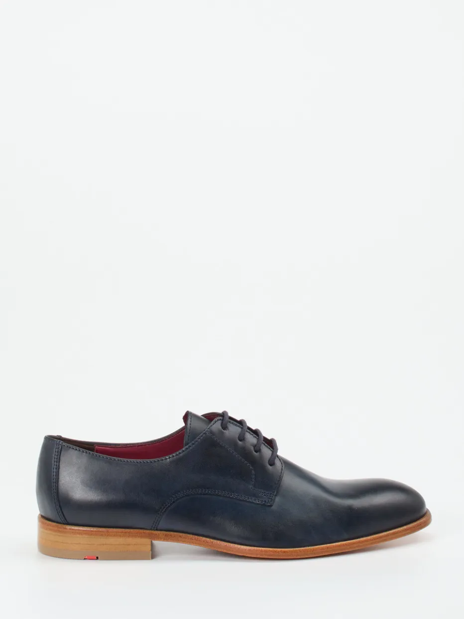Feinheit im Detail trifft klassisches Understatement.Lloyd präsentiert mit diesem Derby-Schnürschuh einen eleganten Herrenklassiker. Für formelle Anlässe oder den Büroalltag bietet das dunkelblaue, glänzende Kalbleder eine souveräne Basis. Die klare Linienführung, kombiniert mit der bordeauxroten Innenfütterung und der kontrastfarbenen Ledersohle mit rotem Akzentstreifen, bringt dezente Raffinesse ins Spiel. Die klassische flache Silhouette mit 5-Loch-Schnürung unterstreicht den traditionsbewussten Charakter, während der Gummieinsatz im Absatz Trittdämpfung und Langlebigkeit sichert. Im Trendfeld „Quiet Luxury“ positioniert, ergänzt der Schuh minimalistische Looks ebenso wie gehobene Business-Garderoben. Verlässliche Verarbeitung in gewohnt hochwertiger Lloyd-Qualität.