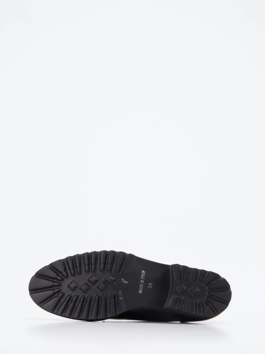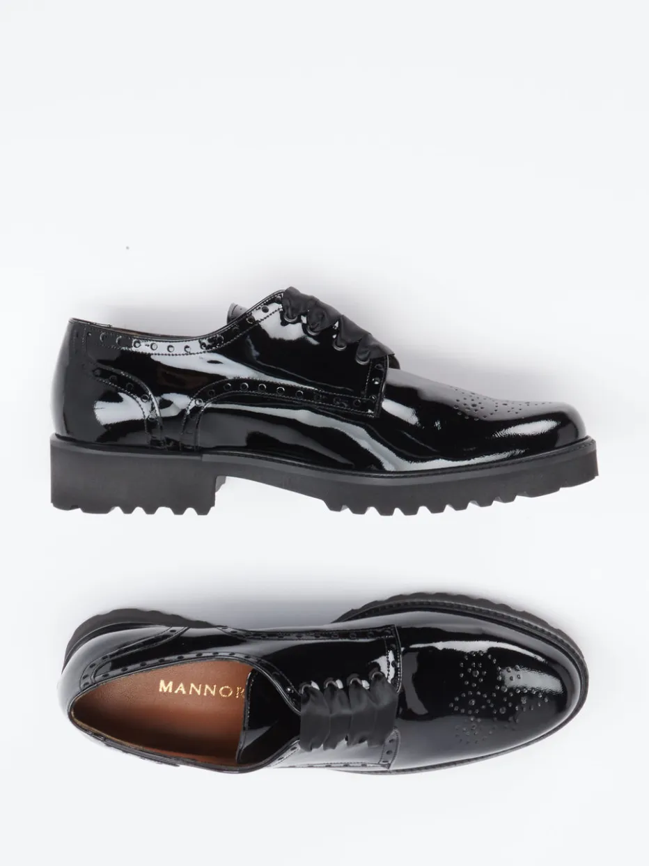 Minimalistische Raffinesse trifft Business-Charakter.Der Damen-Derbyschuh von Mannori verbindet zeitlosen Stil mit modernem Understatement. Ideal für gepflegte Office-Outfits oder urbane Freizeitlooks: Das glänzend schwarze Lackleder, veredelt durch ein filigranes Lochmuster, prägt zusammen mit der klobigen Leichtzellsohle das ausdrucksstarke Erscheinungsbild. Satin-Schnürsenkel setzen einen femininen Akzent, während das warme Lammnappa-Futter für Komfort sorgt. Ein Klassiker in modischer Chunky-Optik – perfekt eingebettet in den „Quiet Luxury“-Trend. Design, das auf hochwertige Materialien und klare Linien setzt – mit dem gewissen Etwas von Mannori.