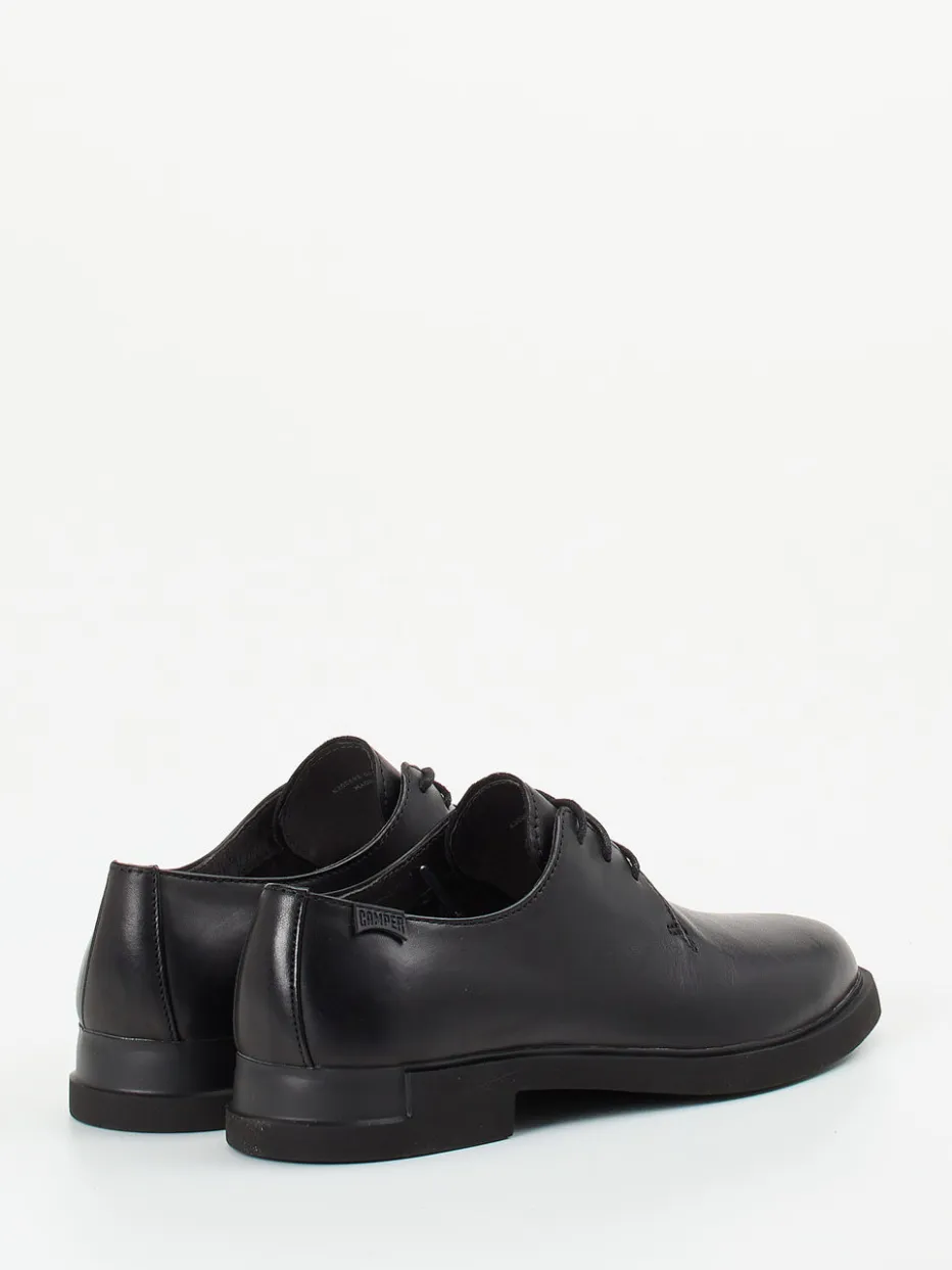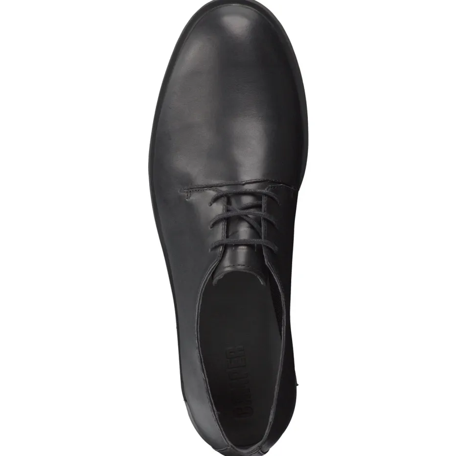 Einen schlichten Schnürschuh mit moderner Silhouette präsentiert die Marke Camper hier. Das schwarze Kalbleder kommt auf dem verrundeten Leisten sportlich zur Geltung. Superleicht und von innen weich gepolstert, vermittelt die schwarze Gummisohle mit dem ausgefallenen Absatz ein komfortables Tragegefühl. Ein toller Schnürschuh für viele Gelegenheiten.