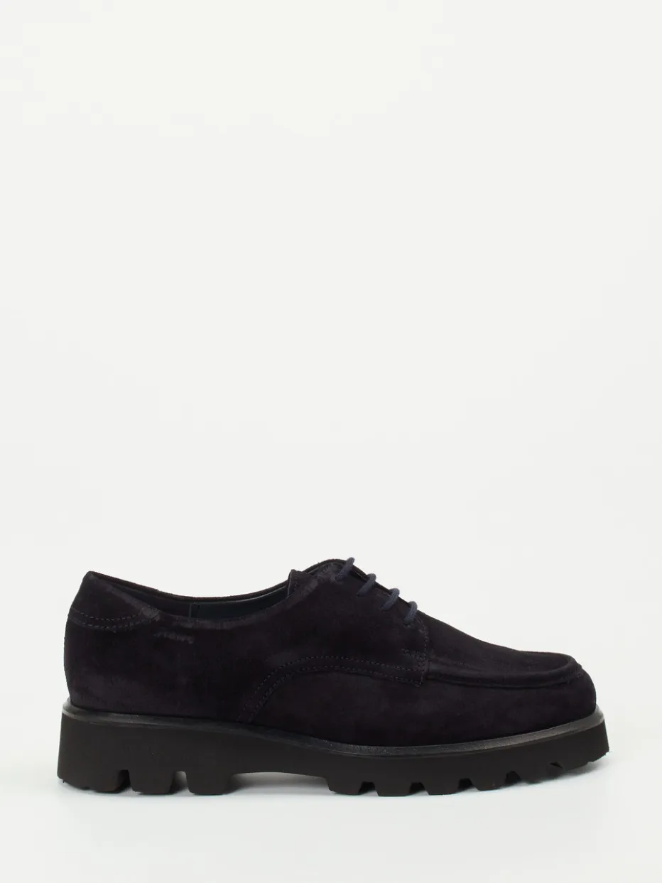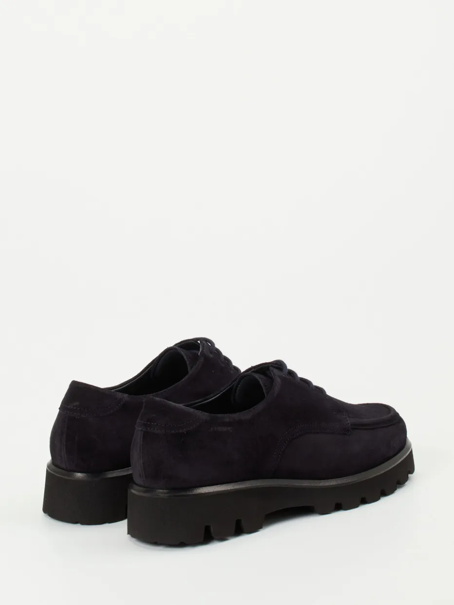 Ob zum Stadtbummel oder Business-Lunch – das hochwertige Veloursleder mit gewachster, samtiger Oberfläche schützt zuverlässig vor Wind und Nässe. In tiefdunklem Blau gehalten und mit minimalistischer Mokassinnaht sowie toniger Vierloch-Schnürung versehen, setzen die Schuhe auf dezente Eleganz. Die profilierte Gummisohle in Schwarz unterstreicht den Chunky-Look und liefert sicheren Halt, selbst auf rutschigem Untergrund. Innen sorgt ein Leder-/Textilfutter mit weich gepolstertem Wechselfußbett für spürbaren Komfort. Ideal für Fans von Quiet Luxury und funktionaler Ästhetik.