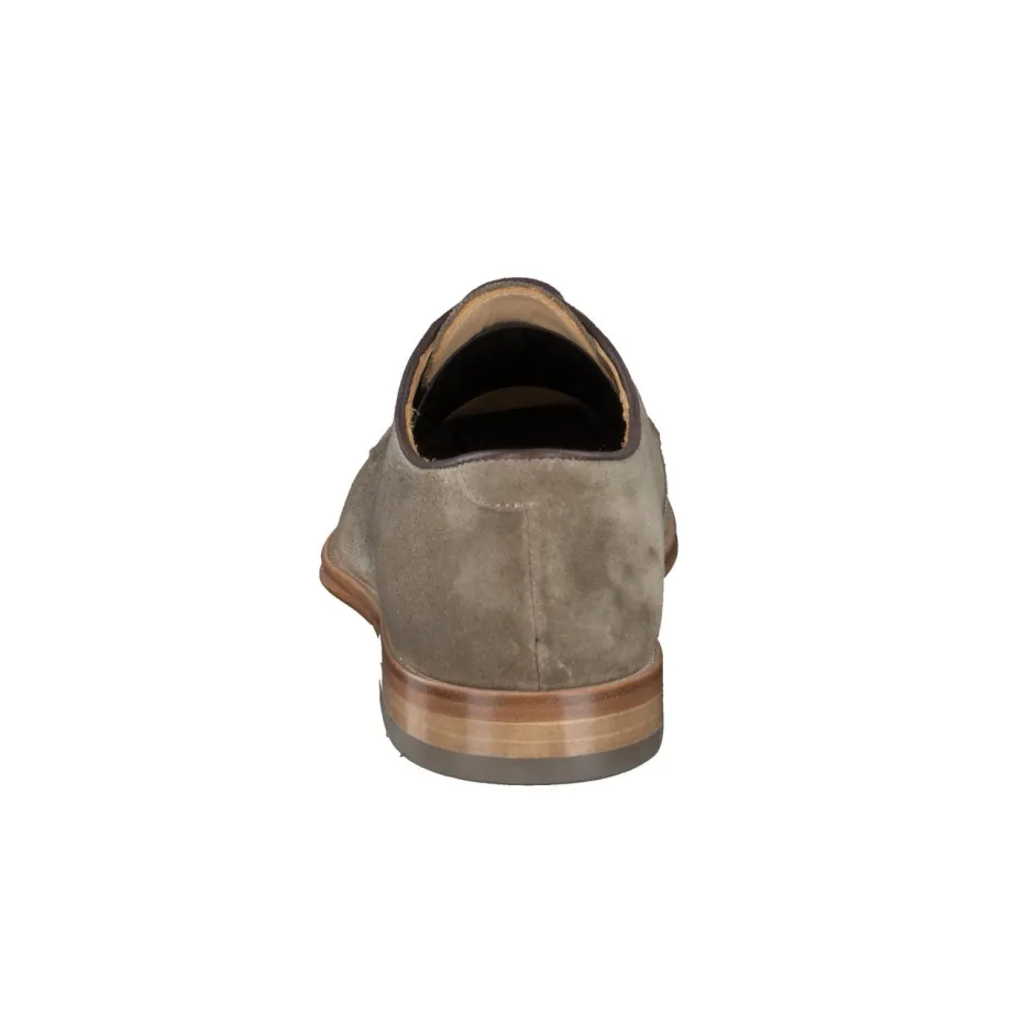 Fein gearbeitetes Veloursleder in Moosgrün trifft auf Akzente aus braunem Nappaleder – ein Derby von klarer Linie und zeitlosem Charakter.