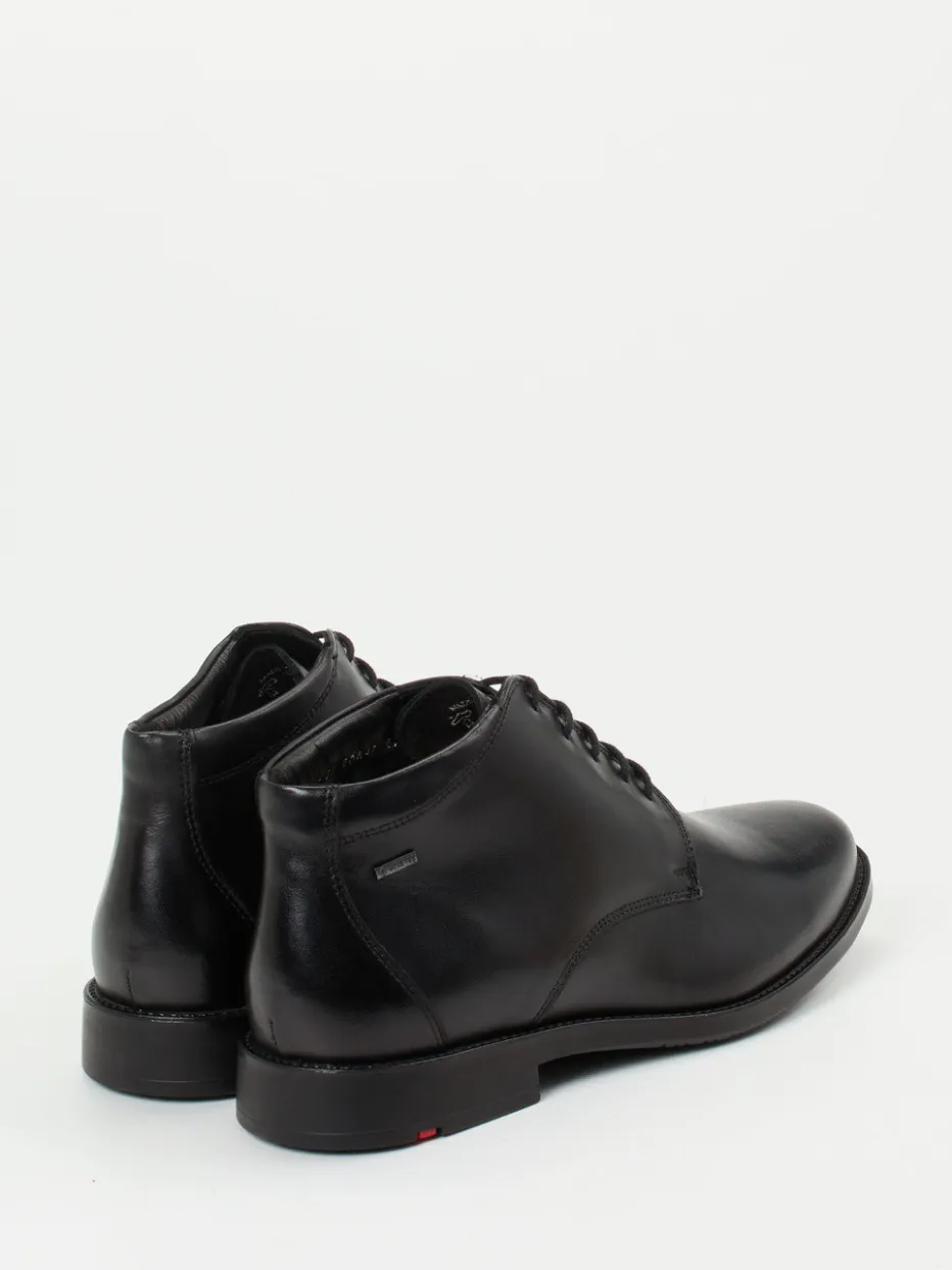 Eleganter Begleiter für urbane Wintertage.Die Marke Lloyd präsentiert mit diesen knöchelhohen Desert Boots ein stilistisch reduziertes Herrenmodell für kalte Tage. Ob im Büro oder unterwegs in der Stadt – das wasser- und winddichte Glattleder mit glänzender Oberfläche überzeugt durch wetterfeste Eigenschaften und ästhetische Klarheit. Seine schwarze, unifarbene Optik mit Ton-in-Ton-Nähten, dezentem Branding sowie einer roten Akzentlinie in der profilierten Gummisohle betont den klassisch-minimalistischen Charakter. Die wärmende Wollfütterung bietet angenehmen Komfort an kühlen Tagen. Rundet gepflegte Business-Looks unauffällig stilvoll ab – mit gewohnt hochwertigem Lloyd-Finish.