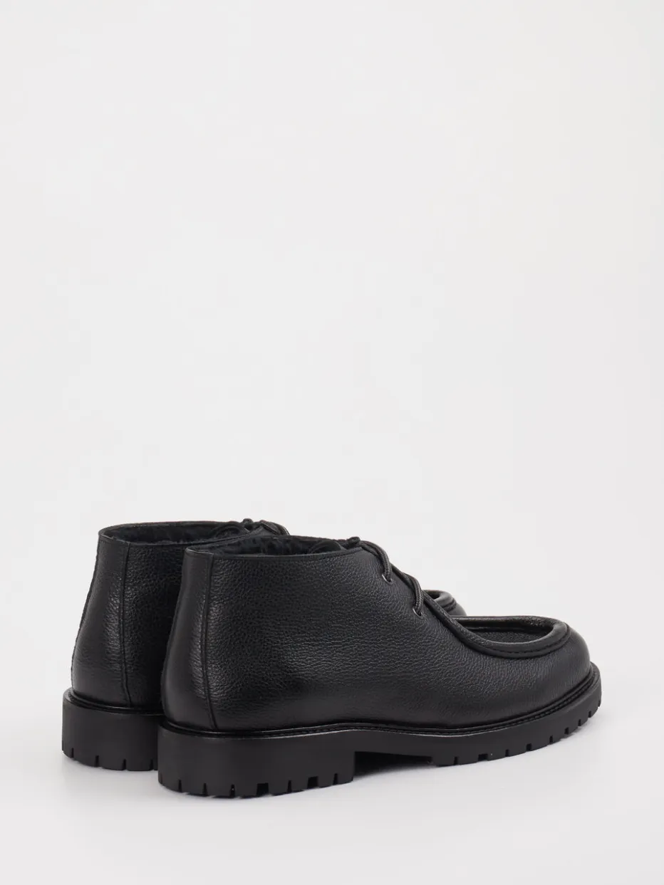 Stilsicher durch die kalte Jahreszeit. Konstantin Starke präsentiert klassische Desert Boots für Herren. Perfekt für kühle Alltagssituationen, überzeugen diese Schnürboots durch ihr genarbtes Kalbleder in tiefem Schwarz. Die Rundsilhouette, tonale Nähte und matte Metallösen unterstreichen den dezenten Look. Innen wärmt ein Lammfellfutter, während die ausgeprägte Gummisohle optimalen Halt auf unebenem Untergrund bietet. Inspiriert von Workwear und Quiet Luxury, passen die Boots ideal zu urbanem Layering. Besonders gut kombinierbar mit Wollsocken und markanten Outdoor-Jacken. Ein komfortabler Begleiter mit funktionaler Ästhetik und klarer Linienführung.
