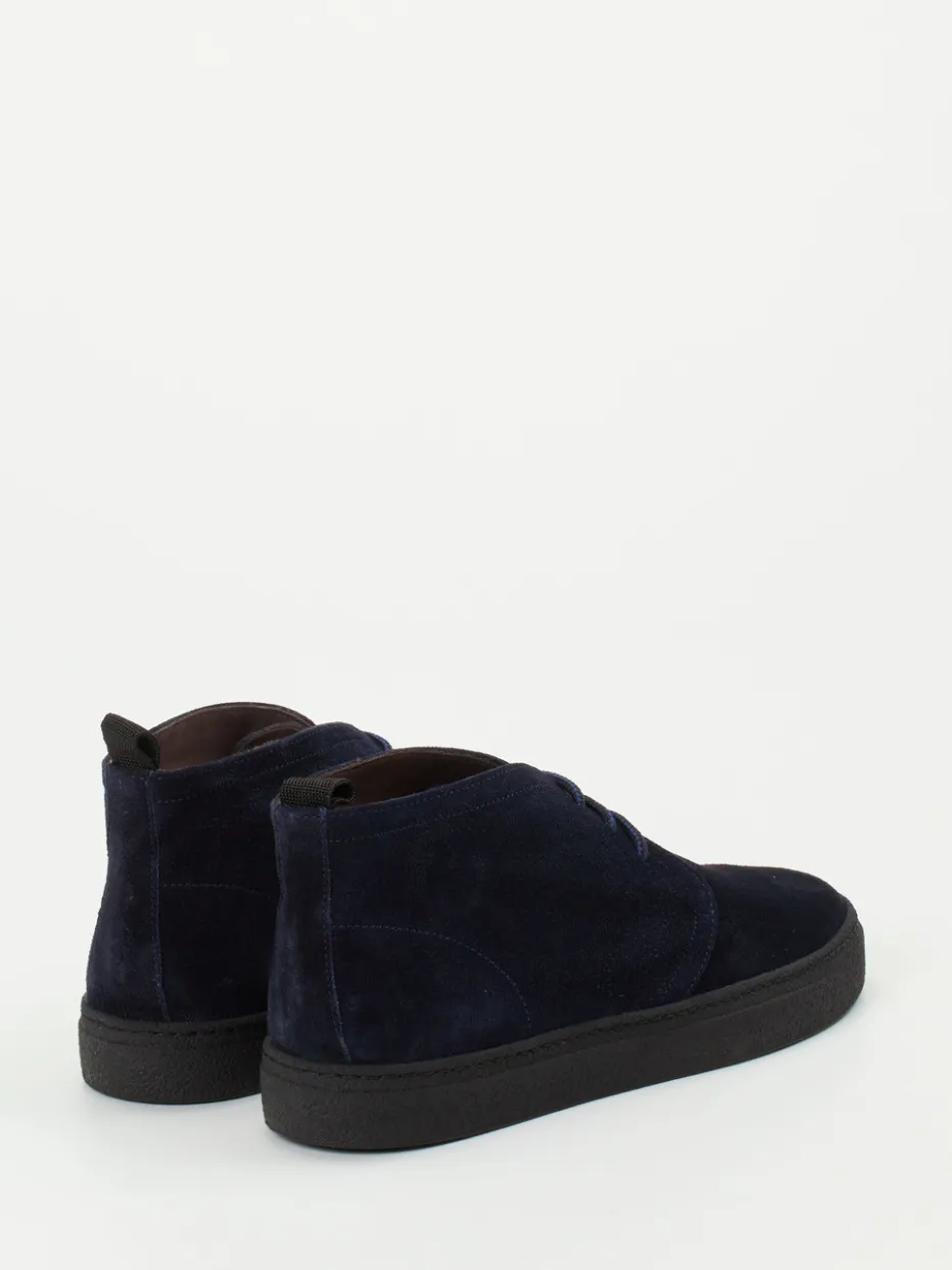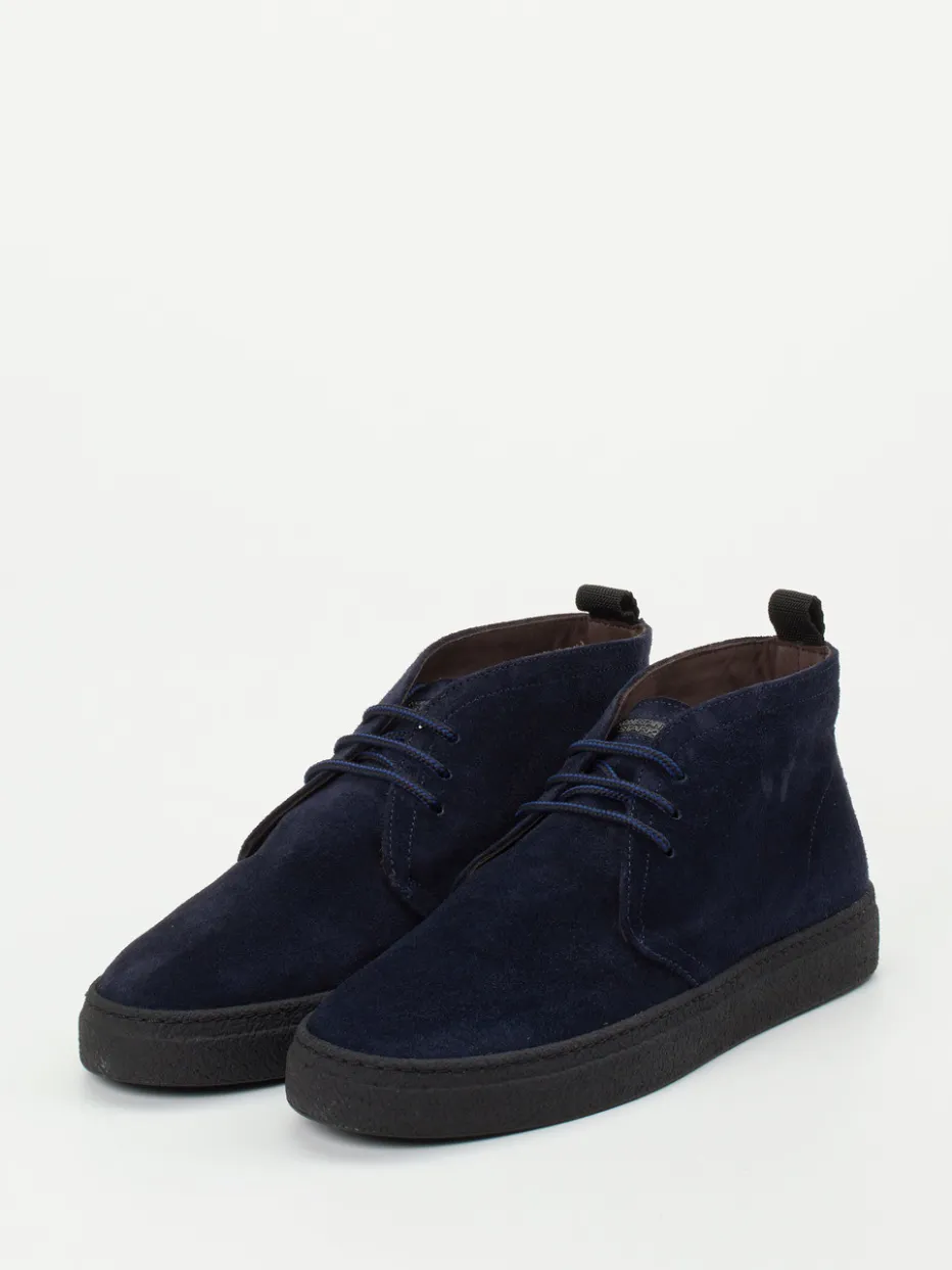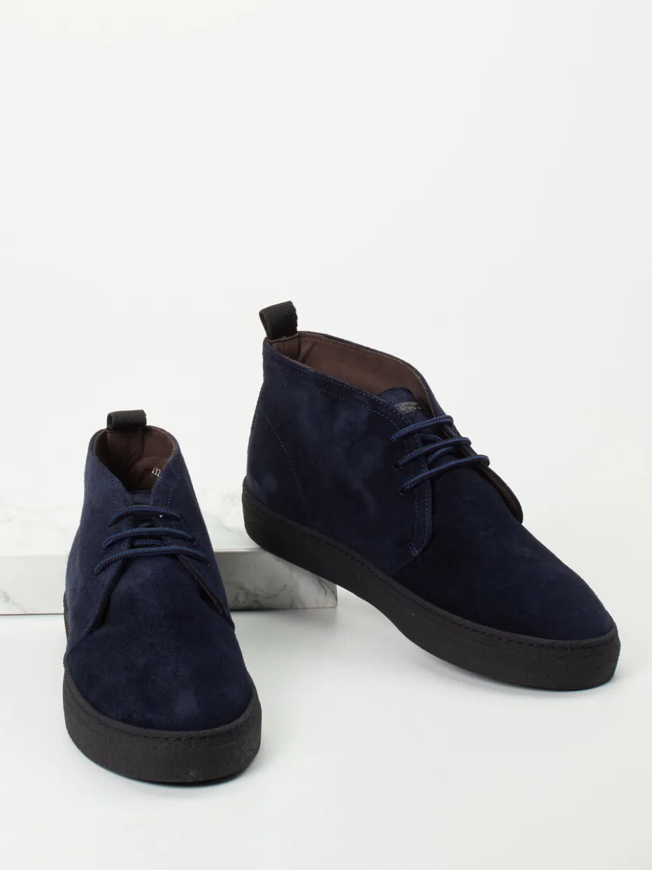 Minimalistisches Design, maximaler Stil.Konstantin Starke bringt mit diesen Desert Boots einen modernen Klassiker für Herren hervor. Ob im Büro oder in der Freizeit: Das dunkelblaue Veloursleder mit samtig-matter Oberfläche überzeugt durch dezente Ton-in-Ton-Nähte und eine klare, knöchelhohe Silhouette. Die minimalistisch gestaltete Dreilochschnürung, eine schwarze Zuglasche sowie die flexible Kreppsohle aus Gummi runden das puristische Design ab. Das Innenfutter aus Kalbleder und das weiche Fußbett sorgen für angenehmen Tragekomfort im Alltag. Ideal kombinierbar mit Chinos oder Strickpullover in gedeckten Farben. Ein stilvoller Begleiter für moderne „Quiet Luxury“-Looks mit Understatement.