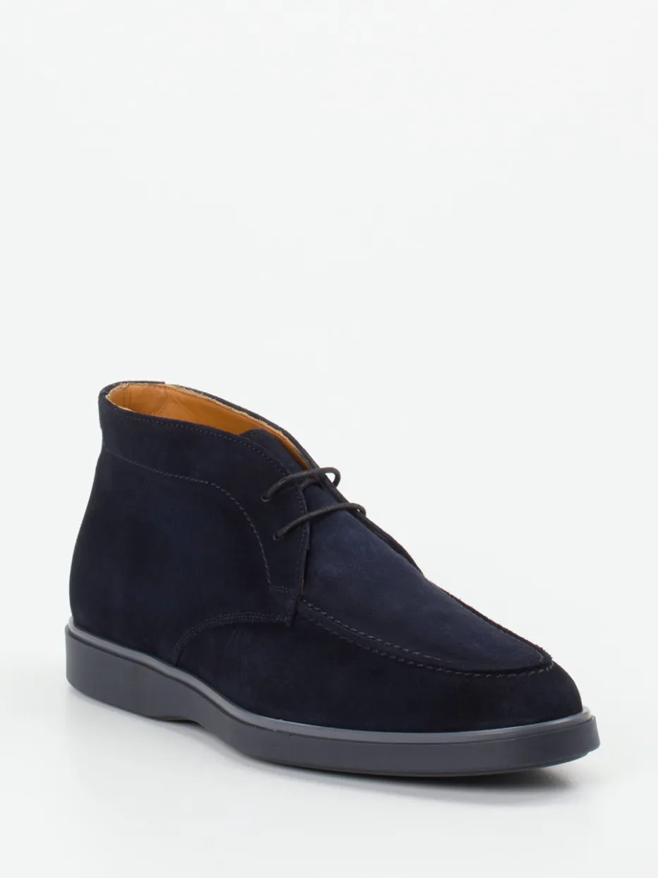 Stilvoll durch kühle Tage.Magnanni präsentiert klassische Herren-Desert Boots in dunkelblauem Veloursleder. Für gepflegte Alltagslooks und stilvolle Büro-Outfits bietet dieser Schnürschuh eine elegante, anklehohe Silhouette mit matter Oberfläche und Ton-in-Ton-Nähten. Die glatte Gummisohle verleiht Halt und einen dezenten sportiven Charakter. Das hellbraune Kalblederfutter sorgt für angenehmen Tragekomfort. Dank des klaren Designs passt das Modell hervorragend zum „Quiet Luxury“-Trend der Saison. Magnanni steht für luxuriöse Qualität mit Understatement – zeitlos und vielseitig kombinierbar.