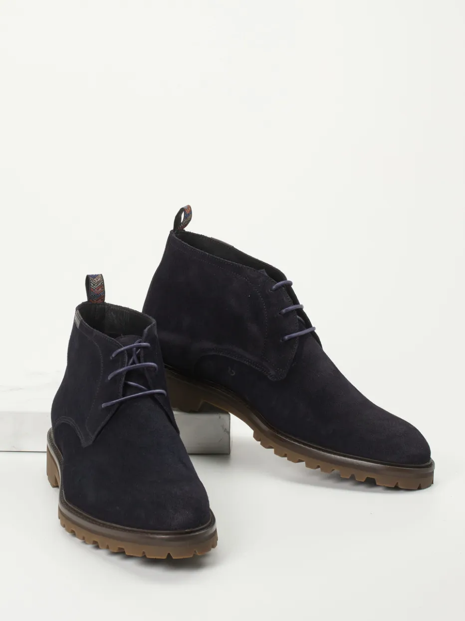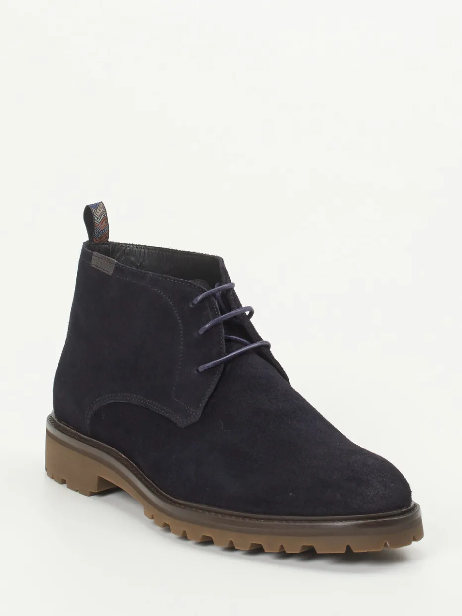 Stilvoll durch windige Tage.Floris van Bommel präsentiert zeitlose Desert Boots für Herren. Gefertigt aus feinstem, samtig angeschliffenem Veloursleder in Navyblau, verbinden diese knöchelhohen Schnürboots klassische Eleganz mit funktionaler Alltagstauglichkeit. Die markante Profilsohle aus Gummi sorgt für zuverlässigen Halt auf nassen Untergründen. Eine auffällige Zuglasche mit Muster setzt einen dezenten Akzent im ansonsten minimalistischen Gesamtbild. Der gepolsterte, herausnehmbare Innenschuh aus Leder verspricht hohen Tragekomfort – auch im Business-Kontext. Durch ihren klaren Look lassen sich die Boots vielseitig kombinieren, etwa mit Chinos und Strick. Ein souveräner Begleiter mit Stilanspruch und subtiles Understatement.