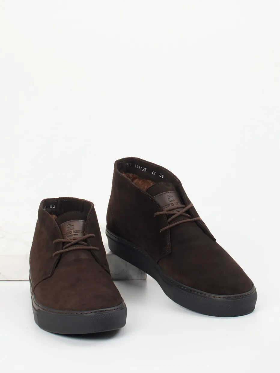 Understatement trifft urbane Eleganz.Die Wiener Manufaktur Ludwig Reiter präsentiert Desert Boots für Herren aus feinstem Veloursleder. Ideal für kühle Tage im Büro oder beim Stadtspaziergang bietet das Modell dank wärmendem Lammfellfutter angenehmen Tragekomfort. Das dunkelbraune, matt strukturierte Veloursleder verleiht eine maskuline, minimalistische Ästhetik, während die knöchelhohe Silhouette mit tonaler Zweiloch-Schnürung dezent akzentuiert. Die schwarze Gummisohle in Sneaker-Optik ergänzt stilvoll den urbanen Look und sorgt für Trittsicherheit. Perfekt kombinierbar mit Chinos oder dunkler Denim passt der Schuh in moderne Capsule-Garderoben. Ein Klassiker von Ludwig Reiter mit souveräner Verarbeitung und zeitlosem Stil.