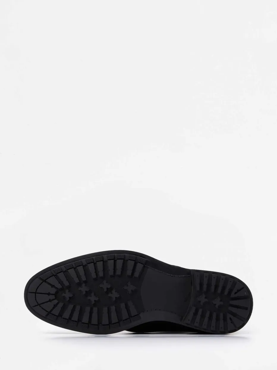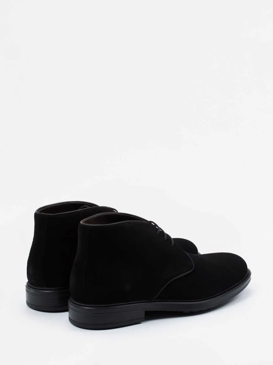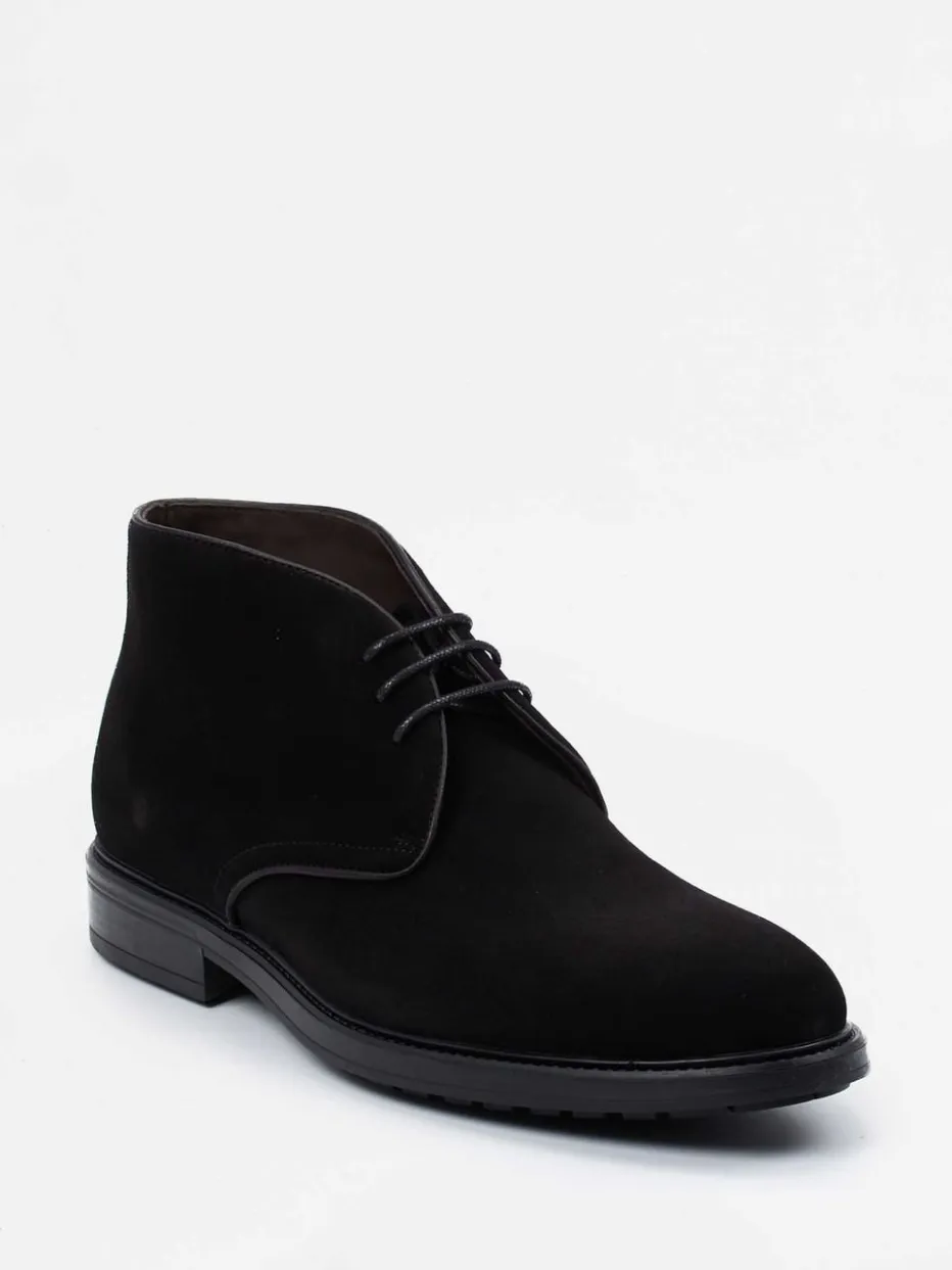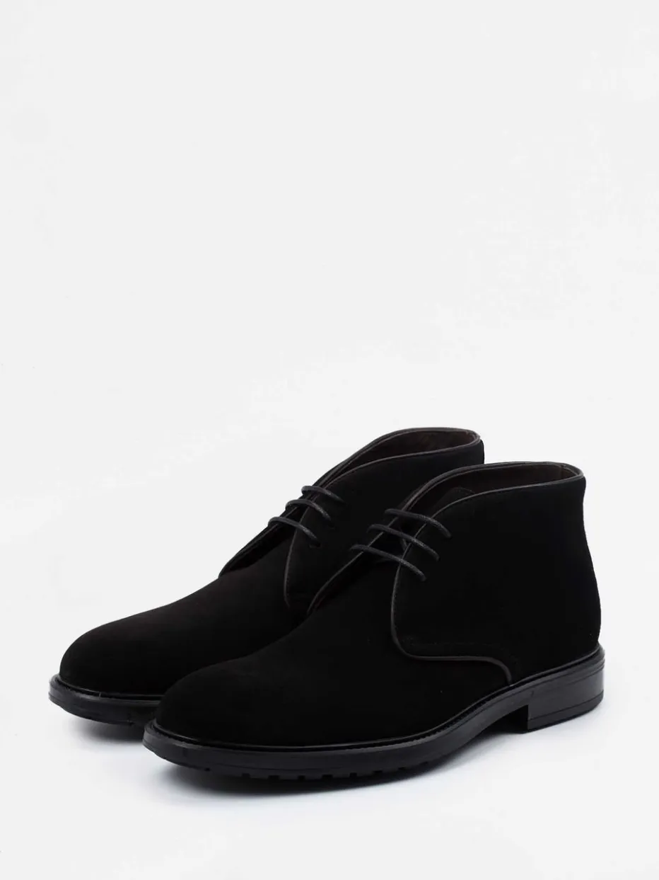Stilbewusst durch Büro und Alltag.Ralph Harrison präsentiert mit diesen Desert Boots ein Herrenmodell, das zeitlose Eleganz ausstrahlt. Für urban orientierte Männer, die einen markanten Look mit dezentem Statement suchen, ist dieses Modell ideal. Gefertigt aus hochwertigem Veloursleder, samtig angeschliffen und in mattem Schwarz, überzeugt der knöchelhohe Schuh mit klarer Silhouette. Ton-in-Ton-Nähte, ein minimalistisches Design sowie eine profilierte Gummisohle mit sicherem Grip unterstreichen die funktionale Raffinesse. Die 3-Loch-Schnürung sorgt für strukturierten Halt, während der dezente Materialkontrast durch das Kalblederfutter Zusatzkomfort ermöglicht. Passend zu „Quiet Luxury“ und Business Casual – etwa kombiniert mit Chinohose und Strickpullover. Vielseitigkeit und Qualität im maskulinen Stil von Ralph Harrison.