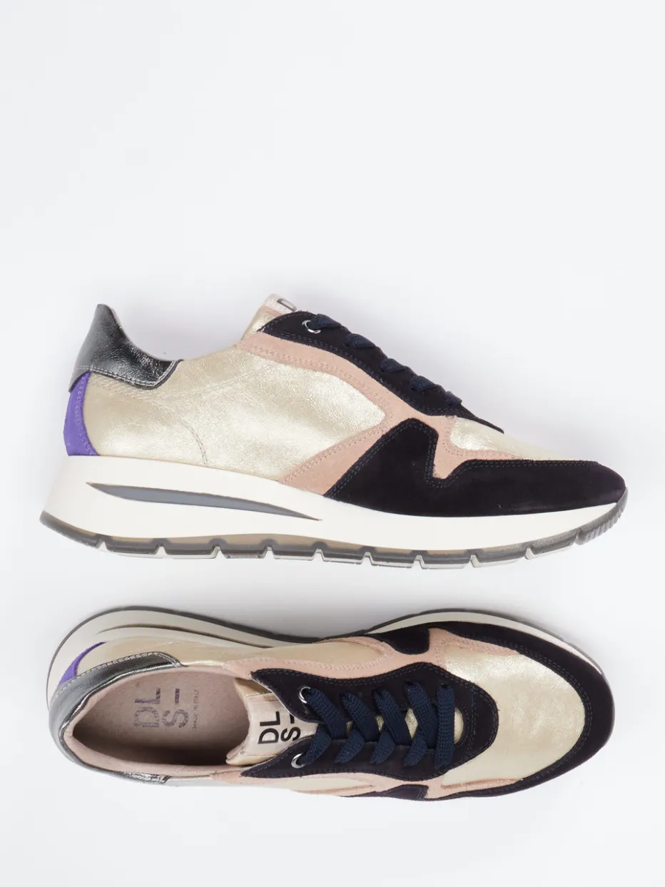 Modischer Kontrast für urbane Looks.DL Sport präsentiert einen komfortablen Fashion-Sneaker für Damen mit besonderem Anspruch. Ideal für trendorientierte Freizeitmomente kombiniert dieses Modell multifarbenes Metallicleder mit velourartigen Partien und tonal abgesetzten Farbflächen. Die glänzenden Obermaterialien unterstreichen den Mix aus Retro-Running-Silhouette und moderner Streetwear-Ästhetik. Farbdetails in Champagner-Gold, Dunkelblau, Rosébeige und Violett schaffen auffällige Akzente. Eine profilierte Gummisohle mit Keil betont die sportliche Note und sorgt für sicheren Halt. Dank Schnürung und gepolsterter Ferse entsteht ein angenehmes Tragegefühl. Ein trendiger Stilpartner für entspannte City-Looks mit femininer Raffinesse.
