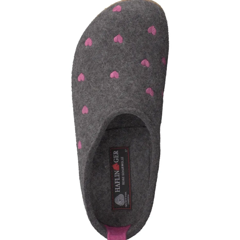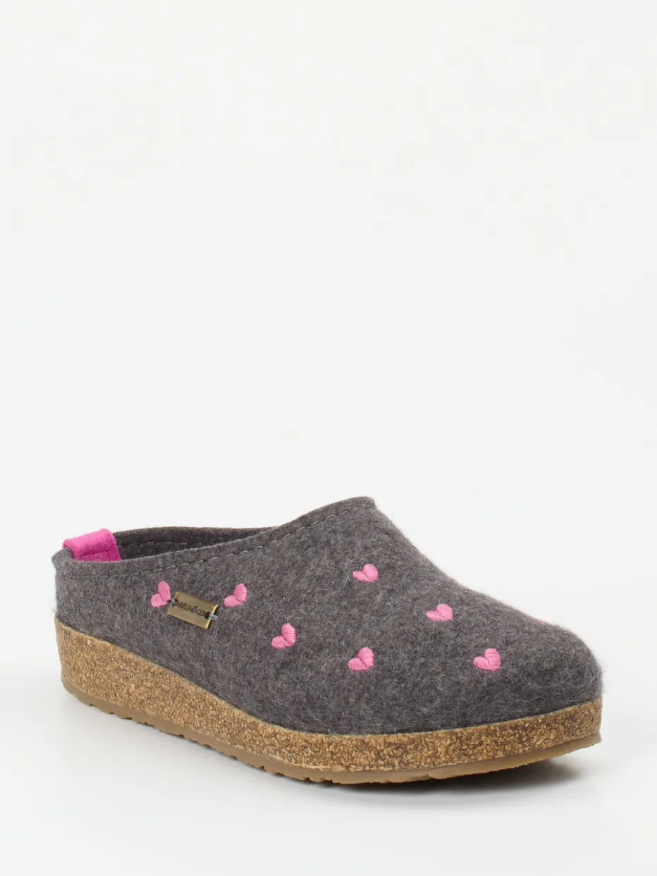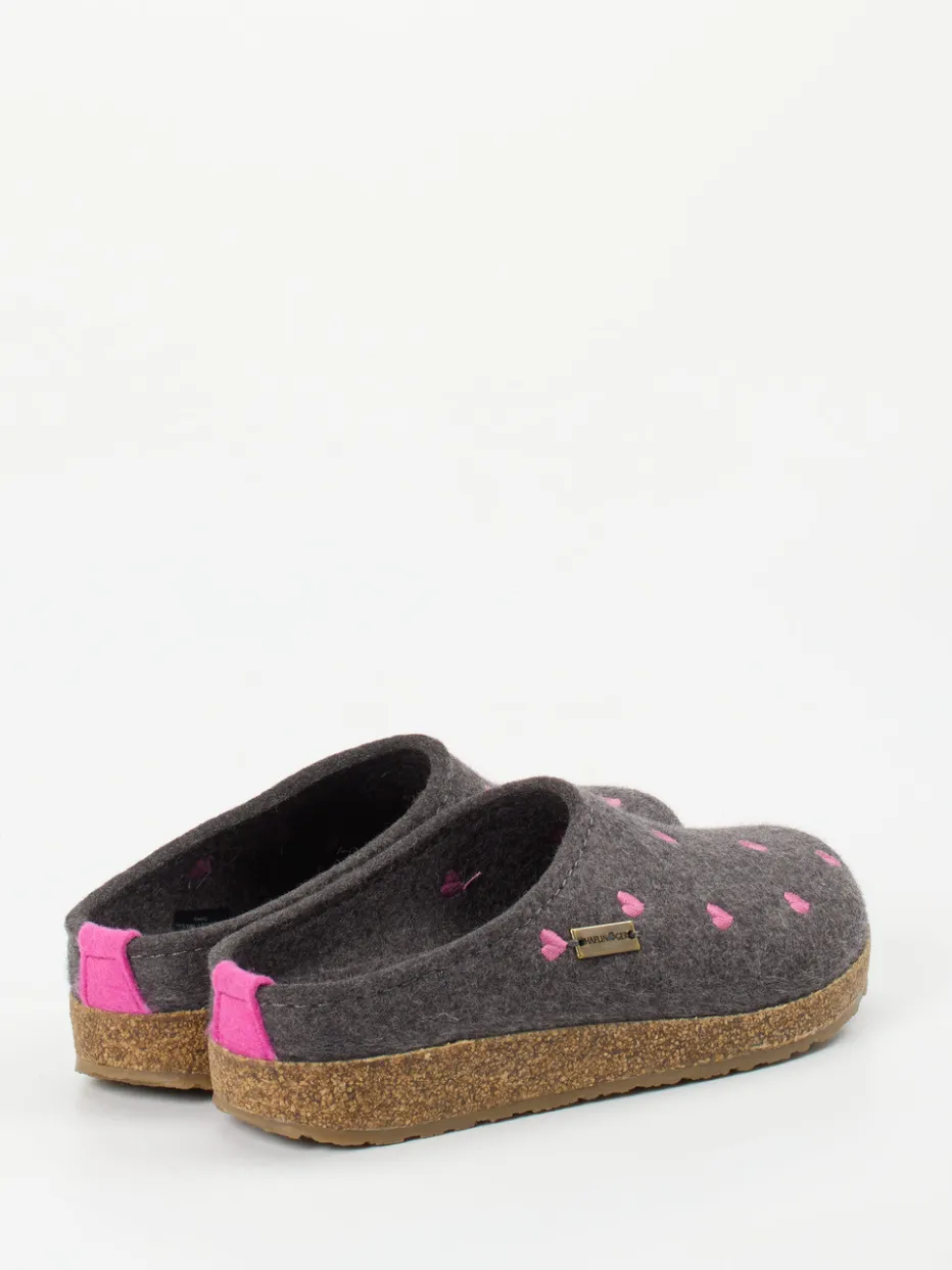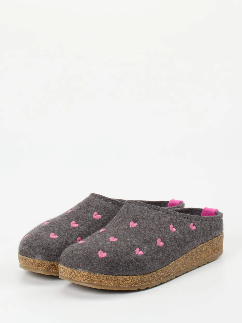 Wärme trifft skandinavische Gemütlichkeit.Haflinger präsentiert mit diesen Damen-Filzclogs einen rundum durchdachten Hausschuh. Ideal für entspannte Stunden zu Hause überzeugt das Modell durch atmungsaktive Schurwolle in filziger Textur, anthrazitgraue Optik und dekorative Herzstickereien auf dem Spann. Der pinkfarbene Fersenbesatz setzt einen stilvollen Akzent, während das geformte Korkfußbett ergonomischen Halt bietet. Die rutschhemmende Gummisohle sorgt für Sicherheit auf glatten Böden. Inspiriert vom Cozy Living-Trend ergänzt dieser Schuh jedes entspannte Outfit – von Wollsocken bis Fleeceanzug. Komfort und Design auf typisch haflingerische Art – hochwertig, langlebig, charmant.