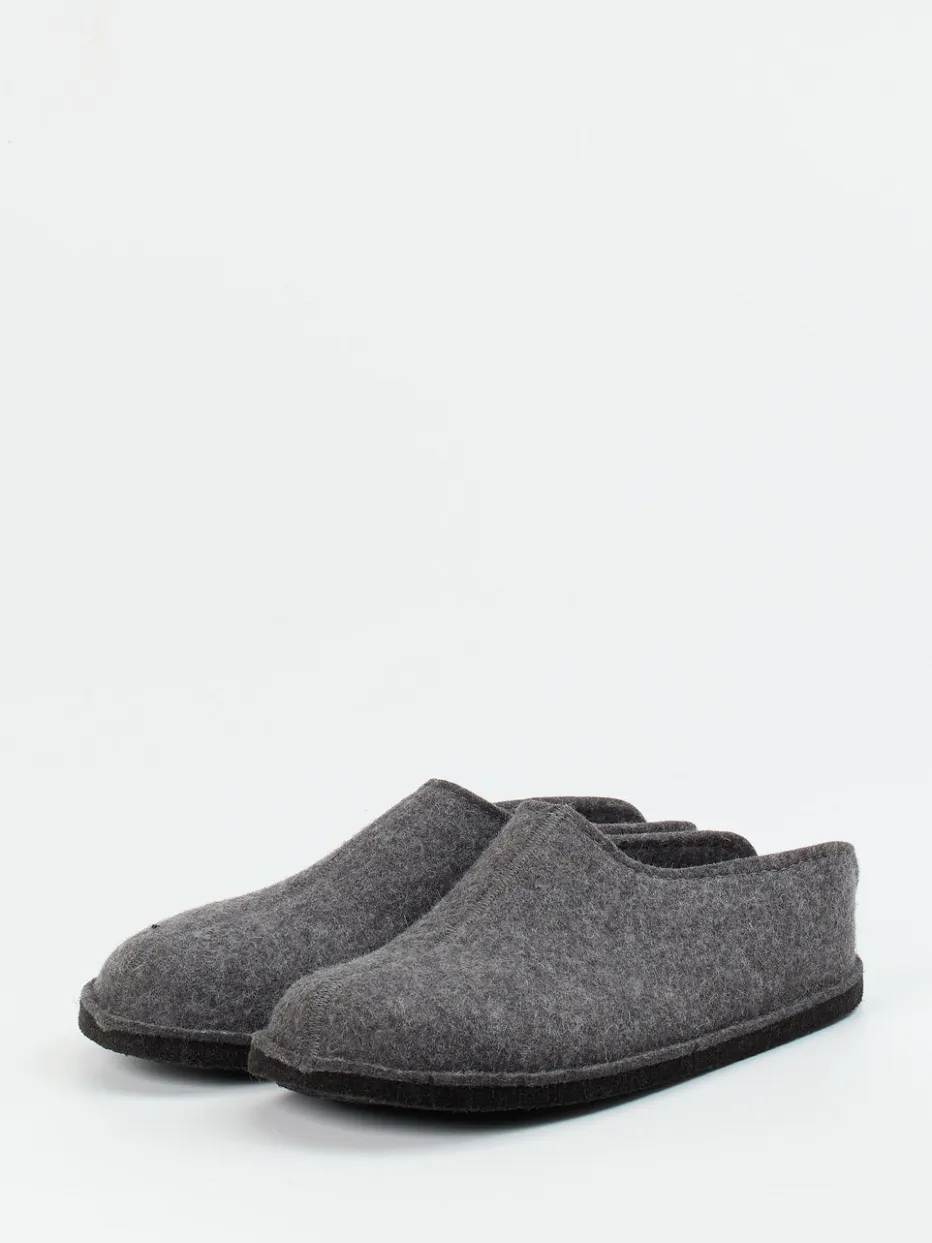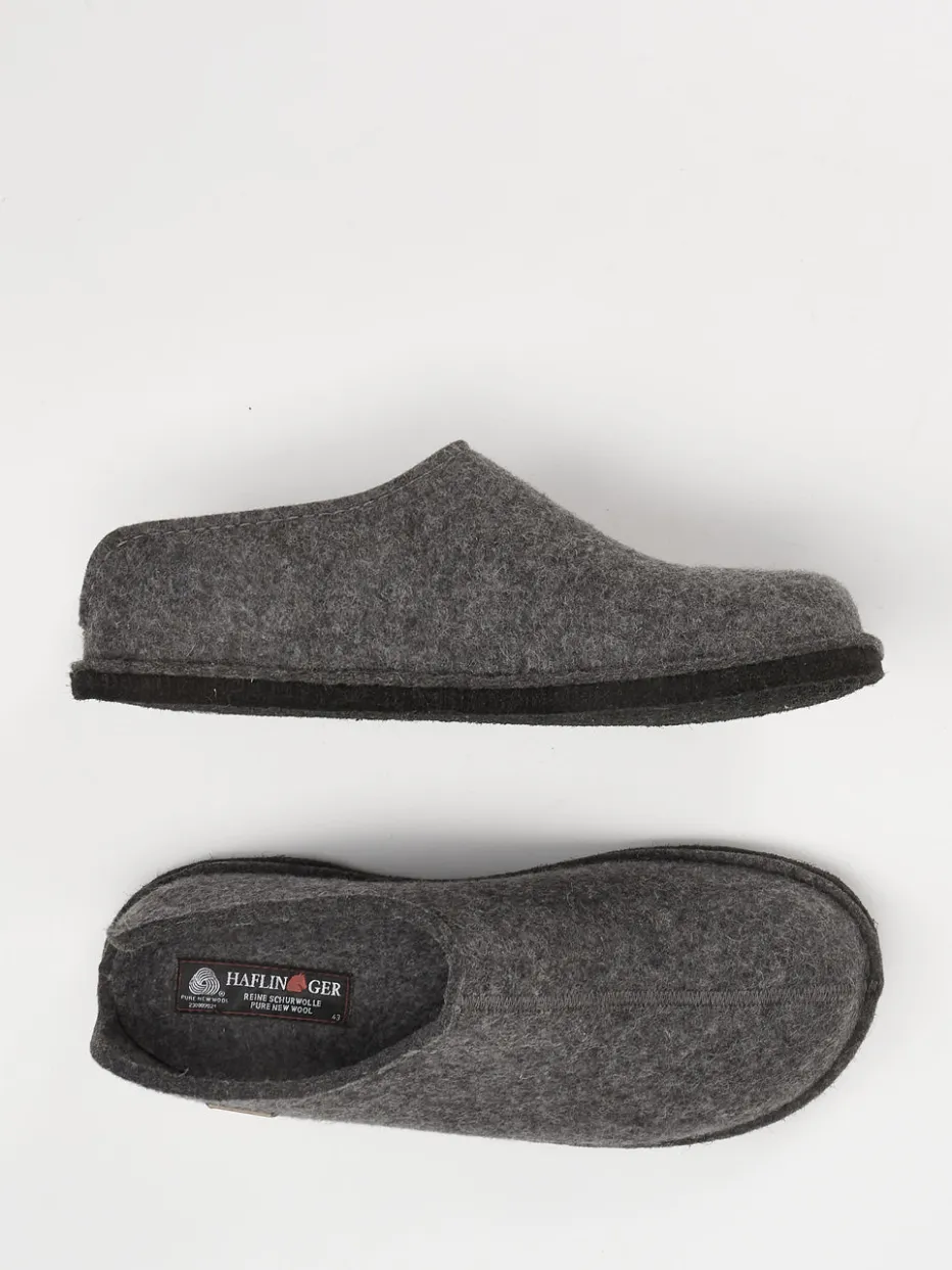 Haflinger präsentiert mit diesem Filzpantoffel einen hochwertigen Hausschuh aus reiner Wolle. Die anthrazitgraue Ausführung aus gewalktem Schurwollfilz schützt zuverlässig vor Bodenkälte und passt mit seinem puristischen Look in jedes Wohnambiente.