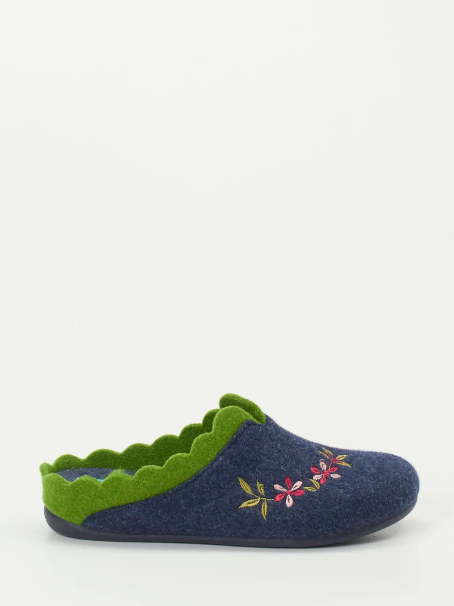 Dank des samtig-filzigen Filzmaterials sorgt das Modell für angenehme Wärme und ein behagliches Tragegefühl. Die dunkelblaue Farbgebung wird durch eine detailreiche Stickerei in Himbeerrosa und Moosgrün akzentuiert. Der offene Fersenbereich erleichtert das Hineinschlüpfen, während die biegsame, rutschhemmende Gummisohle sicheren Halt bietet. Die Innensohle ist weich gepolstert und unterstützt den Fuß bei jedem Schritt. Perfekt für stilbewusste Loungewear-Looks und wohlige Wintertage.