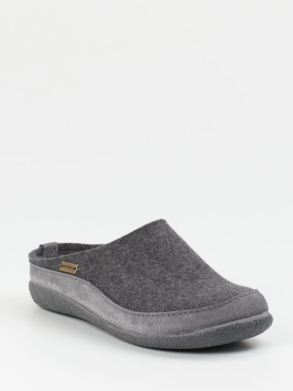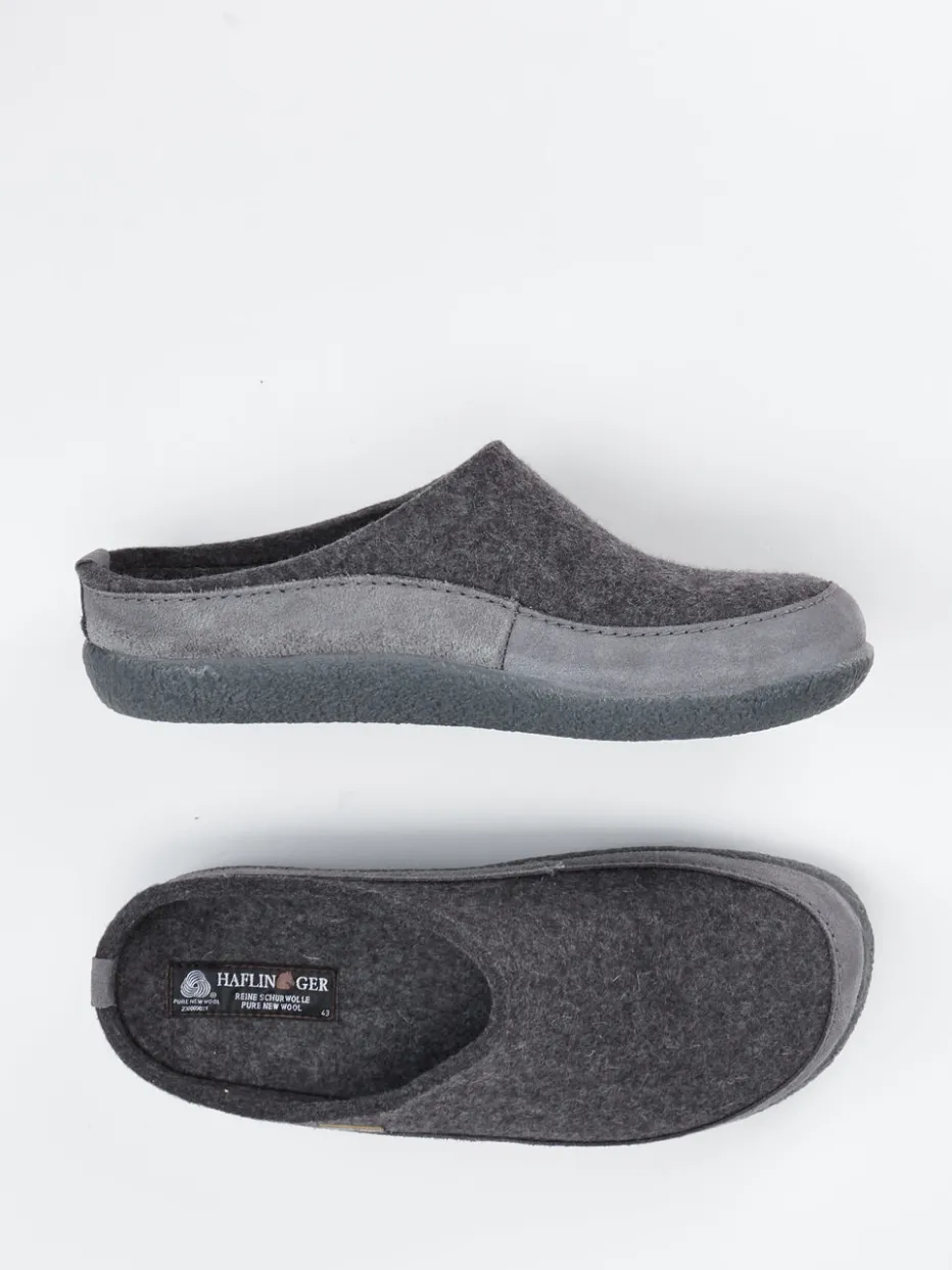 Wärme trifft Struktur.Die Marke Haflinger steht für Qualität im Bereich Hausschuhe – diese Filzpantoffeln machen das eindrucksvoll deutlich. An kühleren Tagen schenken die aus gewalkter reiner Schurwolle gefertigten Pantoffeln wohltuende Wärme. Das weich-filzige Material in Anthrazitgrau trifft auf eine rutschhemmende Gummisohle mit ergonomischer Formgebung. Der offene Fersenbereich in Clog-Optik und die dezente Veloursleder-Kappe bieten Komfort und haltgebenden Sitz. Seitliches Metall-Label, strukturierte Laufsohle und die minimalistische Silhouette unterstreichen den entspannten Look. Perfekt abgestimmt auf Loungewear und entspannte Homewear. Hochwertige Verarbeitung und angenehmes Trageklima – typisch Haflinger.