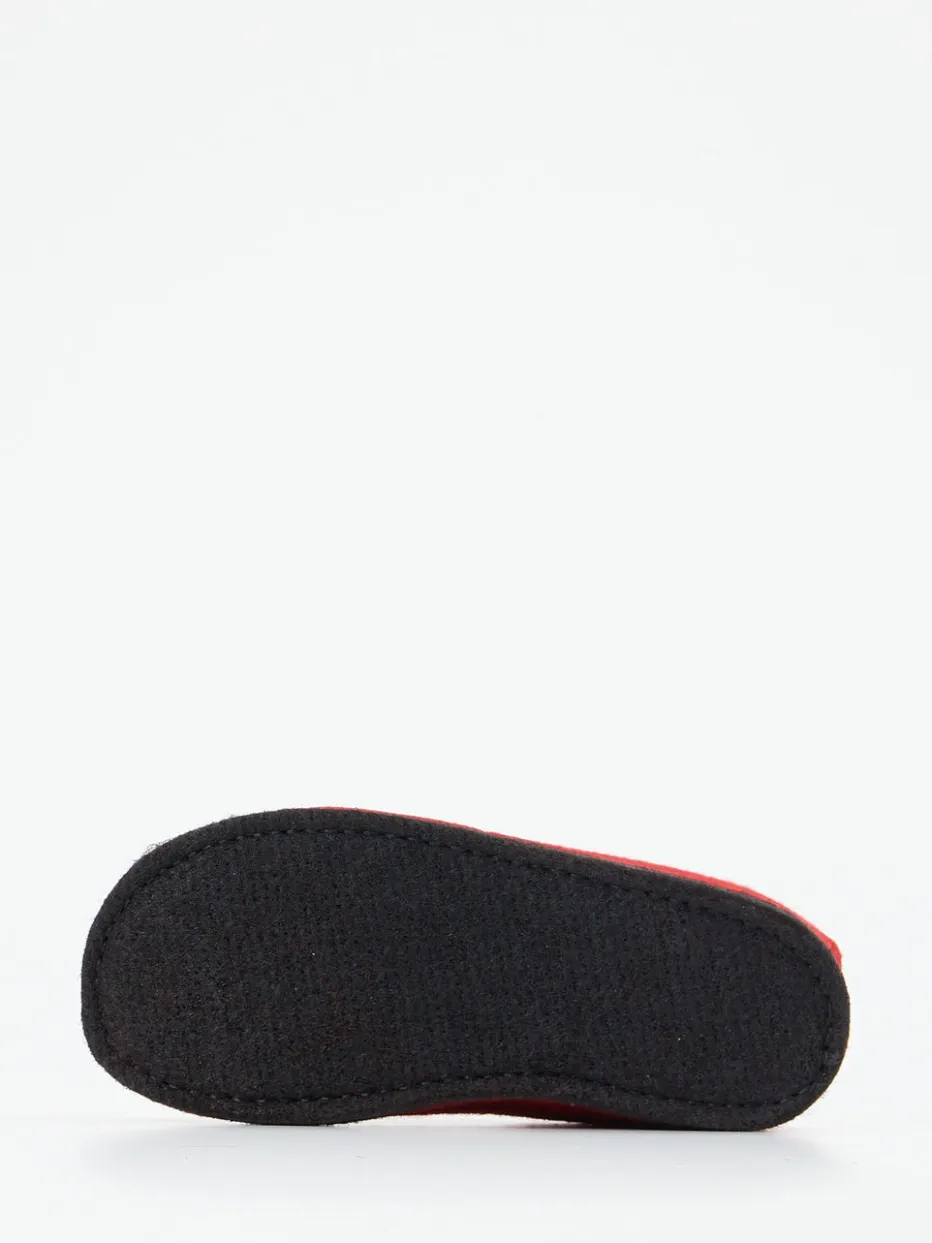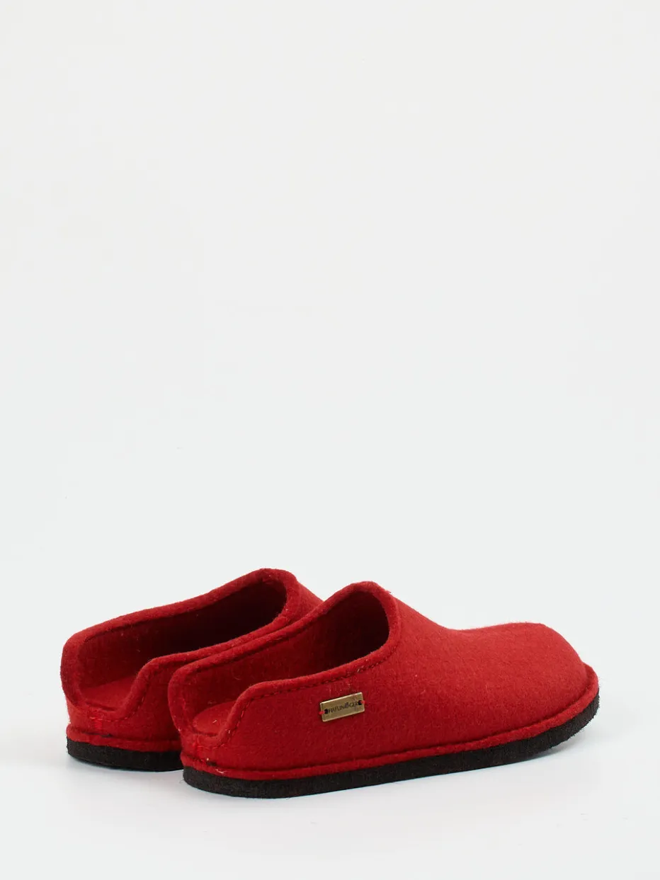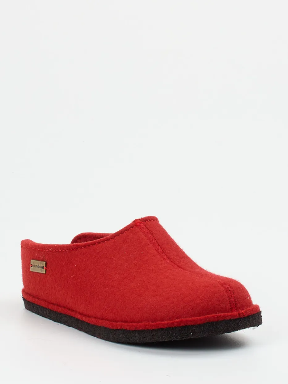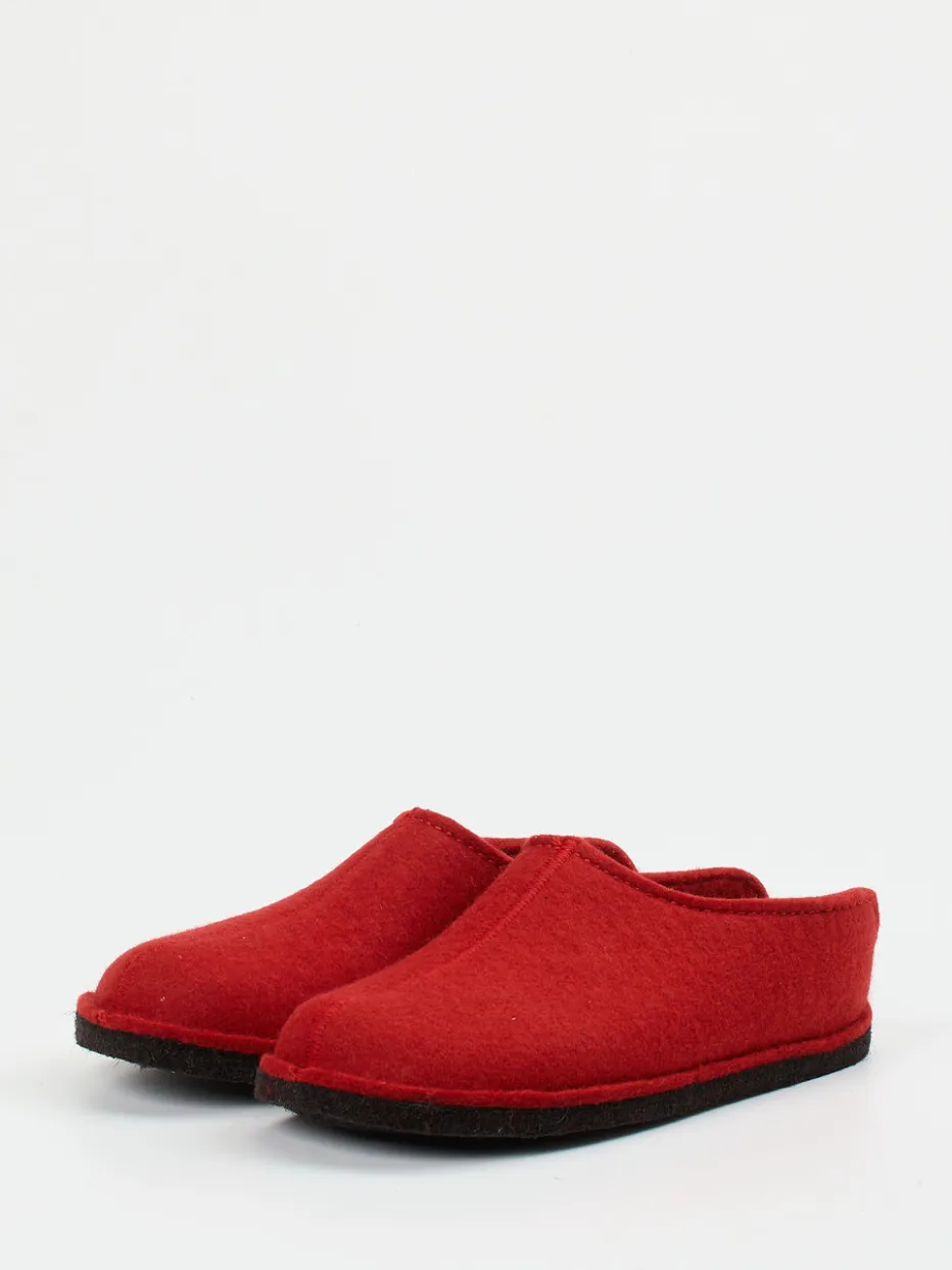 Wärme trifft auf klare Form.Haflinger bietet mit diesen Filzhausschuhen einen durchdachten Begleiter für entspannte Stunden daheim. Signalrote Schurwolle mit matter Oberfläche sorgt nicht nur für visuelle Präsenz, sondern auch für atmungsaktive Wärme. Das geschlossene, niedrig geschnittene Design mit elastischem Schaft und Weichtritt bietet sicheren Halt im Alltag. Eine rutschhemmende, schwarze Gummisohle stabilisiert auf glatten Böden, während die dezente Metall-Label-Applikation minimalistischen Stil unterstreicht. Inspiriert vom skandinavischen Wohlgefühl, passt der Schuh hervorragend zu loungigen Indoor-Looks, etwa mit Wollsocken oder soften Hausanzügen. Nachhaltige Materialien und klare Linien zeichnen diese Haflinger-Pantoffeln aus.
