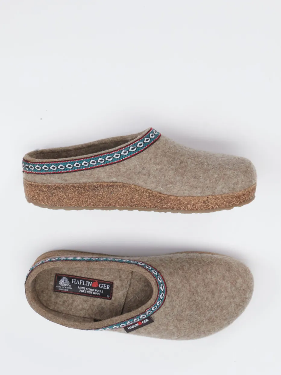 Natürlich, warm und stilvoll zugleich.Die Marke Haflinger präsentiert mit diesen Filzpantoffeln ein gemütliches Modell für zuhause. Ideal für ruhige Momente daheim sorgen das Obermaterial aus filzartigem Schurwollfilz und das ergonomische Korkfußbett für natürlichen Komfort und nachhaltige Qualität. Das beigebraune Design mit petrolgrüner und dunkelroter Ethno-Bordüre verleiht dem Modell einen alpinen Charakter. Dank offener Ferse und rutschhemmender Gummilaufsohle überzeugt der Schuh auch funktional. Inspiriert vom Slow-Living-Trend ist er besonders für komfortorientierte Trägerinnen und Träger geeignet. Kombiniert mit Wollsocken oder einem weichen Fleeceanzug entsteht ein stimmiger Look. Ein Klassiker im Zeichen von Qualität und Naturverbundenheit.