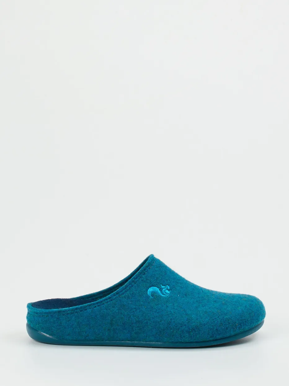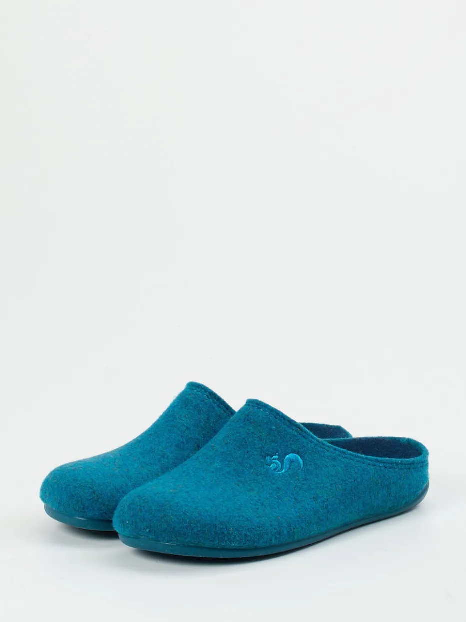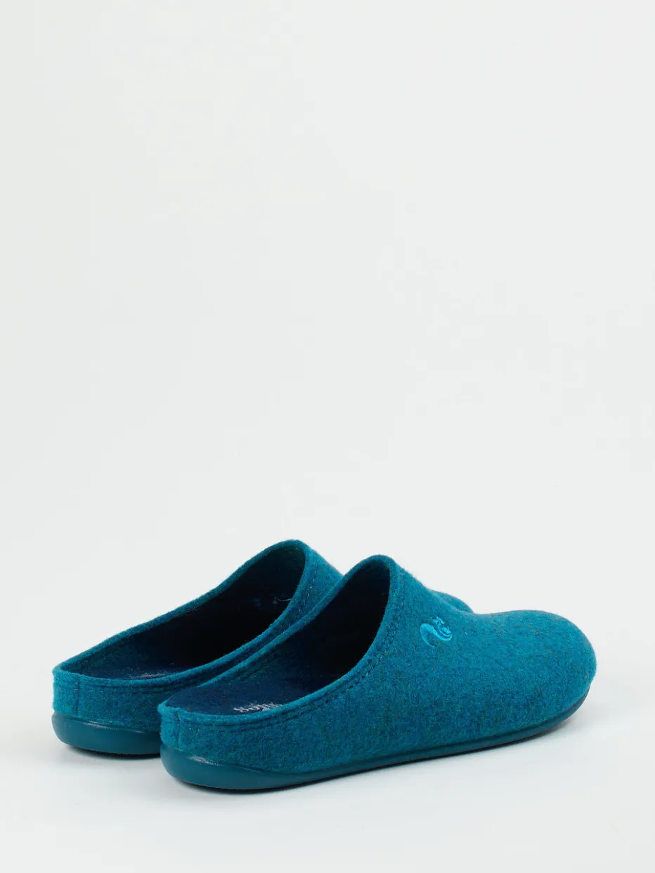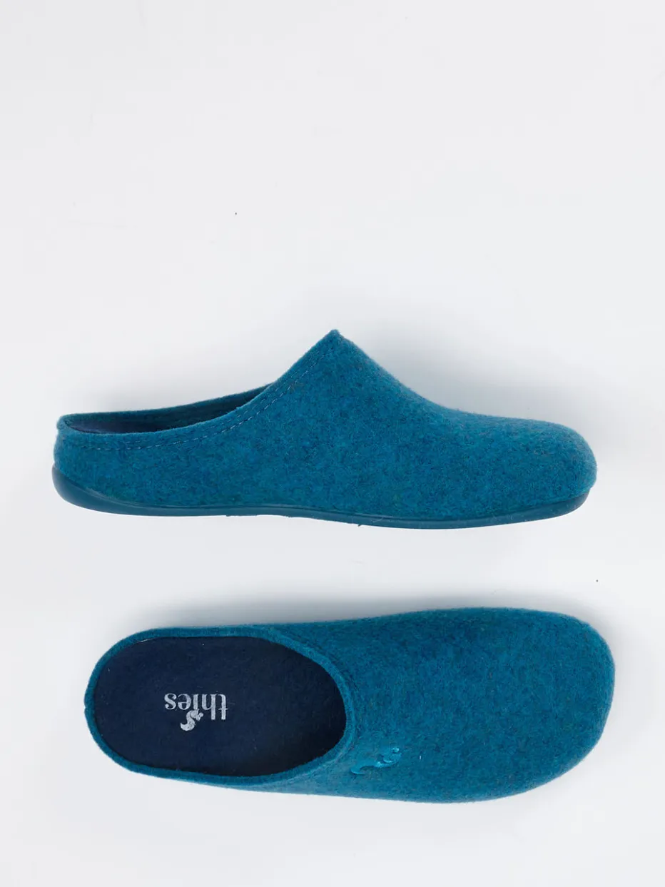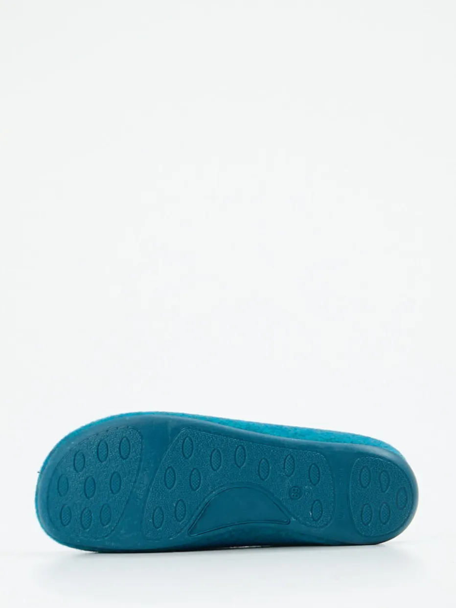 Wohlfühlkomfort für entspannte Momente.Thies präsentiert mit diesem Modell ein Paar Filzpantoffeln für stilvolles Relaxen zu Hause. Die geschlossene Vorderkappe und die ergonomisch geformte, gepolsterte Innensohle aus recyceltem Filzmaterial bieten Komfort und Stabilität. Der petrolblaue Farbton verleiht dem minimalistischen Design eine moderne Note, unterstützt durch die tonale Stickerei auf dem Obermaterial. Die offene Fersenpartie im Clog-Stil sorgt für schnelles Hineinschlüpfen, während die rutschhemmende Gummisohle sicheren Halt auf glatten Böden gewährleistet. Skandinavische Designeinflüsse treffen hier auf den Trend „Quiet Luxury“. Ein bewährter Winterklassiker mit nachhaltigem Anspruch und durchdachtem Tragekomfort.