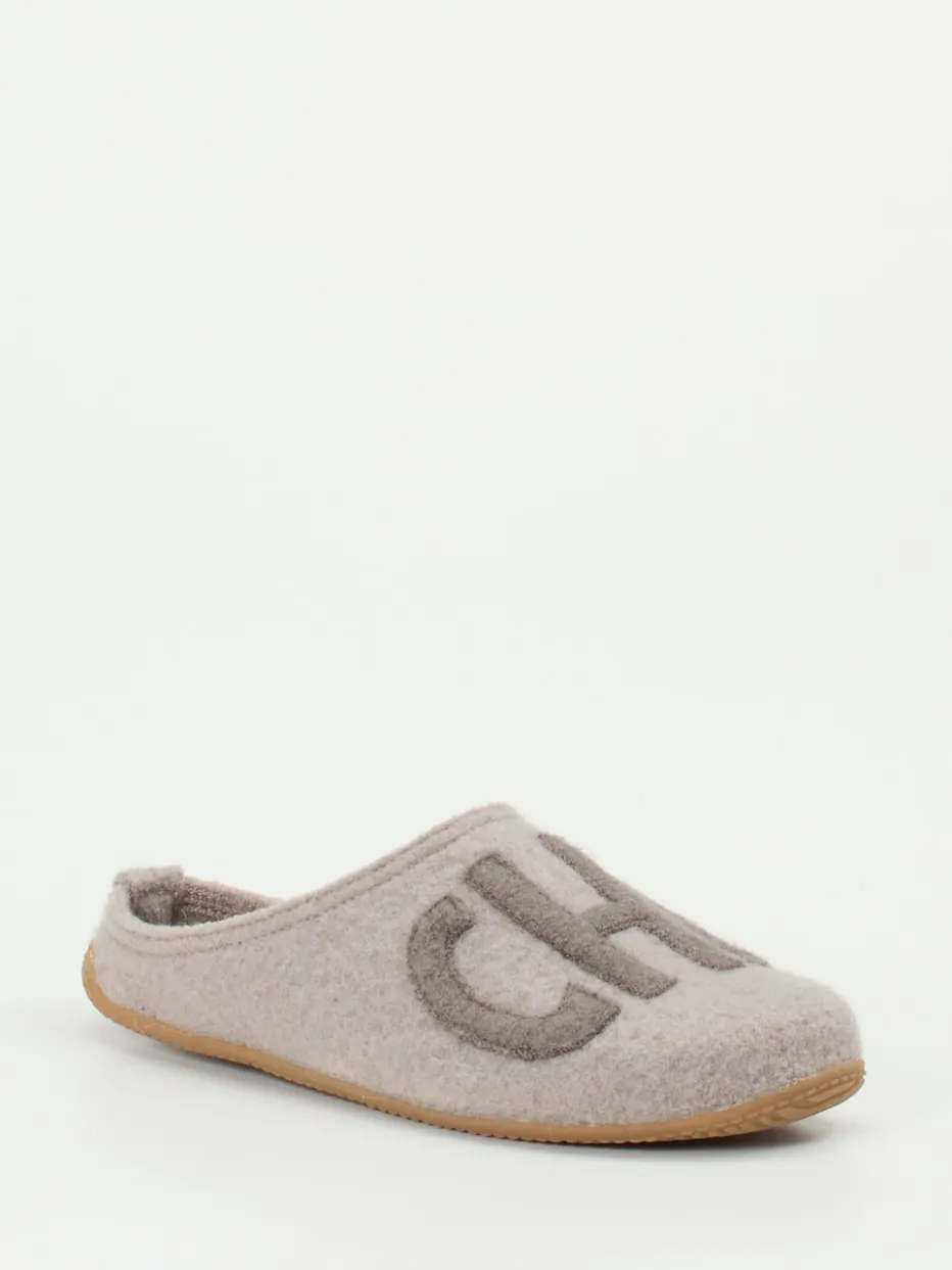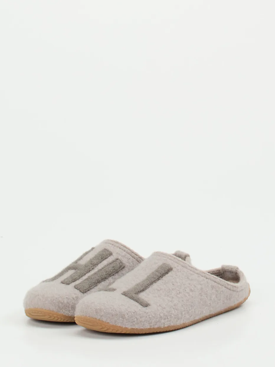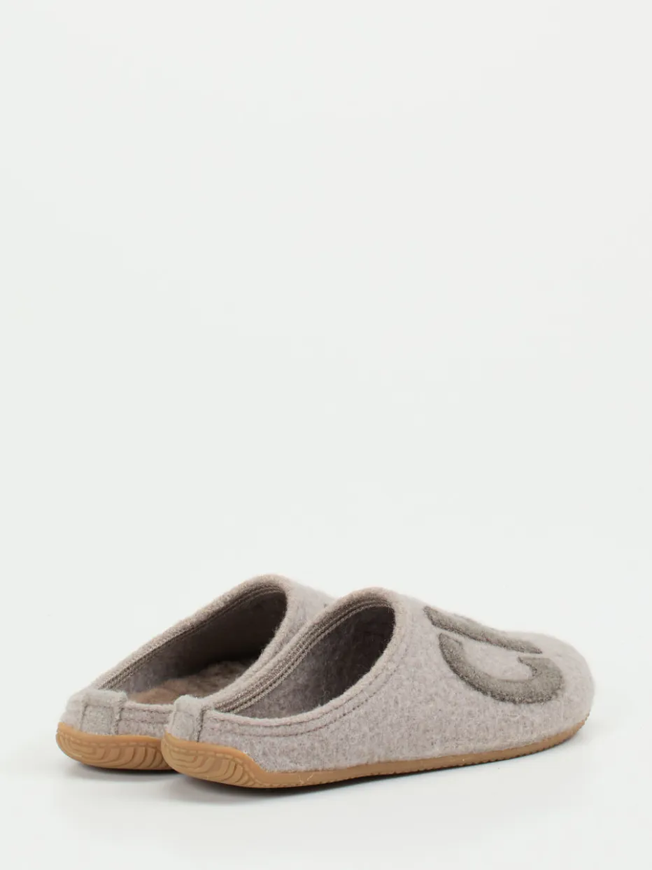 Ideal für entspannte Stunden daheim bieten die Pantoletten aus gewalkter Schurwolle ein besonders weiches Tragegefühl. Der filzige Wollfilz reguliert Temperatur und Feuchtigkeit, während die profilierte Gummisohle sicheren Halt auf glatten Böden verspricht. Optisch punktet das Modell mit hellgrauer Farbgebung, offener Fersenpartie im Mule-Stil und markentypischem „CHILL“-Lettering in Ton-in-Ton-Optik. Inspiriert von Loungewear-Trends fügt sich das Design nahtlos in entspannte Looks ein – vom Fleece-Set bis zu Kuschelsocken.