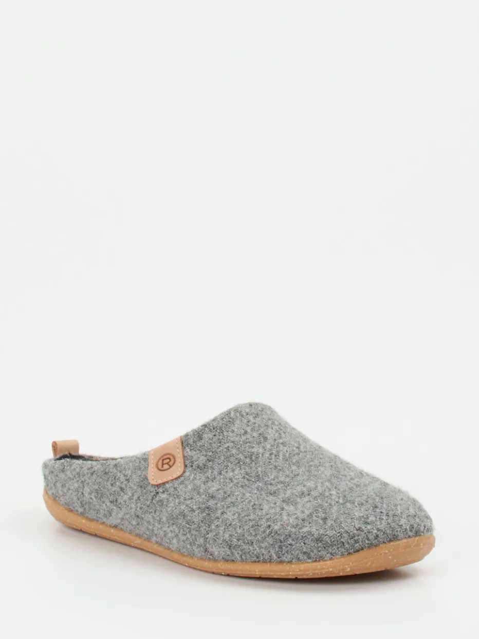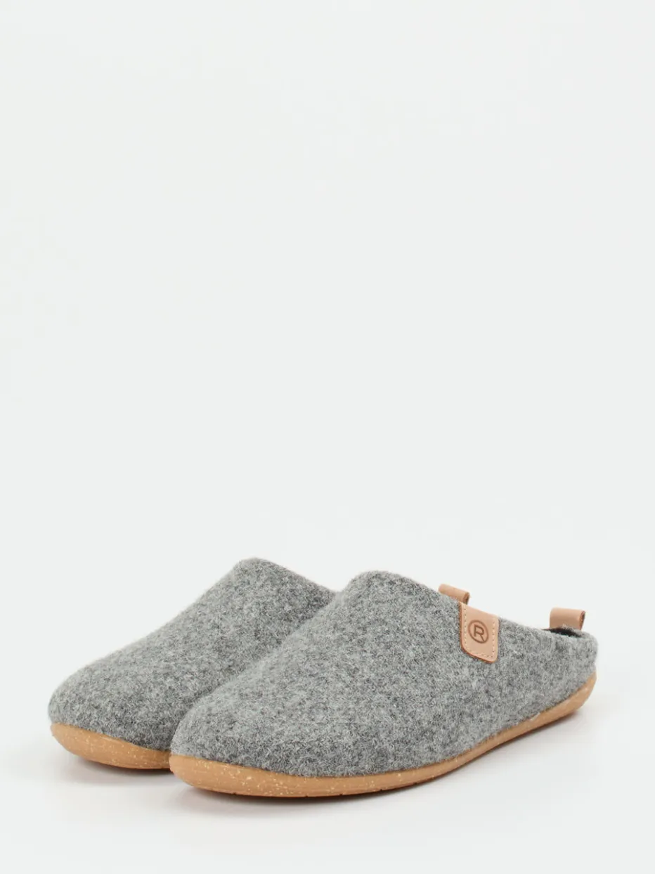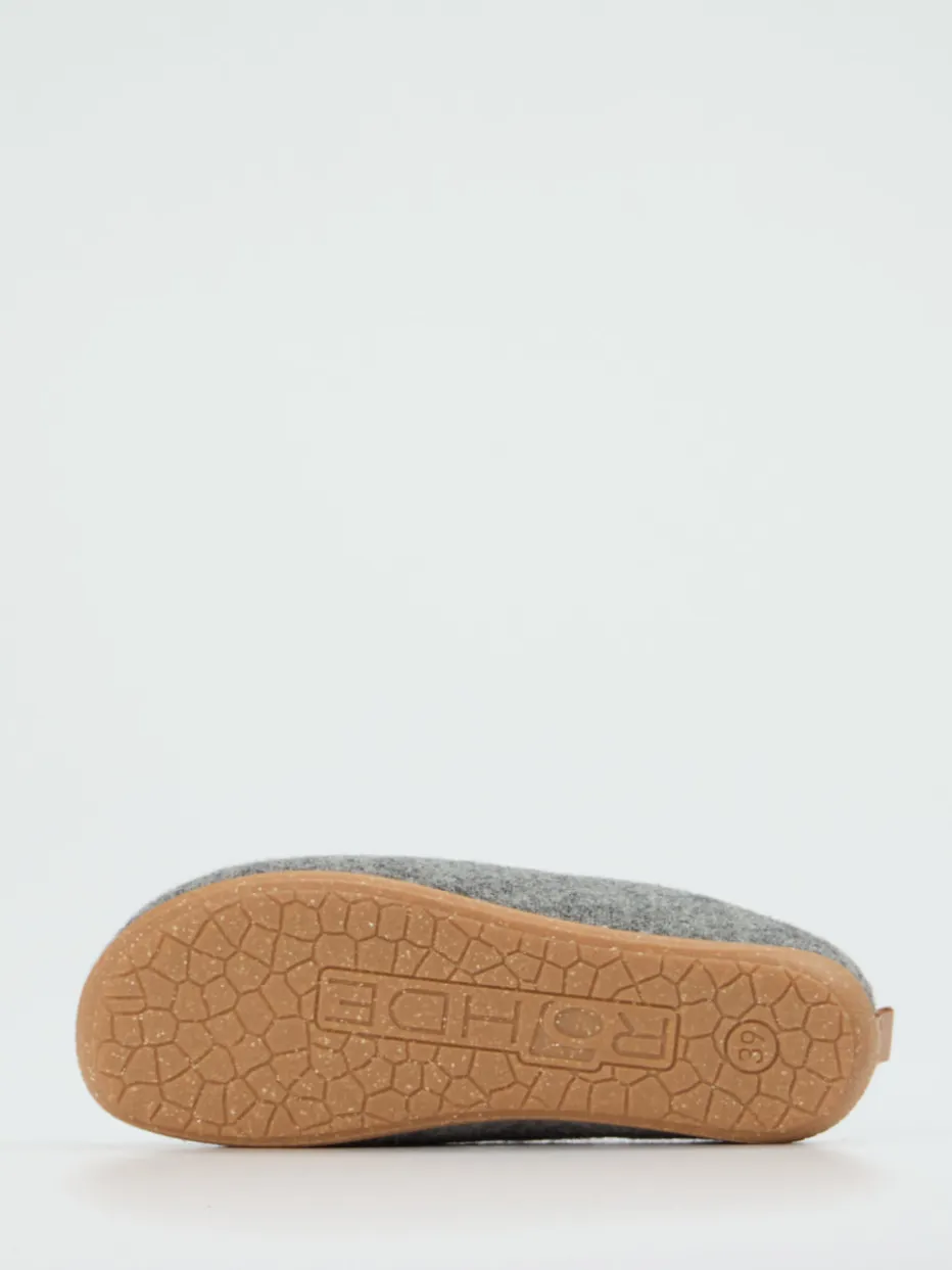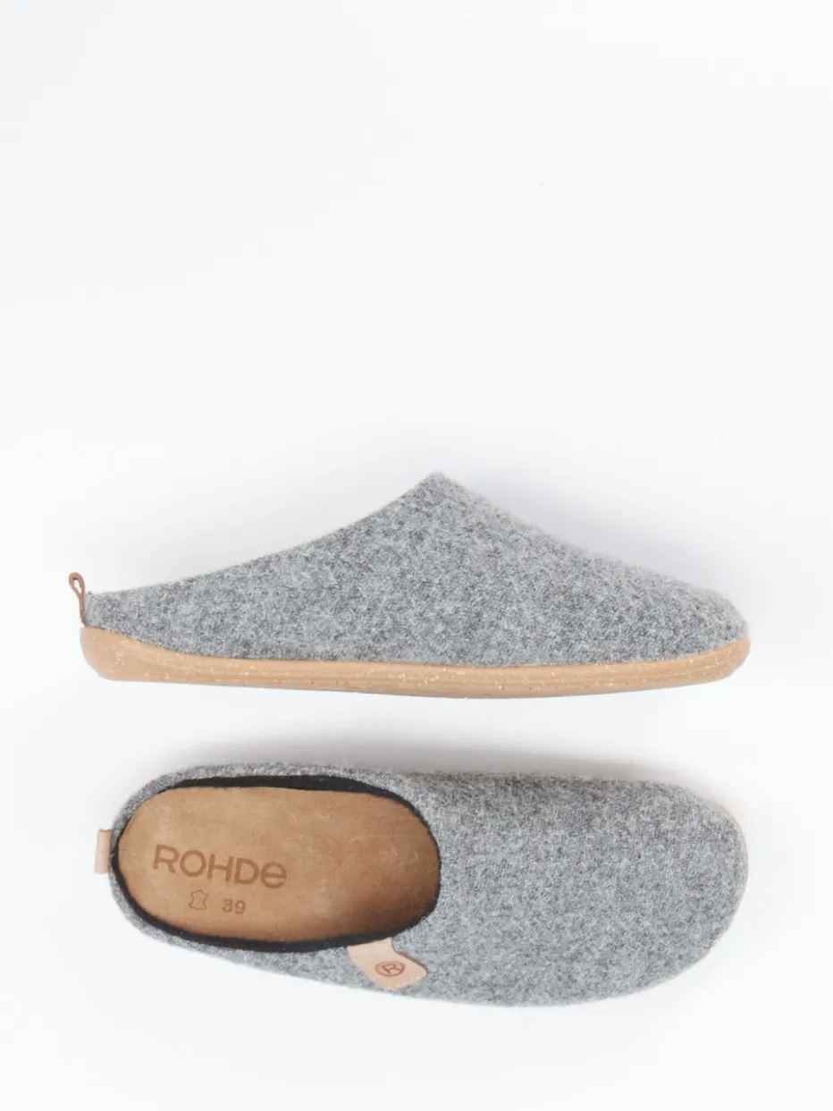 Wohliger Komfort trifft auf minimalistisches Design.Rohde präsentiert mit diesen Filzpantoffeln einen zeitlosen Unisex-Hausschuh. Ideal für entspannte Momente im Wohnbereich: Der Filz aus reiner Wolle wirkt klimaregulierend und fühlt sich durch die filzige Oberfläche angenehm weich an. In Mittelgrau gehalten, ergänzt durch naturbeige Details und einem geprägten Lederpatch, zeigt das Modell skandinavisch inspirierte Schlichtheit. Die offene Schlupfform erleichtert das Anziehen und wird durch eine rutschhemmende Gummisohle in Korkoptik ergänzt. Die breite Silhouette sowie das herausnehmbare Lederfußbett bieten hohen Tragekomfort. Passt optimal zu Loungewear oder Casual-Wollsocken. Rohde vereint traditionelle Handwerksqualität mit nachhaltigem Designanspruch für modernen Wohnkomfort.
