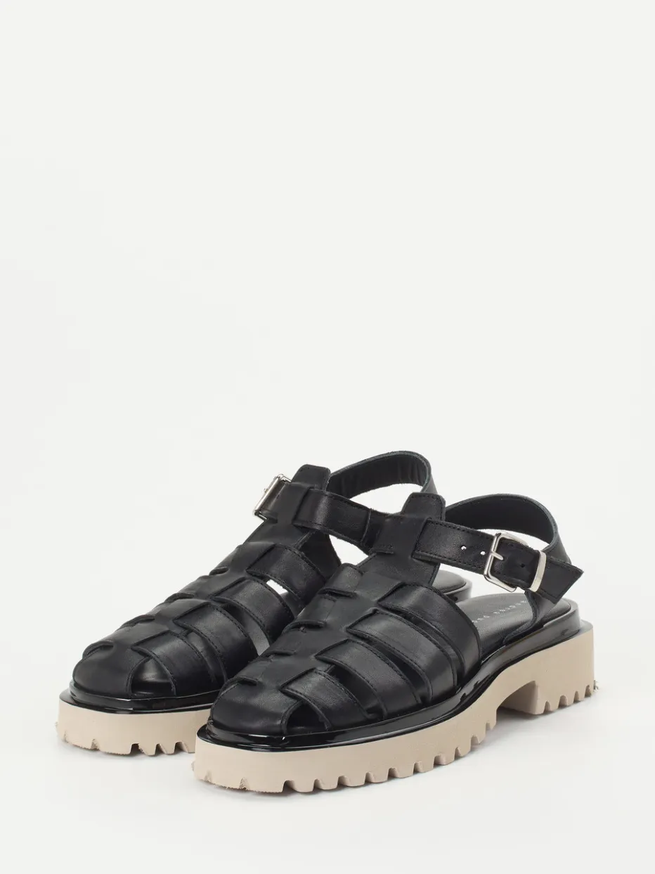 Kontrastreiche Silhouette trifft Komfort.Andrea Puccini präsentiert mit diesen Fisherman-Sandalen ein modernes Update klassischer Formen. Ideal für den sommerlichen Stadtbummel vereinen sie weiches, schwarzes Lammleder mit glänzender Oberfläche und eine helle, profilierte Plateausohle aus Leichtzell-Material. Die geschlossene Vorderpartie wird durch offene Seiten- und Fersenbereiche aufgelockert. Eine silberfarbene Schnalle ermöglicht die individuelle Anpassung. Inspiriert von Streetwear und dem Fisherman-Trend Frühjahr/Sommer 2024, überzeugen die Sandalen gleichermaßen in minimalistischen wie trendbetonten Outfits. Ein femininer Sommerklassiker mit souveränem Stilgespür und angenehmem Tragekomfort.